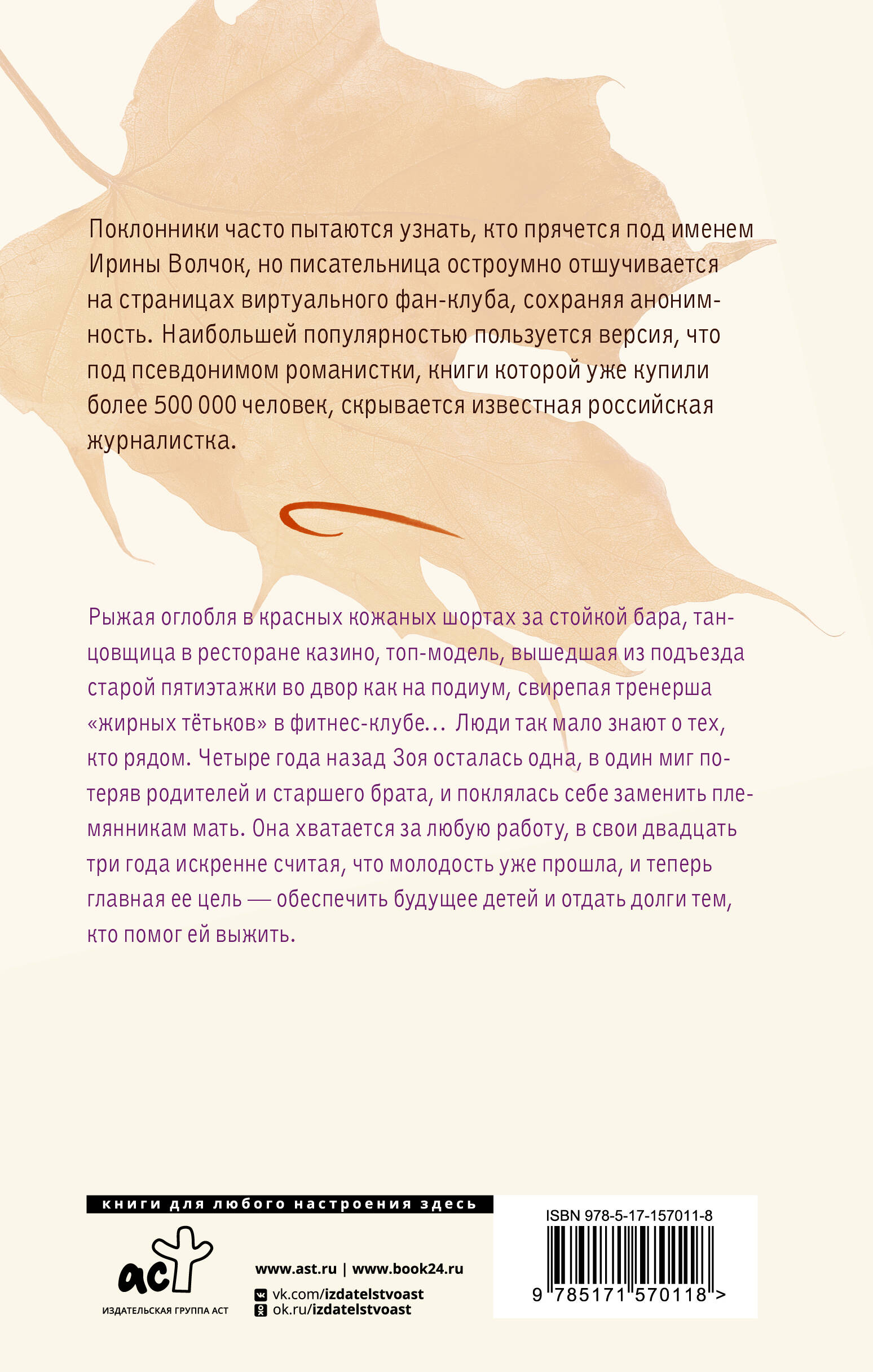 Рыжая оглобля в красных кожаных шортах за стойкой бара, танцовщица в ресторане казино, топ-модель, вышедшая из подъезда старой пятиэтажки во двор как на подиум, свирепая тренерша "жирных тётьков" в фитнес-клубе… Люди так мало знают о тех, кто рядом. Четыре года назад Зоя осталась одна, в один миг потеряв родителей и старшего брата, и поклялась себе заменить племянникам мать. Она хватается за любую работу, в свои двадцать три года искренне считая, что молодость уже прошла, и теперь главная ее цель - обеспечить будущее детей и отдать долги тем, кто помог ей выжить.| Издательство | ИЗДАТЕЛЬСТВО "АСТ" |
