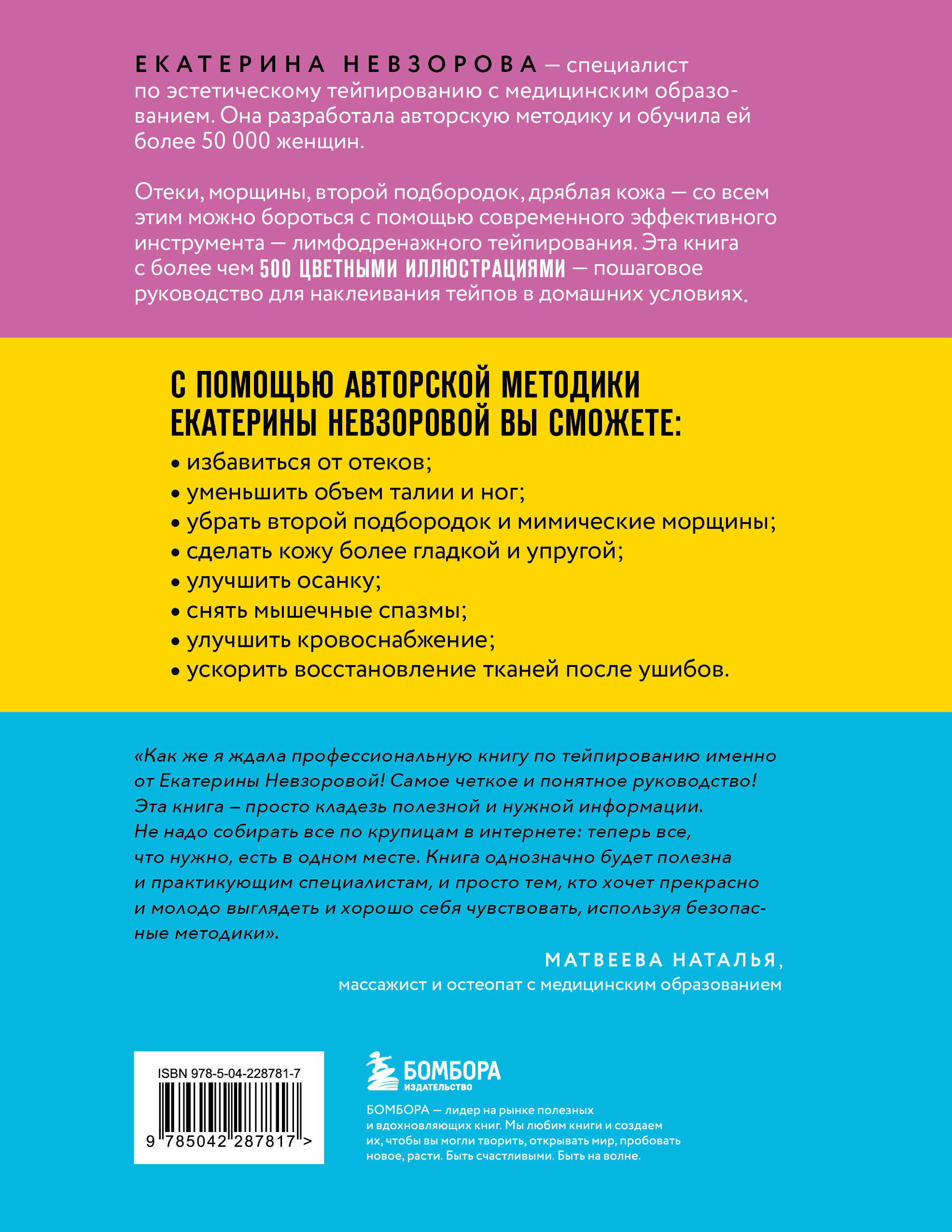 Отеки, морщины, второй подбородок, лишние сантиметры в талии, тяжесть в ногах: все это - естественные процессы, которые с возрастом настигают каждого. Однако от всего этого можно избавиться с помощью уникального современного инструмента - кинезиологического тейпирования! Аппликации помогают мягко и бережно воздействовать на ткани, учитывая физиологию мышц. Об авторе: Екатерина Невзорова - специалист по эстетическому тейпированию с медицинским образованием. Она разработала авторскую методику тейпирования и обучила ей более 50 000 женщин. Что вы сможете сделать благодаря этой методике? • избавиться от отеков; • уменьшить объем талии и ног; • убрать второй подбородок и мимические морщины; • улучшить осанку; • уменьшить вздутие живота и ощущение тяжести; • убрать чувство усталости в ногах; • снять мышечные спазмы; • ускорить восстановление тканей после ушибов; • сделать кожу более гладкой и упругой; • снизить чрезмерную чувствительность кожи; • улучшить кровоснабжение. Внутри книги вы найдете подробные инструкции по использованию тейпов и более 500 наглядных иллюстраций, благодаря которым сможете достичь видимого результата в домашних условиях.| Издательство | ООО "Издательство "Эксмо" |