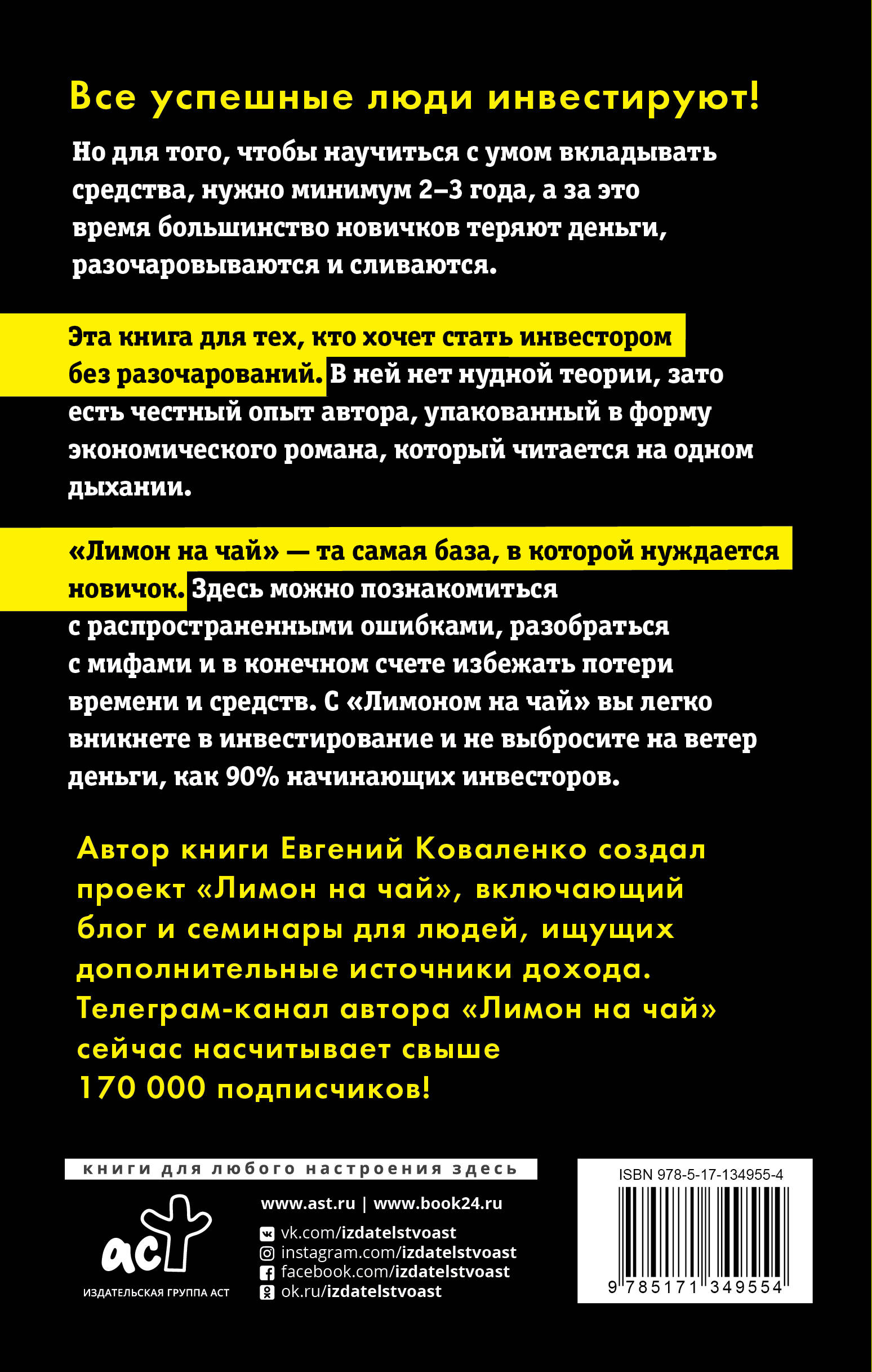 Евгений Коваленко - частный инвестор и автор крупнейшего Телеграм-канала по инвестированию «Лимон на чай». Название произошло от поставленной цели - ежегодный доход в размере одного «лимона» на акциях. Книга знакомит читателей с такими понятиями, как: - Forex-кухня; - ПАММ-счет; - паевой инвестиционный фонд (ПИФ); - ETF. А также отвечает на вопросы: - Реально ли разбогатеть на инвестировании? - Стоит ли покупать биткоины? - В какие компании выгоднее всего вкладываться?| Издательство | ИЗДАТЕЛЬСТВО "АСТ" |