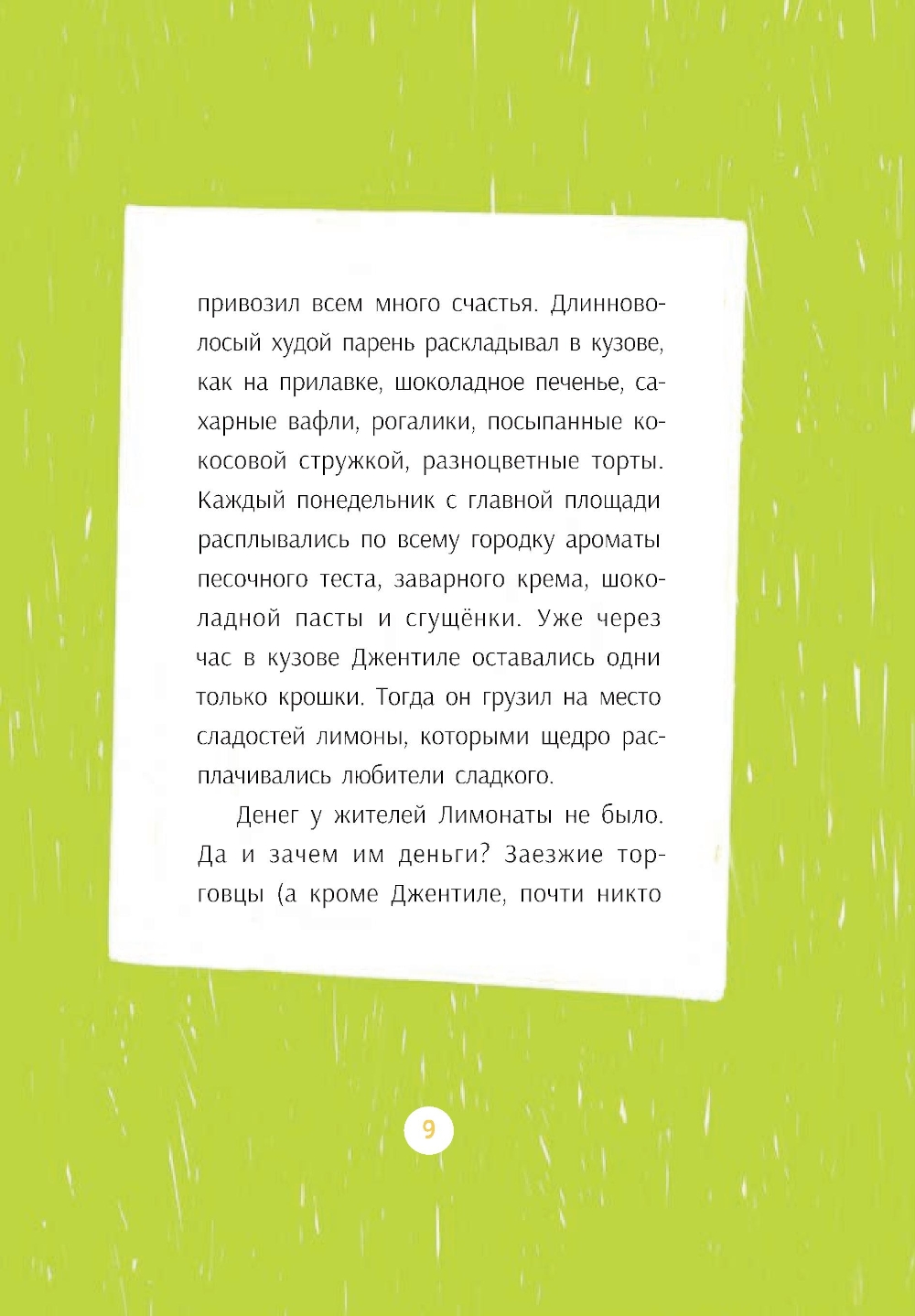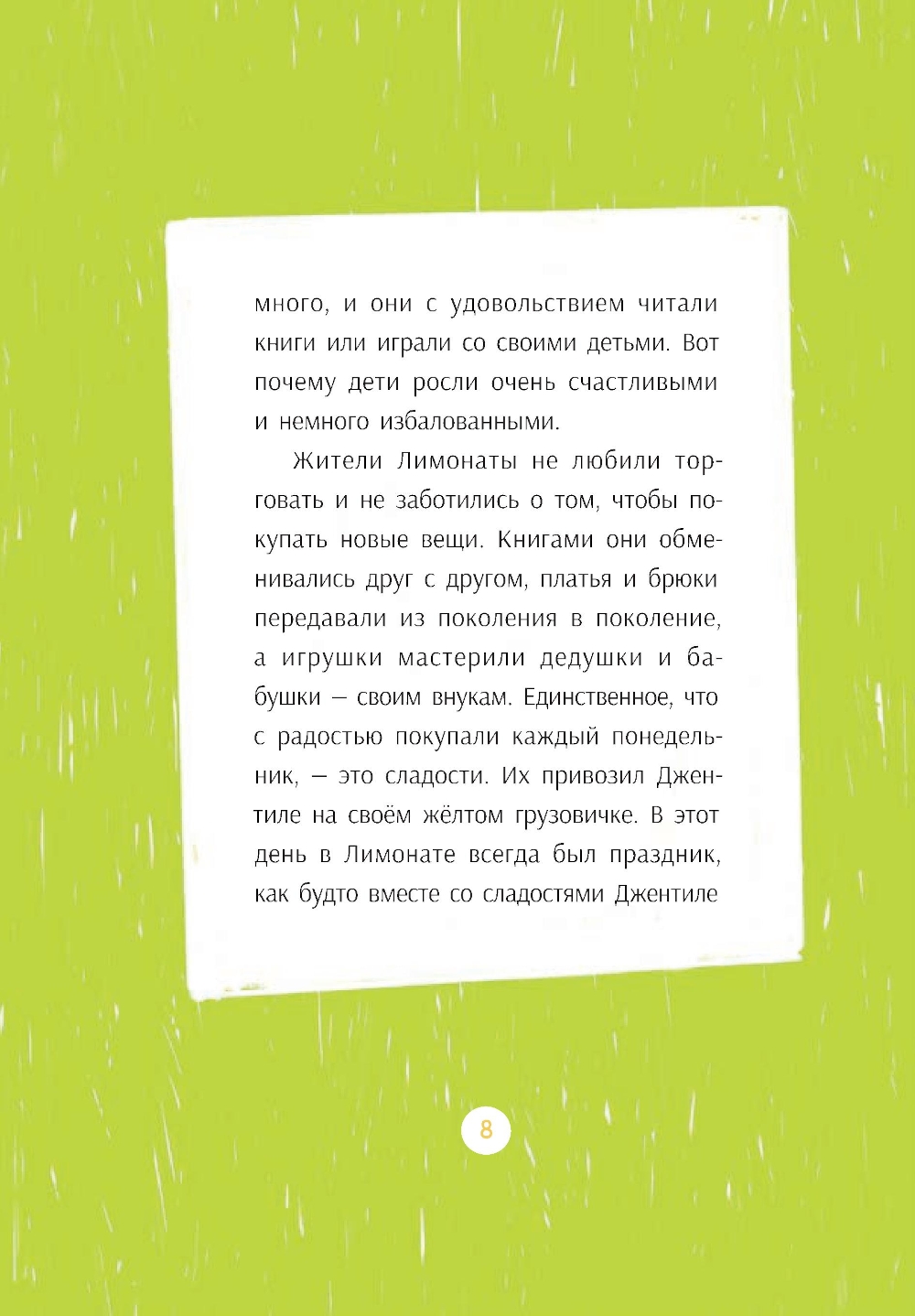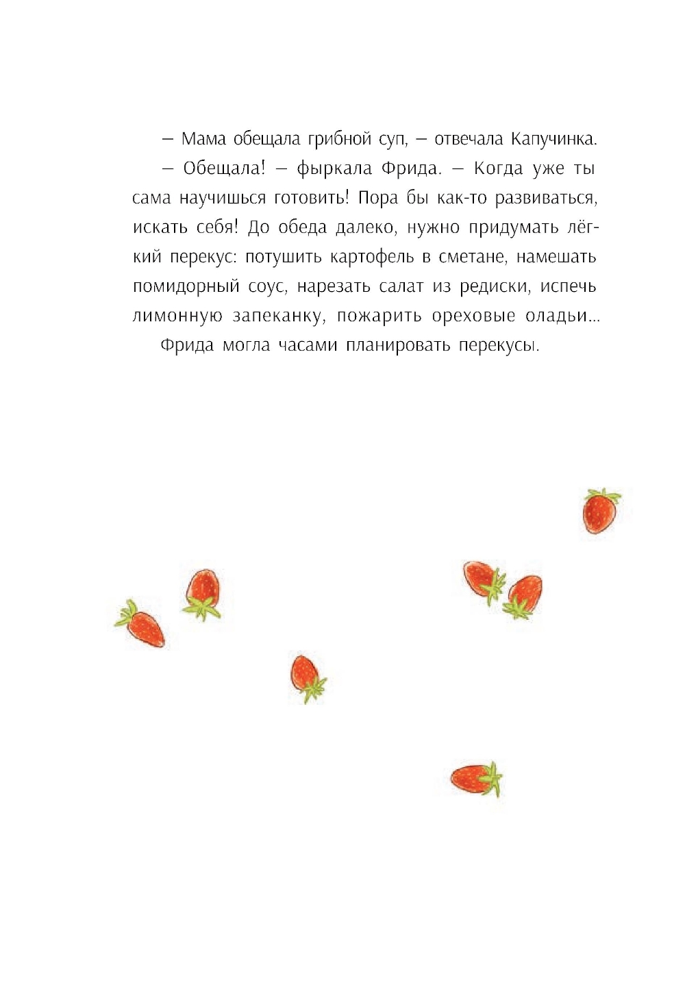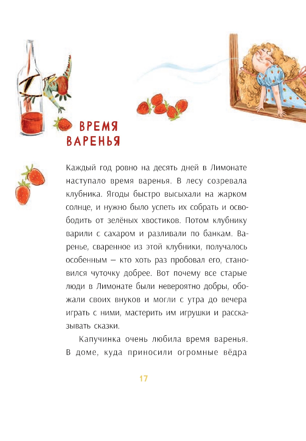 Небольшой южный городок Лимоната славится своими лимонами, которые никогда не портятся. Местные жители ведут безмятежный и размеренный образ жизни: варят варенье из клубники, обмениваются книгами и каждый понедельник покупают сладости, которые привозит Джентиле на своём грузовичке. Но однажды в городе появляется Арабьято. Он торгует морсом из зелёных ягод. Этот морс, по его заверениям, развеселит печальных и придаст сил усталым. Жители Лимонаты пробуют его... и меняются до неузнаваемости. Сладости им больше не нужны, да и от прежнего добродушия ни следа. Не пробовали морса только восьмилетняя Капучинка и её верная подруга ящерица Фрида. Вместе с продавцом сладостей Джентиле они отправляются на поиски противоядия.| Издательство | Пять четвертей |
