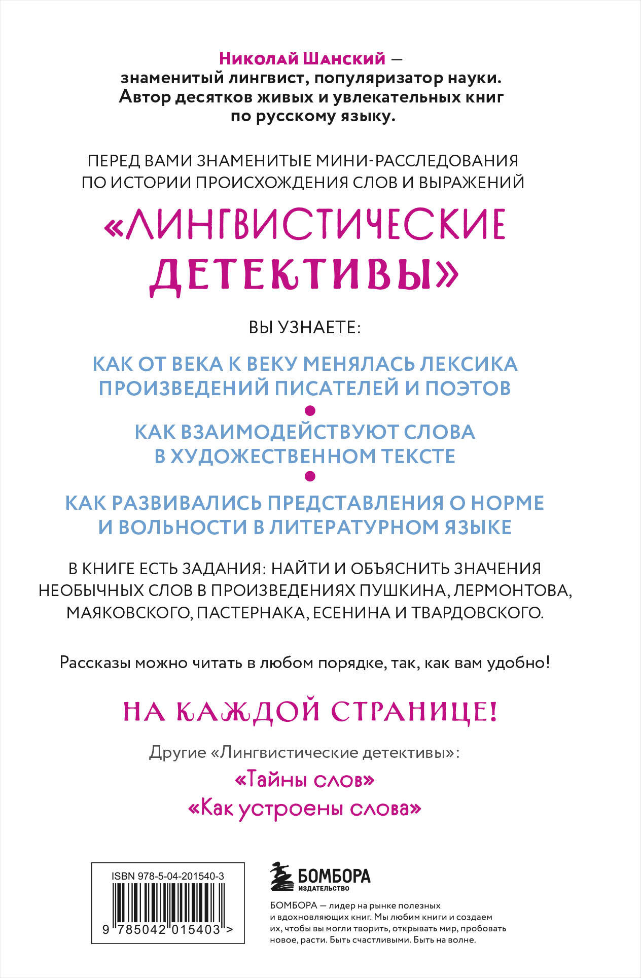 «Как понимать текст» - это увлекательное путешествие по просторам литературных произведений. Известный отечественный лингвист Николай Шанский, автор десятков популярных книг о русском языке в небольших новеллах с примерами из произведений Гоголя, Пушкина, Некрасова, Есенина и Пастернака, знакомит читателей с интересными особенностями нашей художественной классики. Вы узнаете любопытные факты из истории отечественного литературного языка XVIII-XX вв. и современной прозы. Как менялась лексика в произведениях писателей и поэтов? Как взаимодействуют слова в художественном тексте? Как менялось представление о норме и вольности в литературном языке? Вы сможете выполнить интересные задания по поиску и объяснению значений необычных и редких слов в любимых литературных произведениях, а потом проверить себя по прилагаемым ответам.| Издательство | ООО "Издательство "Эксмо" |