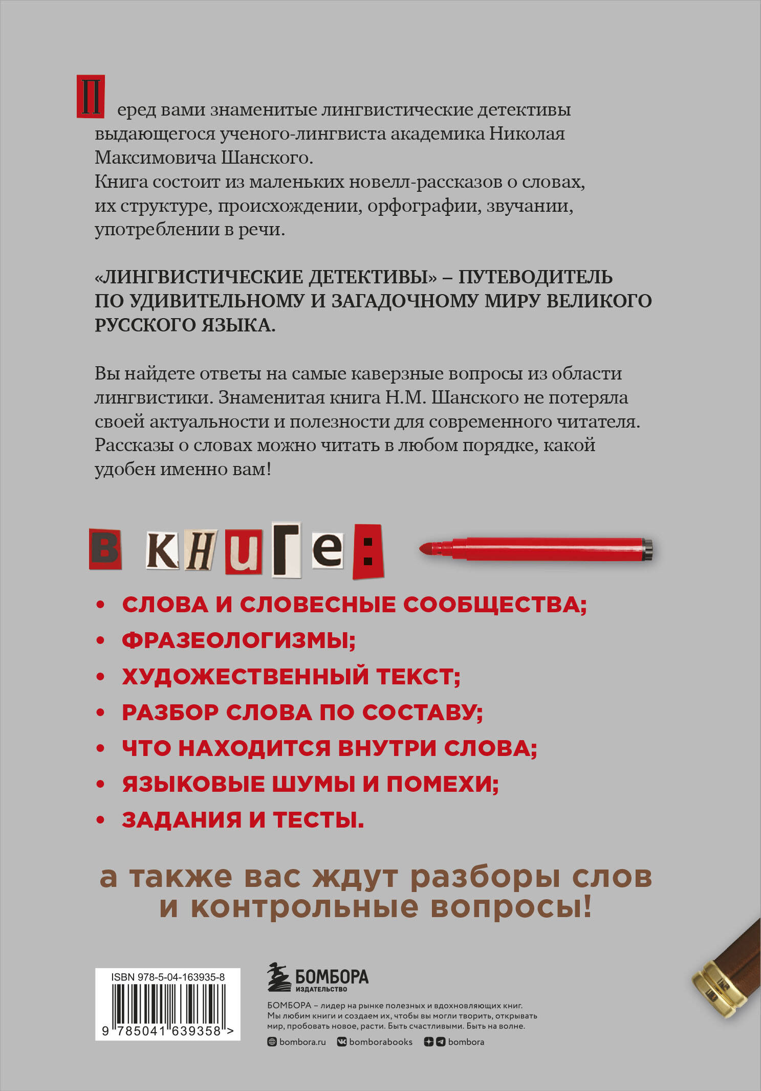 «Лингвистические детективы» - это путеводитель по удивительному и загадочному миру нашего великого языка. Почему что-то или кто-то называется так, а не иначе? Где родилось то или иное слово? Всегда ли оно писалось так, как сейчас? В своей книге автор не только дает развернутые ответы на самые неожиданные вопросы из области лингвистики, но и в увлекательной форме повествует о значении, строении и происхождении слов, оборотов и «трудных строк» из произведений русской классики. Рассказы о словах можно читать в любом порядке, который удобен именно вам! В книге: - слова и словесные сообщества; - фразеологизмы; - художественный текст; - разбор слова по составу; - что находится внутри слова; - языковые шумы и помехи; - задания и тесты.| Издательство | Эксмо |
