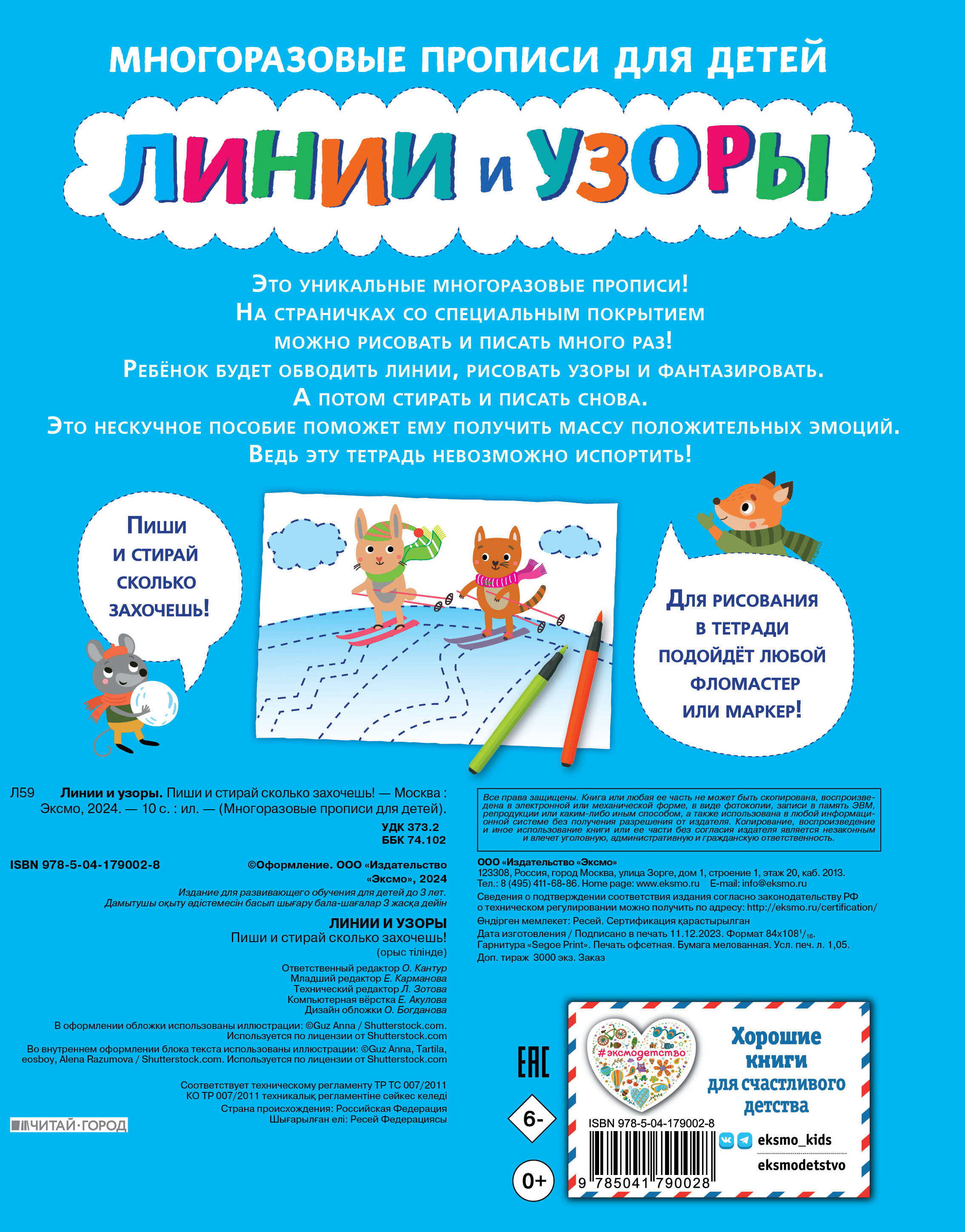 Это уникальные многоразовые прописи! На страничках со специальным покрытием можно рисовать и писать много раз. Ребёнок будет обводить линии, дорисовывать детали, выполнять штриховку, развивая воображение и творческое мышление. А потом стирать и писать снова. Это нескучное пособие поможет ребёнку развить мелкую моторику, координацию движений, подготовить руку к письму и получить массу положительных эмоций. Ведь в этой тетради можно рисовать сколько угодно, не боясь её испортить.| Издательство | ООО "Издательство "Эксмо" |