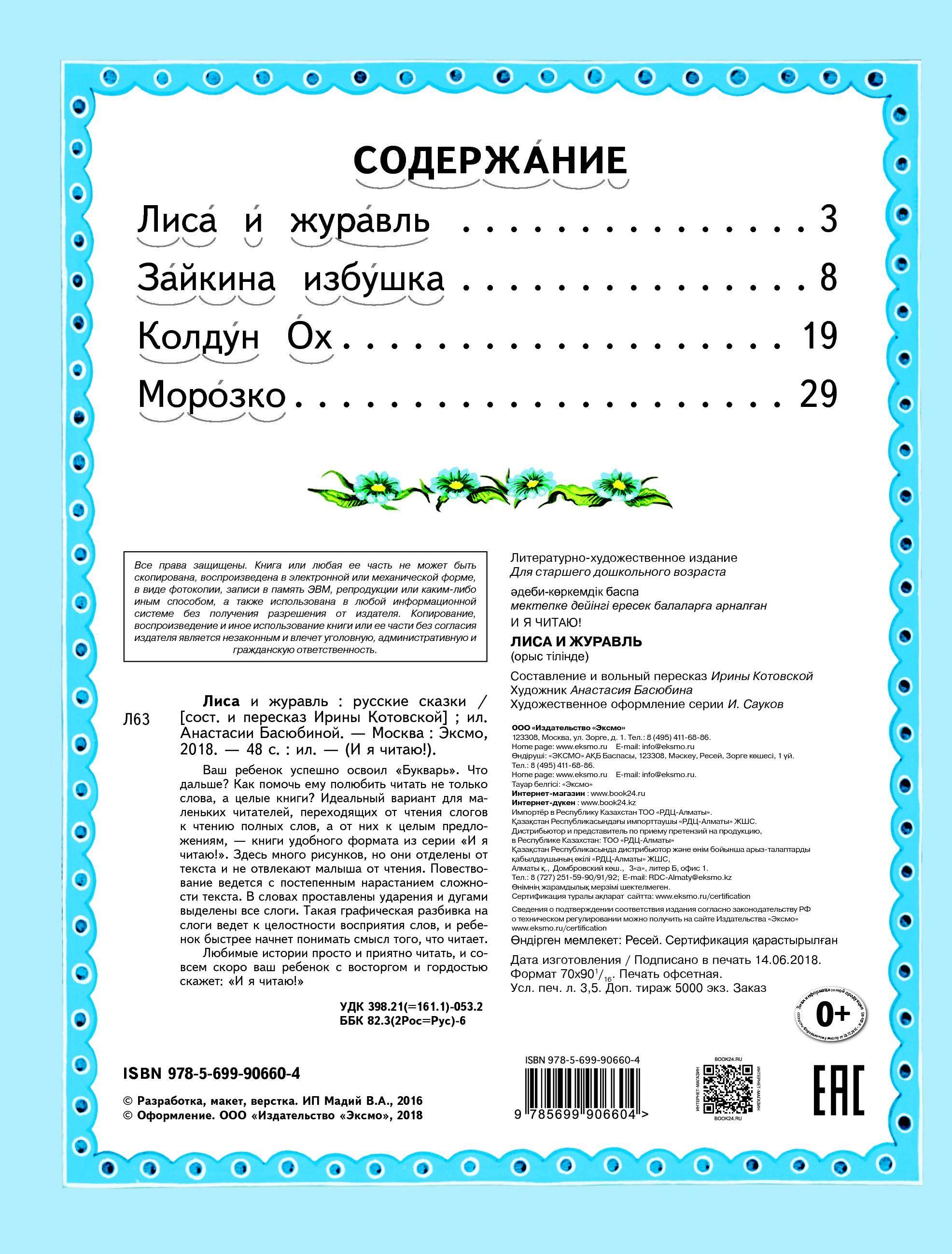 Ваш ребенок успешно освоил «Букварь», что дальше? Как помочь ему полюбить читать не только слова, а целые книги? Идеальный вариант для маленьких читателей, переходящих от чтения слогов к чтению полных слов, а от них к целым предложениям, - книги удобного формата из серии «И я читаю». Здесь много рисунков, но они отделены от текста и не отвлекают малыша от чтения. Повествование ведется с постепенным нарастанием сложности текста. В словах проставлены ударения и дугами выделены все слоги. Такая графическая разбивка на слоги ведет к целостности восприятия слов, и ребенок быстрее начнет понимать смысл того, что читает. Любимые истории просто и приятно читать, и совсем скоро ваш ребенок с восторгом и гордостью скажет: «И я читаю!» В небольшую книгу вошли 4 сказки: «Лиса и журавль», «Зайкина избушка», «Колдун Ох», «Морозко». Чтобы ребенок, успешно освоивший Букварь, легко сделал следующие шаги к чтению с удовольствием, ему на помощь спешат книги из серии «И я читаю!». По своему построению и особенностям каждая книга серии представляет собой тренажер по чтению: • Слова разбиты на слоги, которые выделены дугами, что облегчает чтение. • Повествование ведется с постепенным нарастанием сложности текста. • В словах проставлены ударения. • Книгу удобного формата легко носить с собой. • Красочные картинки даны отдельно, они не отвлекают малыша от чтения. • Любимые сказки: в каждой книге серии их четыре. В серию входят книги со сказками: «Ведьма и Солнцева сестра», «Волк и семеро козлят», «Волшебная дудочка», «Елена Премудрая», «Крошечка-Хаврошечка», «Поди туда - не знаю куда», «Сивка-Бурка», «Скатерть-самобранка».| Издательство | ООО "Издательство "Эксмо" |