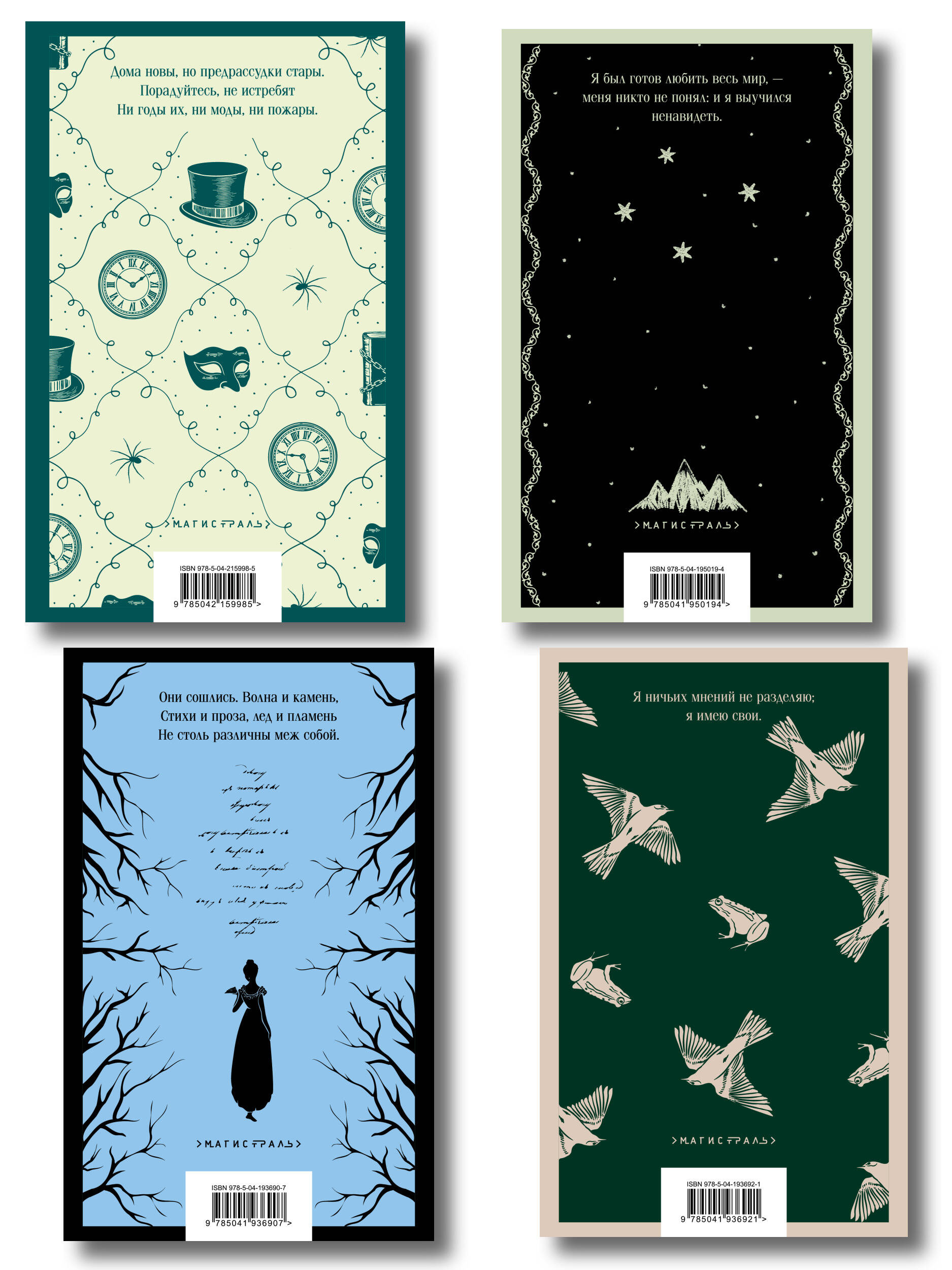 НАБОР ИЗ 4-Х КНИГ В СЕРИИ «МАГИСТРАЛЬ. ГЛАВНЫЙ ТРЕНД»: - «Горе от ума» А.С. Грибоедова; - «Евгений Онегин» А.С. Пушкина; - «Герой нашего времени» М.Ю. Лермонтова; - «Отцы и дети» И.С. Тургенева. «Горе от ума» Молодой дворянин Александр Чацкий возвращается из-за границы к своей возлюбленной Софье Фамусовой. Столичное общество разочаровывает героя, в каждом человеке он видит пороки: глупость, жадность, невежество. Остроумные монологи Чацкого разлетаются на цитаты («Служить бы рад, прислуживаться тошно!» ), а любовь к Софье превращается в горькое разочарование. Но кто здесь действительно безумец - идеалист Чацкий или общество, живущее по законам лжи и чинопочитания? В книгу вошли и другие пьесы Александра Грибоедова (1795-1829): «Молодые супруги», «Студент», «Притворная неверность», а также критическая статья Ивана Гончарова «Мильон терзаний». «Евгений Онегин» Культовый роман в стихах «Евгений Онегин» - это энциклопедия пушкинской эпохи, наполненная фразеологизмами, цитатами, намеками и аллюзиями, выискивать которые - настоящее удовольствие для читателя. Главный герой - щеголь и повеса, которому к двадцати шести годам успевают наскучить шумные балы и городская суета, получает в наследство от покойного дяди поместье и состояние и поселяется в деревенской глуши. Здесь он мгновенно становится предметом для сплетен и пересудов. А его высокомерие больно ранит влюбленную в него Татьяну Ларину. «Герой нашего времени» Русский классик Михаил Юрьевич Лермонтов продолжает тему лишнего человека, начатую еще Пушкиным. Харизматичный красавец Григорий Печорин разочарован в жизни. Светская жизнь развратила его, удовольствия от простых человеческих радостей уже нет. Герой пытается наполнить свое существование хоть каким-то смыслом. Но от этих попыток страдает его окружение. Любовь к черкешенке Бэле - разрушает ее семью. Вмешательство в жизнь тихой станицы - производит переполох. Нежелание общаться со старым другом - наносит тому тяжелую душевную рану. Всё, чего бы ни коснулся Печорин, оказывается разбитым. Он и сам осознаёт это и страдает еще больше. Прочитав роман, вы увидите, как пороки общества могут разрушать личность человека. Книга снабжена статьей с разбором романа от знаменитого критика Виссариона Белинского (1840 г.). «Отцы и дети» Иван Сергеевич Тургенев (1818-1883) - удивительный, очень русский писатель, чей талант был признан и соотечественниками, и великими европейскими поэтами и прозаиками. «Острый и тонкий наблюдатель, точный до мелочей, он рисует своих героев как поэт и живописец. Ему одинаково интересны как их страсти, так и черты их лица… С большим искусством живописует он физическую и моральную сторону явлений, создавая реальные картины действительности…» - написал Проспер Мериме, автор «Кармен». Эта книга представляет важнейшие грани творчества И. С. Тургенева. В нее включены роман «Отцы и дети», повести и стихотворения в прозе. «Вся моя повесть направлена против дворянства как передового класса. Вглядитесь в лица Николая Петровича, Павла Петровича, Аркадия. Слабость и вялость или ограниченность», - так Тургенев разъясняет замысел своего романа. Причем берет он «именно хороших представителей дворянства», показывая: «Если сливки плохи, что же молоко?» Евгений Базаров - главный герой, нигилист и разночинец, выступающий против как либерал
