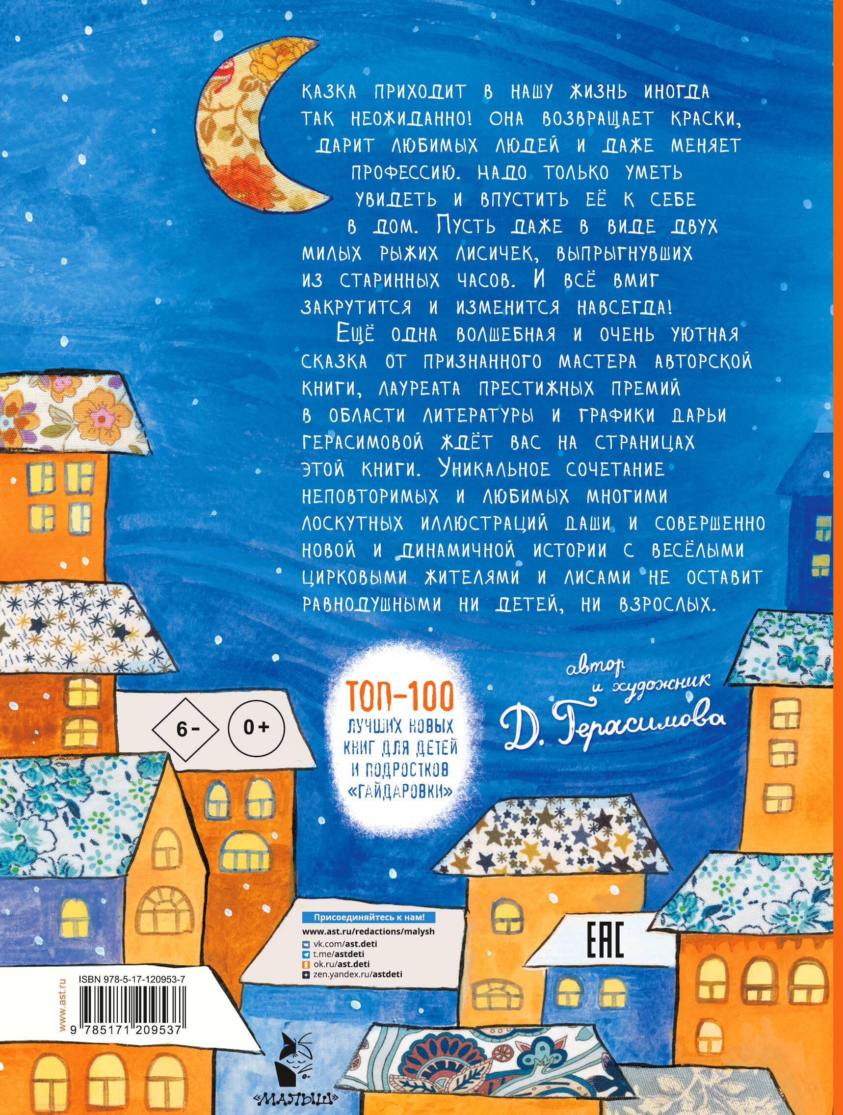 Как найти сказку в обычный зимний день? Иногда для этого достаточно просто заглянуть в старинные часы и поверить в чудеса! Волшебная и очень уютная сказка от мастера авторской книги, лауреата престижных премий в области литературы и графики Дарьи Герасимовой ждёт вас на страницах этой книги. Уникальное сочетание неповторимых и любимых многими лоскутных иллюстраций Даши и совершенно новой и динамичной истории с весёлыми цирковыми жителями и лисами не оставит равнодушными ни детей, ни взрослых. Открывайте книгу и погружайтесь в веселое цирковое волшебство! Топ-100 лучших новых книг для детей и подростков «Гайдаровки»