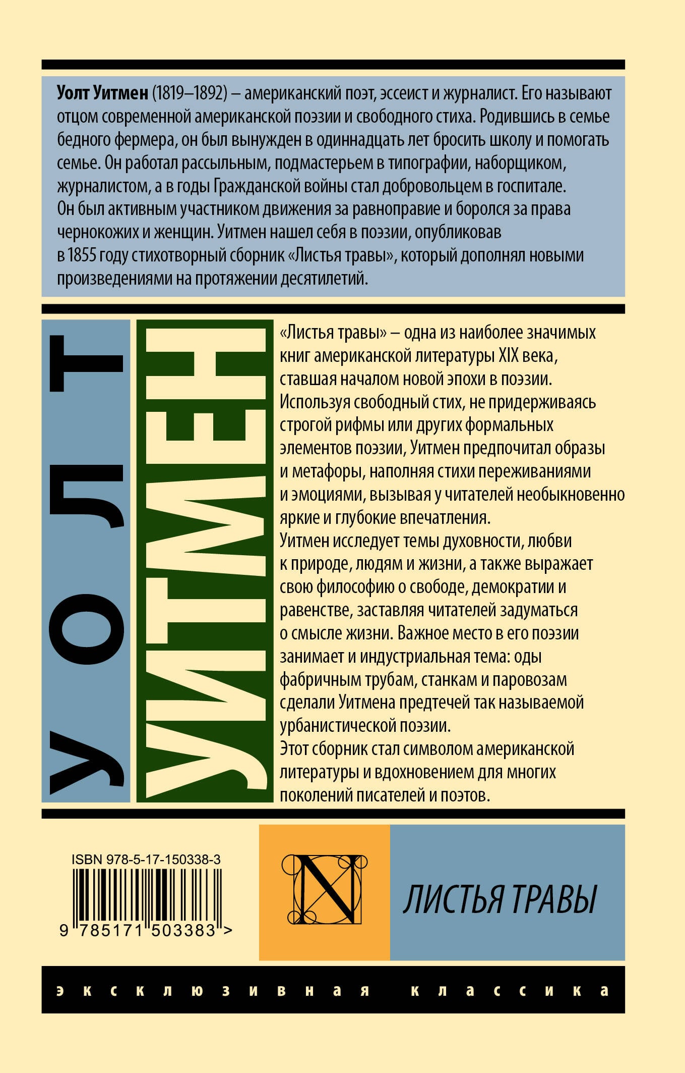 Главный сборник стихов Уолта Уитмена - выдающегося американского классика девятнадцатого века и прародителя свободного стиха и гуманиста. Уитмен дополнял и переиздавал сборник на протяжении всей жизни. В классических переводах настоящих мастеров слова: Корнея Чуковского, Самуила Маршака и Михаила Зенкевича.| Издательство | ИЗДАТЕЛЬСТВО "АСТ" |