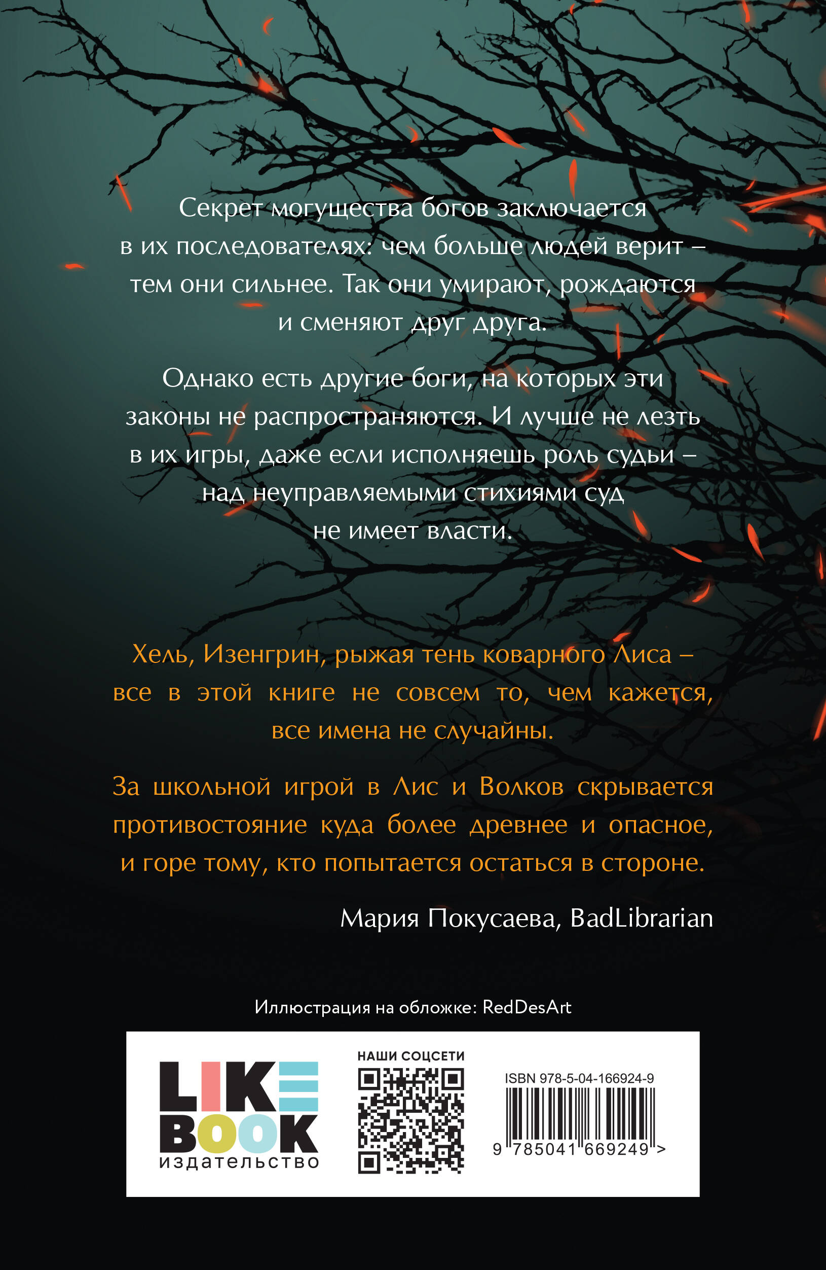 «Лисы и Волки» - мощное городское фэнтези в мрачных декорациях провинциального российского городка. Притягательная, мистическая атмосфера, необычная школа, яркие архетипичные герои, каждому из которых придется сделать нелегкий выбор и сражаться насмерть за своего бога. Секрет могущества богов заключается в их последователях: чем больше людей верит - тем они сильнее. Так они умирают, рождаются и сменяют друг друга. Однако есть другие боги, на которых эти законы не распространяются. И лучше не лезть в их игры, даже если исполняешь роль судьи - над неуправляемыми стихиями суд не имеет власти. Лиза Белоусова - начинающий перспективный автор, культуролог, в творчестве Лизы можно встретить огромное количество отсылок к мифологиям разных народов.| Издательство | ООО "Издательство "Эксмо" |