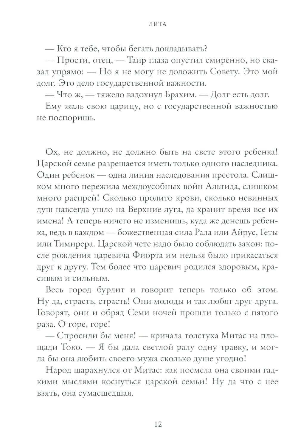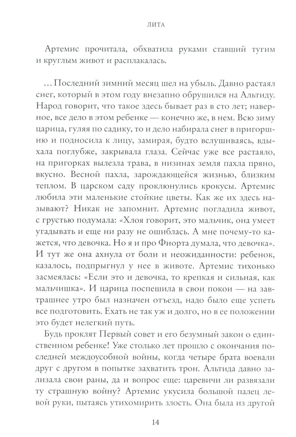 Золотая Альтида устроена свободно и радостно, здесь браки даже самых знатных особ заключаются по любви. Правда, царской семье разрешается иметь только одного наследника. И у царя нет власти, чтобы оспорить этот закон. Даже если он предписывает навсегда расстаться с супругой - отослать ее вместе с нерожденным ребенком в самый дальний храм. Ах, если бы отыскать в этом мире озеро Тун, оставляющее шрамы! Но откуда ты знаешь о нем, царица Артемис?.. Лита - дочь непослушных родителей. Она живет в лесу, умеет слышать ветер и всегда знает, если кому-то рядом нужна ее особая помощь. Кажется, сама природа избрала девочку в проводницы жизни - но что, если однажды жизнь потребует войны и смерти? Повесть о Лите -- пятая в фэнтези-цикле «Семь прях» Тамары Михеевой. В этих книгах мастерство писательницы раскрывается по-новому, а сказки обретают особую глубину и притчевость. С ними можно знакомиться в любом порядке, одну за одной узнавая истории девочек, которые должны сделать свой выбор - разрушать или хранить миры.| Издательство | Абрикобукс |