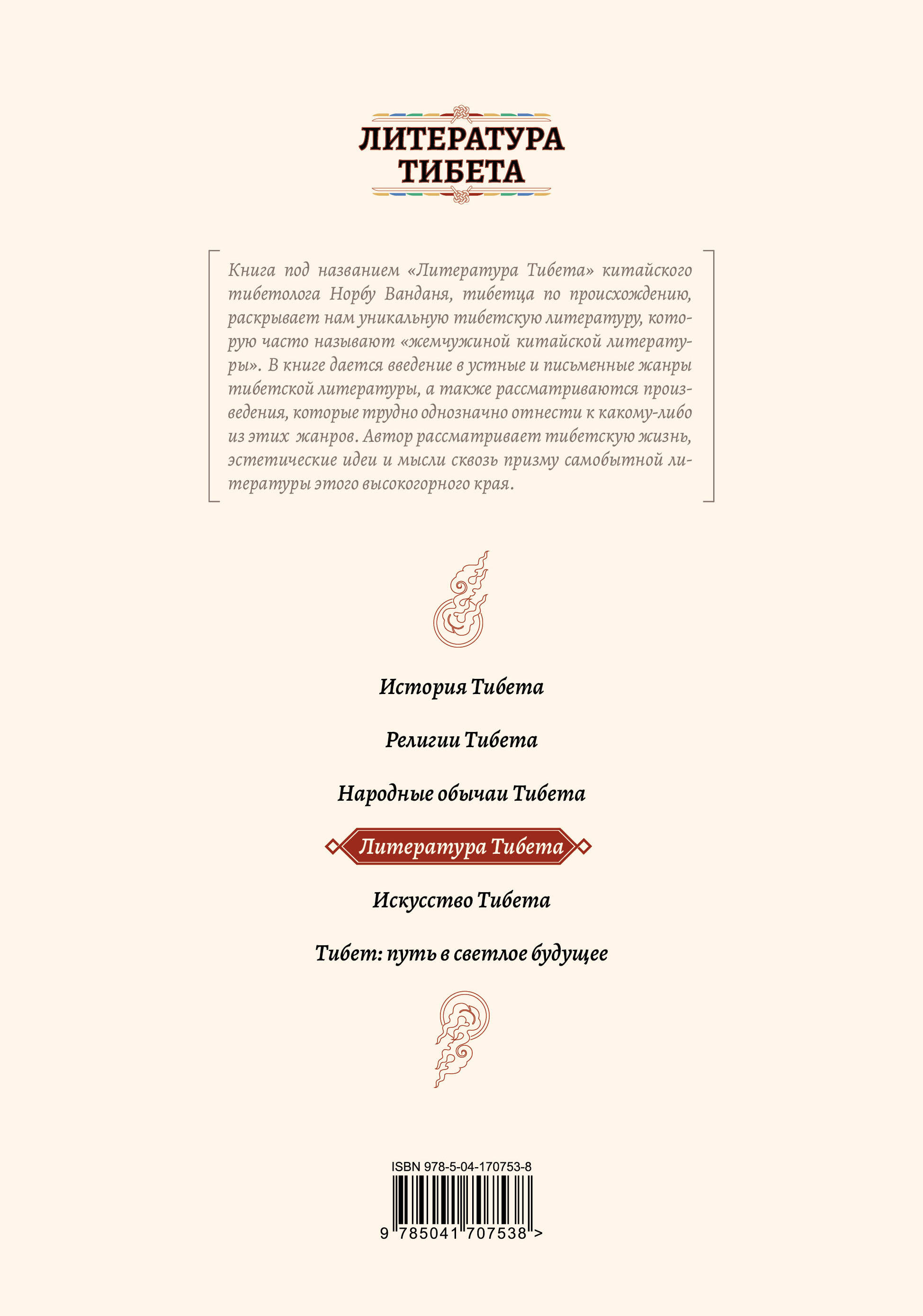 Тибетская литература, отделенная от китайской и уникальная в своем роде, представлена многообразием устных и письменных жанров. Исследователь Норбу Вандань в своей книге рассказывает как о традиционных тибетских произведениях, так и о тех, что нельзя отнести к какому-либо жанру. Если вы интересуетесь Востоком, данное издание порадует вас необычным авторским взглядом на литературу и эстетику Тибета. Тэги: восточная культура, искусство Китая, традиции Китая, китайская литература, тибетология.| Издательство | ООО "Издательство "Эксмо" |