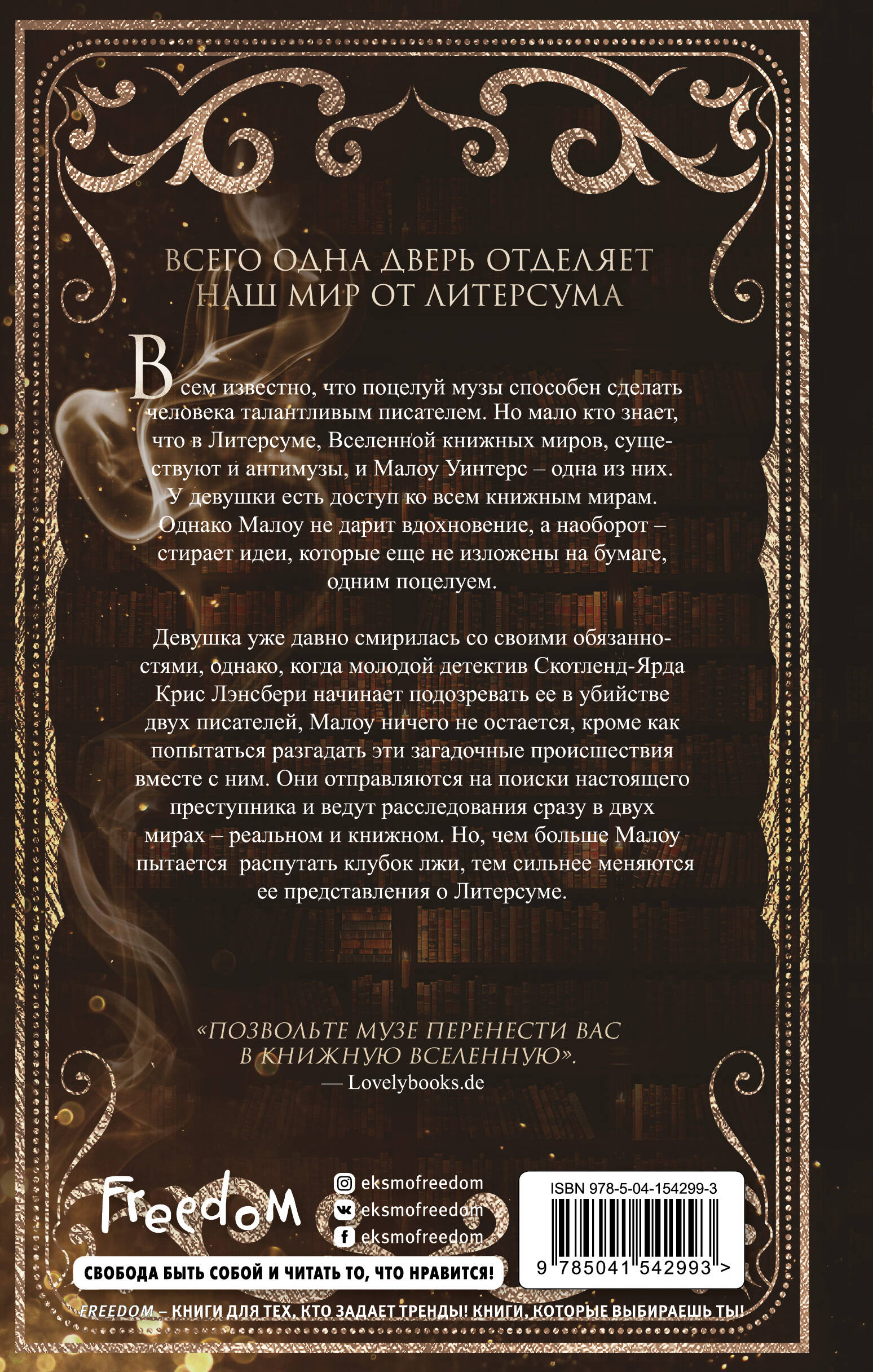 Всем известно, что поцелуй музы способен сделать человека талантливым писателем. Но мало кто знает, что в Литерсуме, Вселенной книжных миров, существуют и антимузы, и Малоу Уинтерс - одна из них. У девушки есть доступ ко всем книжным мирам. Однако Малоу не дарит вдохновение, а, наоборот, стирает идеи, которые еще не изложены на бумаге, одним поцелуем. Девушка уже давно смирилась со своими обязанностями, однако, когда молодой детектив Скотланд-Ярда Крис Лэнсбери начинает подозревать ее в убийстве двух писателей, Малоу ничего не остается, кроме как попытаться разгадать эти загадочные происшествия вместе с ним. Они отправляются на поиски настоящего преступника и ведут расследования сразу в двух мирах - реальном и книжном. Но чем больше Малоу пытается распутать клубок лжи, тем сильнее меняются ее представления о Литерсуме. Литерсум - Вселенная книжных миров. Перед вами первая часть трилогии о музах и анти-музах, которые управляют Литерсумом. Фантастические истории, исторические романы, детективы, романтические истории - все они существуют в Литерсуме. Малоу Уинтерс - анти-муза, а значит, вместо того чтобы вдохновлять, ее цель - находить идеи, которые не были изложены на бумаге, и стирать их одним поцелуем. «Позвольте музам перенести вас в бесконечный мир книг». - Lovelybooks.de Для всех поклонников атмосферного романа Лин Рины «Книжные хроники Анимант Крамб»! Атмосфера Лондона, библиотеки, книжные миры, магия и любовь.| Издательство | ООО "Издательство "Эксмо" |