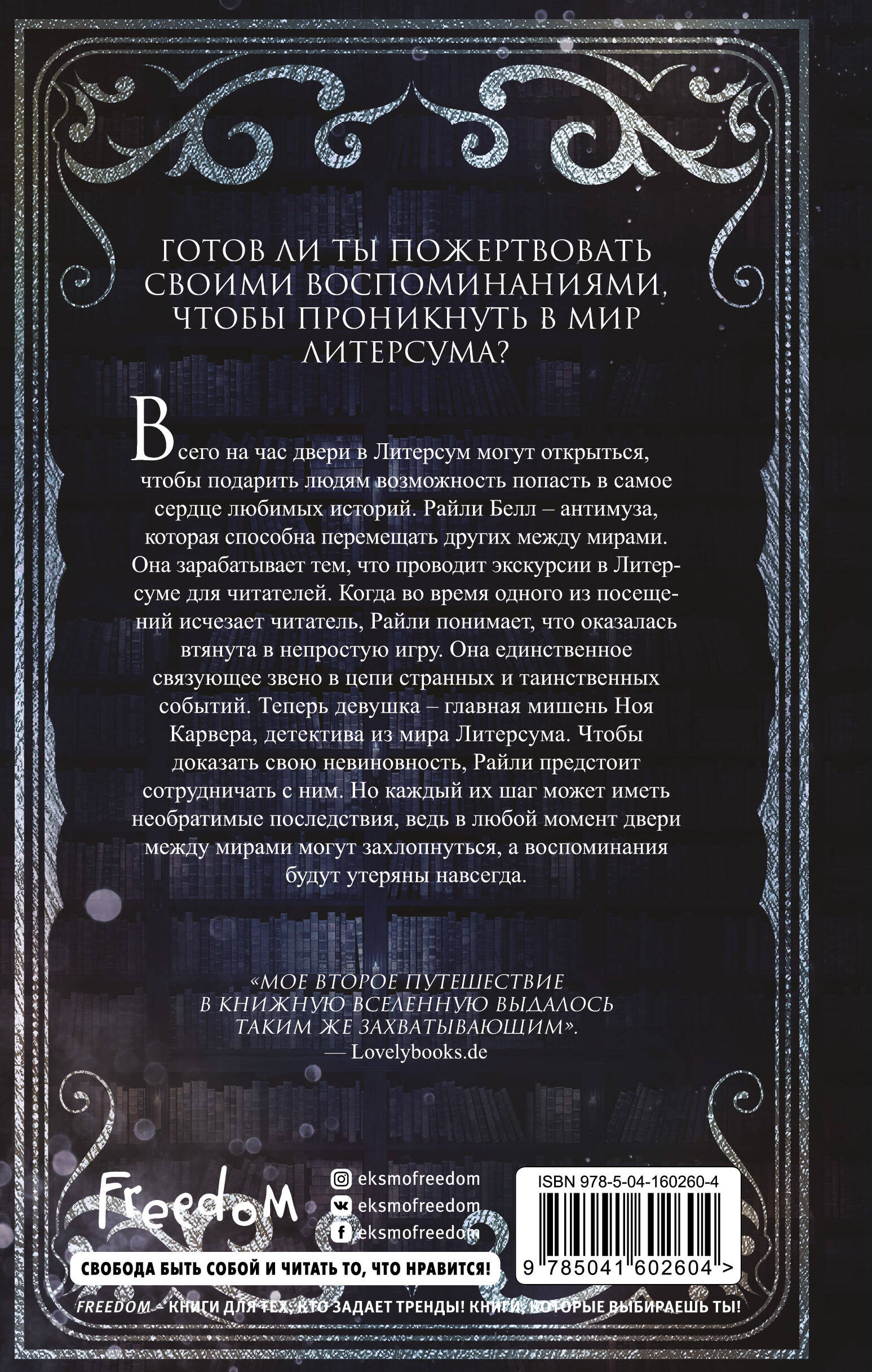 Вторая часть трилогии о музах и анти-музах, которые управляют Литерсумом. Райли Белл - юная анти-муза, которая проводит экскурсии для блогеров и читателей по миру Литерсума. Они думали, что очутились в зале книжного магазина, который был оформлен в стиле популярного бестселлера. Но на самом деле они находились в Литерсуме, в самом сердце их любимой истории. Когда после очередной экскурсии в мир магии один из блогеров исчезает, Райли оказывается единственным связующим звеном в цепи странных и таинственных событий. Двери в мир Литерсума вновь приоткроются для вас. Это история Райли - девушки, которая способна переносить людей из реального мира в книжный. Готовы ли вы довериться ей и ненадолго проникнуть в книжную вселенную? Однако будьте осторожны, ведь в любой момент двери между мирами захлопнутся, а ваши воспоминания будут утеряны навсегда. Всего на час двери в Литерсум могут открыться, чтобы подарить людям возможность попасть в самое сердце любимых историй. Райли Белл - анти-муза, которая способна перемещать других между мирами. Она зарабатывает тем, что проводит экскурсии в Литерсуме для читателей. Когда во время одного из посещений исчезает читатель, Райли понимает, что оказывается втянута в непростую игру. Она - единственное связующее звено в цепи странных и таинственных событий. Теперь девушка главная мишень Ноя Карвера - детектива из мира Литерсума. Чтобы доказать свою невиновность, Райли предстоит сотрудничать с ним. Но каждый их шаг может иметь необратимые последствия, ведь в любой момент двери между мирами могут захлопнуться, а воспоминания будут утеряны навсегда.| Издательство | ООО "Издательство "Эксмо" |