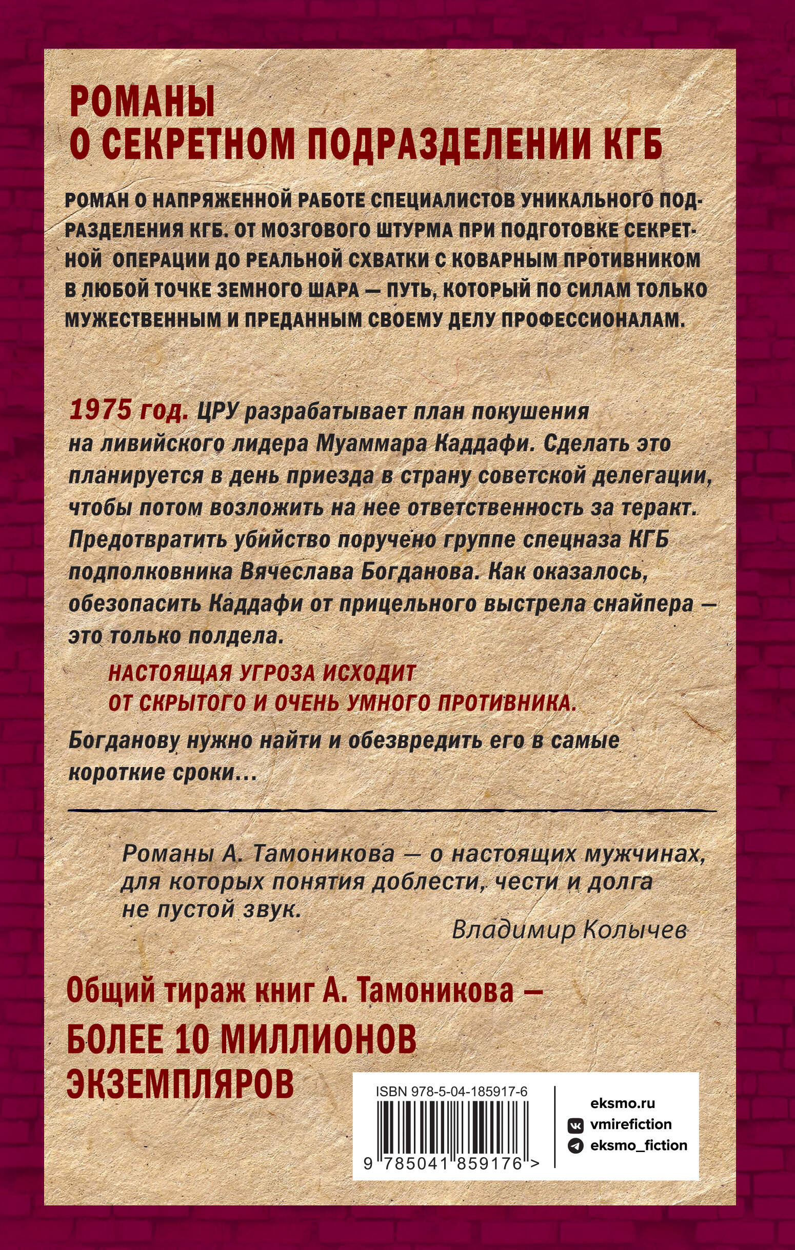 Роман о напряженной работе специалистов уникального подразделения КГБ. От мозгового штурма при подготовке секретной операции до реальной схватки с коварным противником в любой точке земного шара - путь, который по силам только мужественным и преданным своему делу профессионалам. 1975 год. ЦРУ разрабатывает план покушения на ливийского лидера Муаммара Каддафи. Сделать это планируется в день приезда в страну советской делегации, чтобы потом возложить на нее ответственность за теракт. Предотвратить убийство поручено группе спецназа КГБ подполковника Вячеслава Богданова. Как оказалось, обезопасить Каддафи от прицельного выстрела снайпера - это только полдела. Настоящая угроза исходит от скрытого и очень умного противника. Богданову нужно найти и обезвредить его в самые короткие сроки… «Романы А. Тамоникова - о настоящих мужчинах, для которых понятия доблести, чести и долга - не пустой звук». - В. Колычев Общий тираж книг А. Тамоникова - более 10 миллионов экземпляров| Издательство | ООО "Издательство "Эксмо" |
