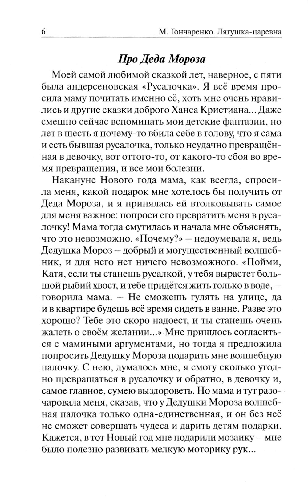 На долю героини повести Марины Гончаренко «Лягушка-царевна» девочки Кати выпало много боли и страданий. Но жертвенная, безграничная любовь матери, воля и целеустремленность героини помогают ей разорвать болезненный круг обречённости, начать духовное восхождение и, главное, поверить в справедливость Промысла Божьего. Повесть и рассказы данного сборника отличают стройная композиция, умело подобранная интонация повествования, увлекательный сюжет. Их герои учатся любви друг к другу, умению прощать, даже когда это очень тяжело, совершают нравственный выбор и превозмогают, казалось бы, непреодолимые препятствия.| Издательство | Зерна-Слово |