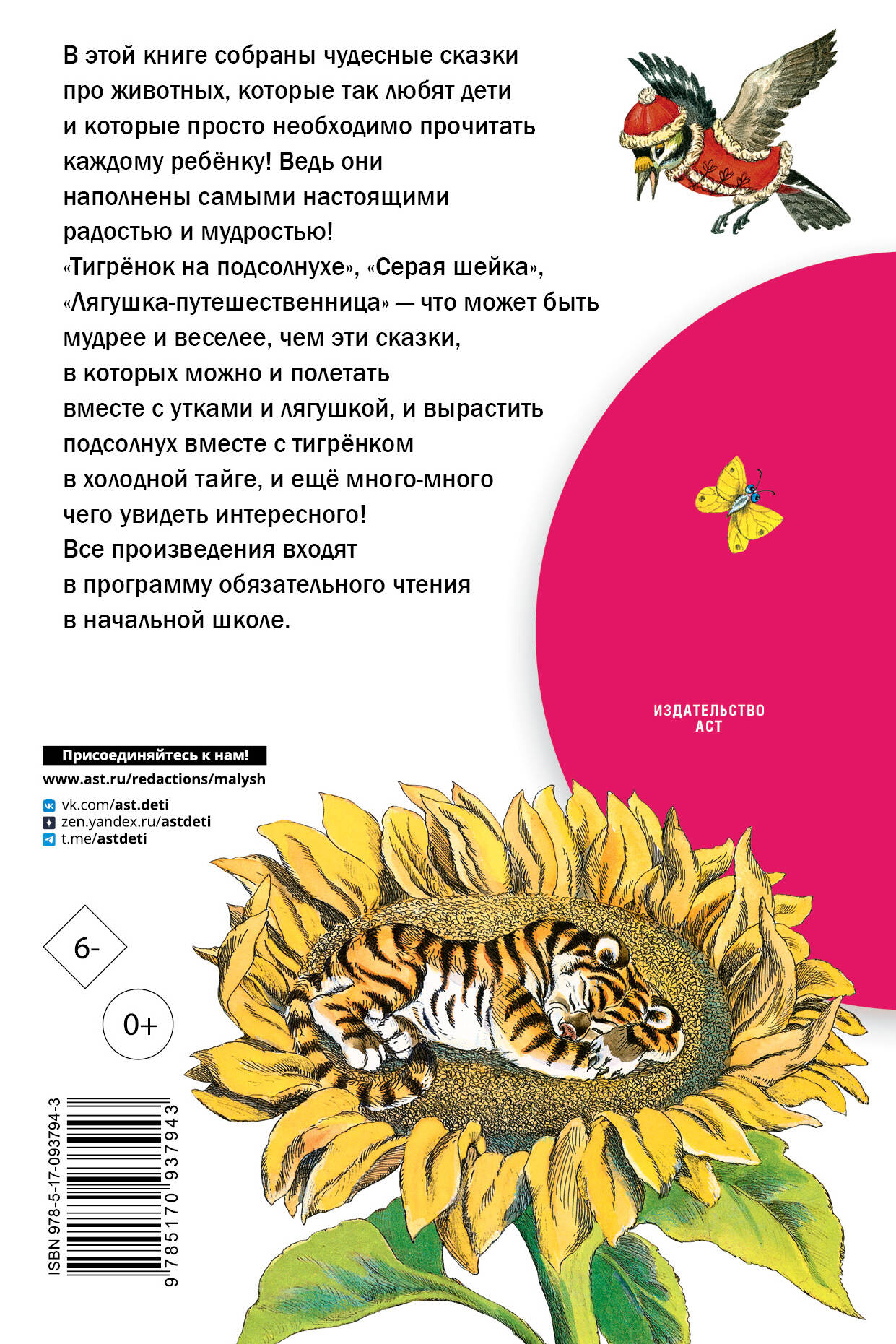 В этой книге собраны чудесные сказки про животных, которые так любят дети и которые просто необходимо прочитать каждому ребёнку! Ведь они наполнены самыми настоящими необычностями, радостью и мудростью! «Тигрёнок на подсолнухе», «Серая шейка», «Лягушка-путешественница» - что может быть мудрее и веселее, чем эти сказки, в которых можно и полетать вместе с утками и лягушкой, и вырастить подсолнух вместе с тигрёнком в холодной тайге, и ещё много-много чего увидеть интересного! Все произведения входят в программу обязательного чтения в начальной школе.| Издательство | ИЗДАТЕЛЬСТВО "АСТ" |