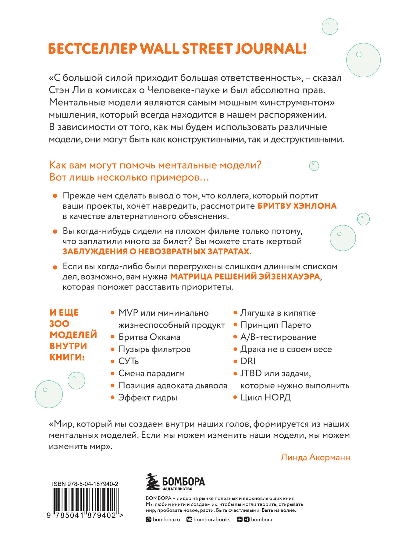 Бестселлер Wall Street Journal! «С большой силой приходит большая ответственность», -сказал Стэн Ли в комиксах о Человеке-Пауке и был абсолютно прав. Ментальные модели являются самым мощным «инструментом» мышления, который всегда находится в нашем распоряжении. В зависимости от того, как мы будем использовать различные модели, они могут быть как конструктивными, так и деструктивными. Как вам могут помочь ментальные модели? Вот лишь несколько примеров… • Прежде чем сделать вывод о том, что ваш коллега, который портит ваши проекты, хочет навредить, рассмотрите «Бритву Хэнлона» в качестве альтернативного объяснения. • Вы когда-нибудь сидели на плохом фильме только потому, что заплатили много за билет? Вы можете стать жертвой заблуждения о невозвратных затратах. • Если вы когда-либо были перегружены слишком длинным списком дел, возможно, вам нужна Матрица решений Эйзенхауэра, которая поможет вам расставить приоритеты. Эта книга научит: - обходить ментальные ловушки; - видеть несколько вариантов решения проблемы и выбирать лучший; - отделять хорошие идеи от плохих; - а также смотреть на мир шире и находить ответы в непривычных местах. «Вы ничего не знаете, если просто помните отдельные факты. Если факты не нанизаны на теорию, вы не сможете их использовать. У вас в голове должны быть модели». - Чарли Мангер, правая рука Уоренна Баффетта И еще 300 моделей внутри книги: · MVP или минимально жизнеспособный продукт. · Бритва Оккама. · Пузырь фильтров. · СУТь. · Смена парадигм. · Позиция адвоката дьявола. · Эффект гидры. · Лягушка в кипятке. · Принцип Парето. · А/В-тестирование. · Драка не в своем весе. · DRI. · JTBD или задачи, которые нужно выполнить. · Цикл НОРД. Также выходит под названием «Супермышление. Как обходить ментальные ловушки и принимать эффективные решения».| Издательство | ООО "Издательство "Эксмо" |