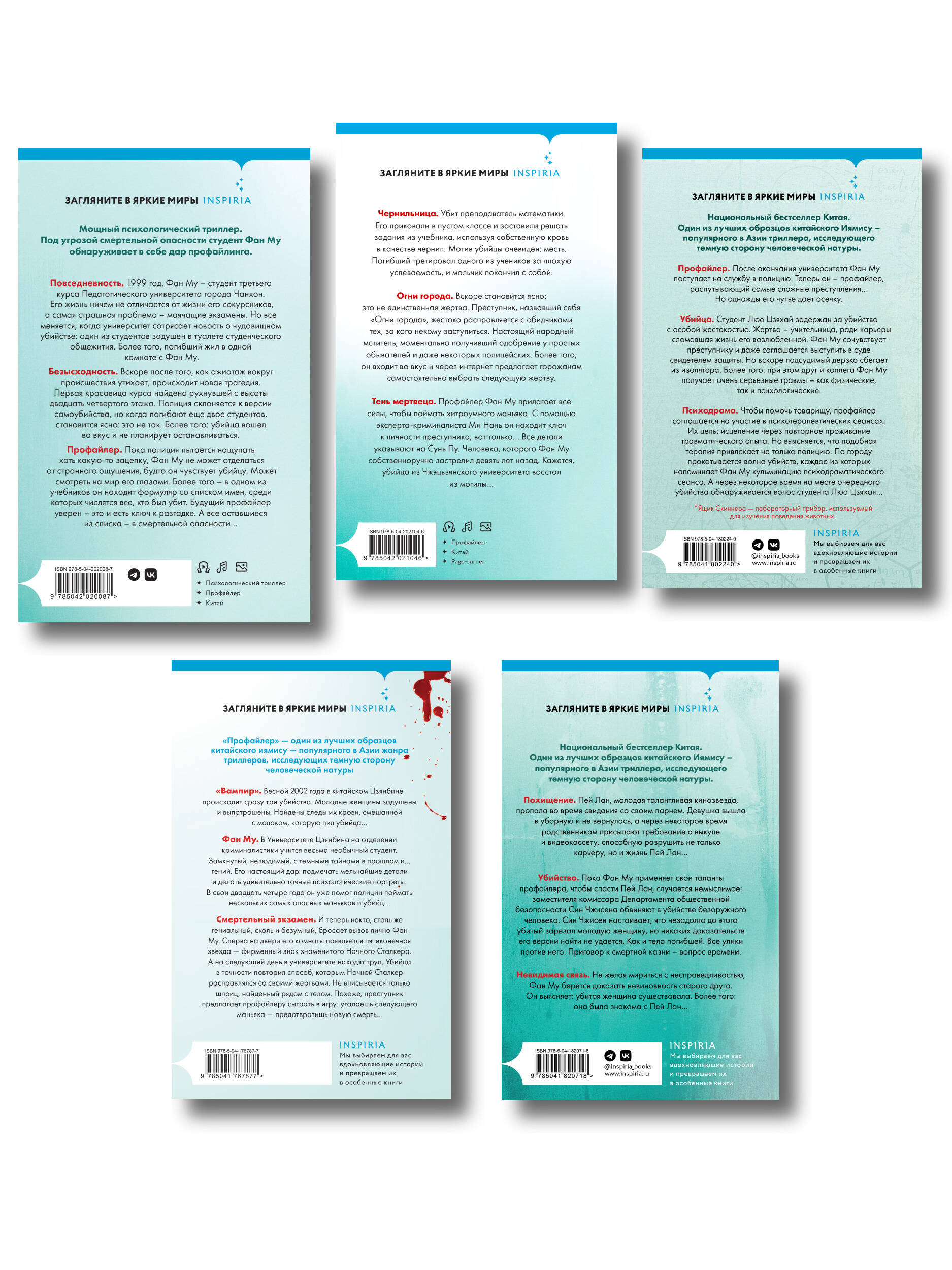 Пять триллеров о профайлере Фан Му в одном комплекте. Профайлер (#1) "Вампир". Весной 2002 года в китайском Цзяньбине происходит сразу три убийства. Молодые женщины задушены и выпотрошены. Найдены следы их крови, смешанной с молоком, которую пил убийца… Фан Му. В Университете Цзянбина, на отделении криминалистики учится весьма необычный студент. Замкнутый, нелюдимый, с темными тайнами в прошлом и… гений. Его настоящий дар: подмечать мельчайшие детали и делать удивительно точные психологические портреты. В свои двадцать четыре года он уже помог полиции поймать нескольких самых опасных маньяков и убийц… Смертельный экзамен. И теперь некто столь же гениальный, сколь и безумный, бросает вызов лично Фан Му. Сперва на двери его комнаты появляется пятиконечная звезда - фирменный знак знаменитого Ночного Сталкера. А на следующий день в Университете находят труп. Убийца в точности повторил способ, которым Ночной Сталкер расправлялся со своими жертвами. Не вписывается только шприц, найденный рядом с телом. Похоже, преступник предлагает профайлеру сыграть в игру: угадаешь следующего маньяка - предотвратишь новую смерть... Ящик Скиннера (#2) Профайлер. После окончания университета Фан Му поступает на службу в полицию. Теперь он - профайлер, распутывающий самые сложные преступления… Но однажды его чутье дает осечку. Убийца. Студент Люо Цзяхай, задержан за убийство с особой жестокостью. Жертва - учительница, ради карьеры сломавшая жизнь его возлюбленной. Фан Му сочувствует преступнику и даже соглашается выступить в суде свидетелем защиты. Но вскоре подсудимый дерзко сбегает из изолятора. Более того: при этом друг и коллега Фан Му получает очень серьезные травмы - как физические, так и психологические. Психодрама. Чтобы помочь товарищу, профайлер соглашается на участие в психотерапевтических сеансах. Их цель: исцеление через повторное проживание травматического опыта. Но выясняется, что подобная терапия привлекает не только полицию. По городу прокатывается волна убийств, каждое из которых напоминает Фан Му кульминацию психодраматического сеанса. А через некоторое время на месте очередного убийства обнаруживается волос студента Люо Цзяхая… Клинок молчания (#3) Похищение. Пей Лан, молодая, талантливая кинозвезда пропала во время свидания со своим парнем. Девушка вышла в уборную и не вернулась, а через некоторое время родственникам присылают требование о выкупе и видеокассету, способную разрушить Пей Лан не только карьеру, но и жизнь… Убийство. Пока Фан Му прикладывает свои таланты профайлера, чтобы спасти Пей Лан, случается немыслимое: заместителя комиссара Департамента общественной безопасности Син Чжисена обвиняют в убийстве безоружного человека. Син Чжисен настаивает, что незадолго до этого убитый зарезал молодую женщину, но никаких доказательств его версии найти не удается. Как и тела погибшей. Все улики против него. Приговор к смертной казни - вопрос времени. Невидимая связь. Не желая мириться с несправедливостью, Фан Му берется доказать невиновность старого друга. Он выясняет: убитая женщина существовала. Более того: она была знакома с Пей Лан… Седьмой читатель (#4) Повседневность. 1999 год. Фан Му - студент третьего курса Педагогического университета города Чанхон. Его жизнь ничем не отличается от жизни его сокурсников, а самая стр