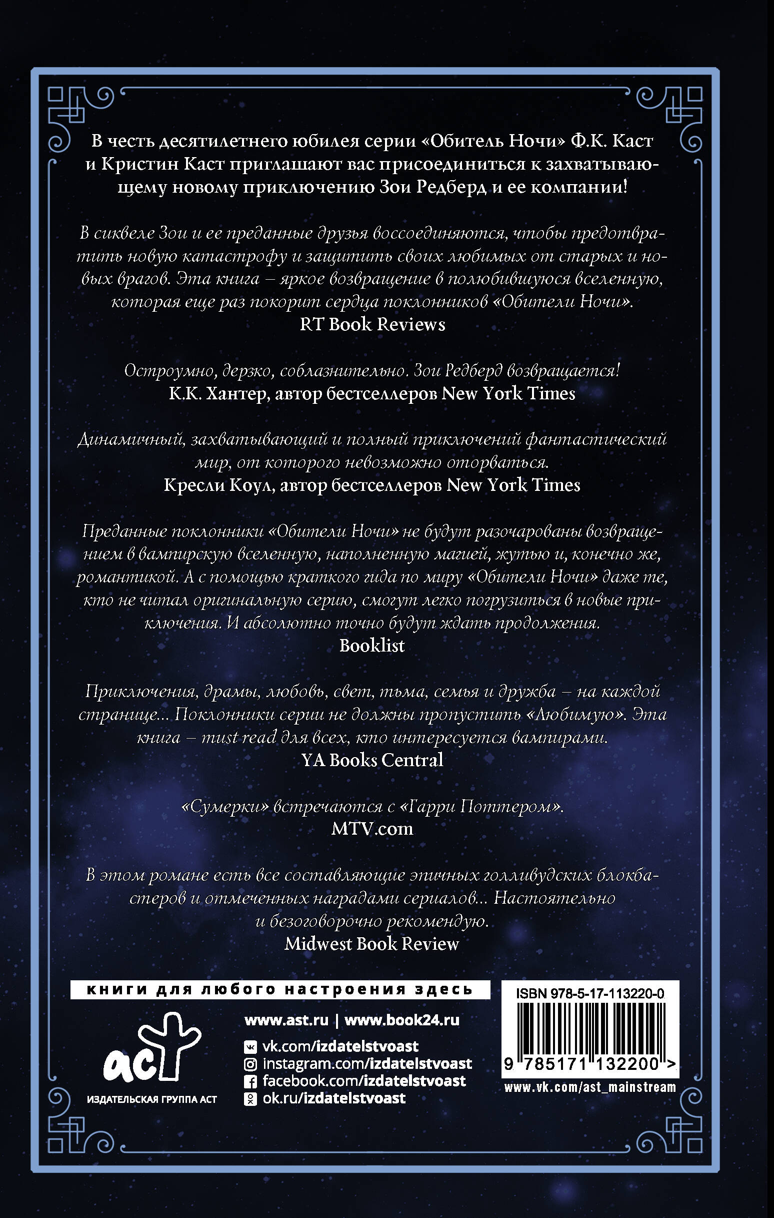 Приближается восемнадцатилетие Зои Редберд, а ее лучшие друзья, год назад окончившие Обитель Ночи, разбросаны по разным уголкам страны. Втайне от своей возлюбленной Старк собирает всю компанию на торжество в Обитель Ночи Талсы, где Зои занимает пост Верховной жрицы. Тем временем в городе начинают появляться странные темные знаки - причастна ли к этому коварная Неферет? Теперь вновь воссоединившиеся друзья должны не только отметить праздник Зои, но и спасти Талсу от надвигающейся тьмы. Преданные поклонники "Обители Ночи" не будут разочарованы возвращением в вампирскую вселенную, наполненную магией, жутью и, конечно же, романтикой. А с помощью краткого гида по миру "Обители Ночи" даже те, кто не читал оригинальную серию, смогут легко погрузиться в новые приключения. И абсолютно точно будут ждать продолжения. Впервые на русском языке!| Издательство | ИЗДАТЕЛЬСТВО "АСТ" |
