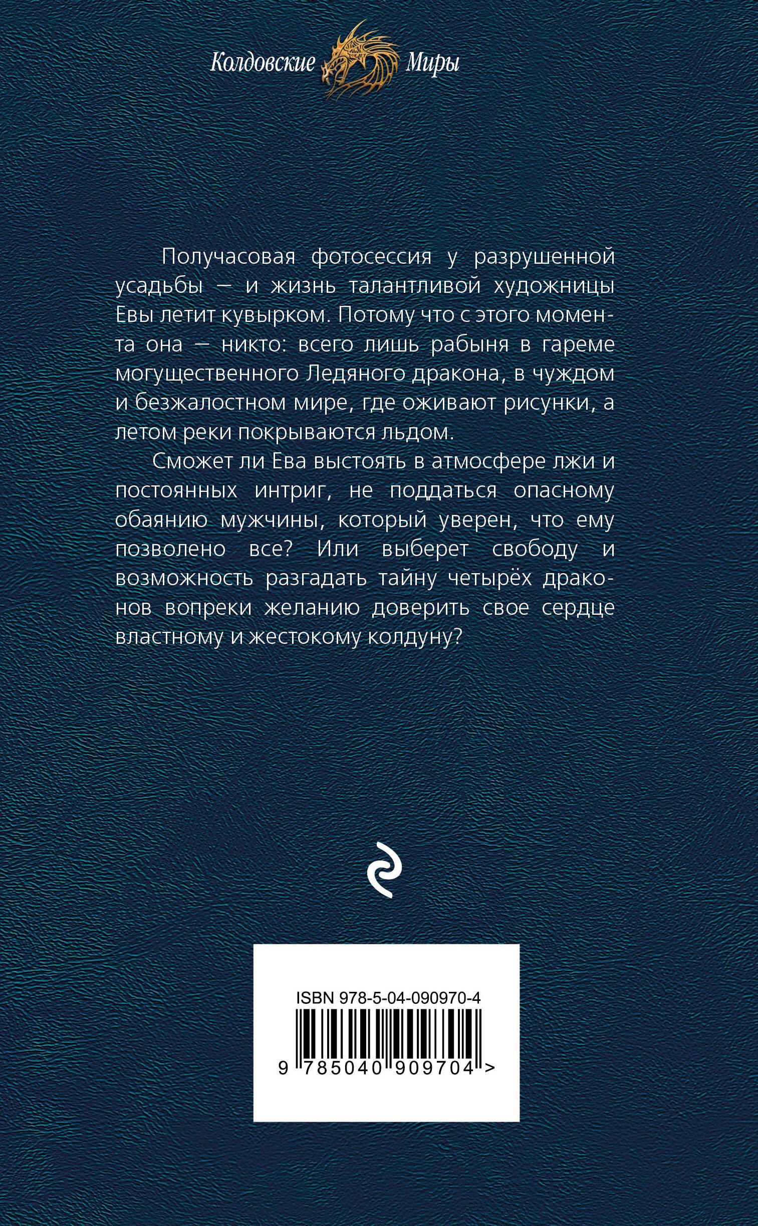 Получасовая фотосессия у разрушенной усадьбы - и жизнь талантливой художницы Евы летит кувырком. Потому что с этого момента она - никто: всего лишь рабыня в гареме могущественного Ледяного дракона, в чуждом и безжалостном мире, где оживают рисунки, а летом реки покрываются льдом. Сможет ли Ева выстоять в атмосфере лжи и постоянных интриг, не поддаться опасному обаянию мужчины, который уверен, что ему позволено все? Или выберет свободу и возможность разгадать тайну четырех драконов вопреки желанию доверить свое сердце властному и жестокому колдуну?| Издательство | ООО "Издательство "Эксмо" |