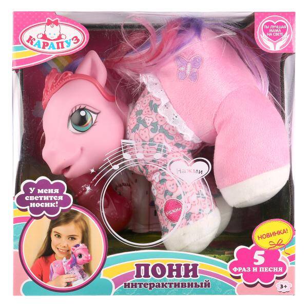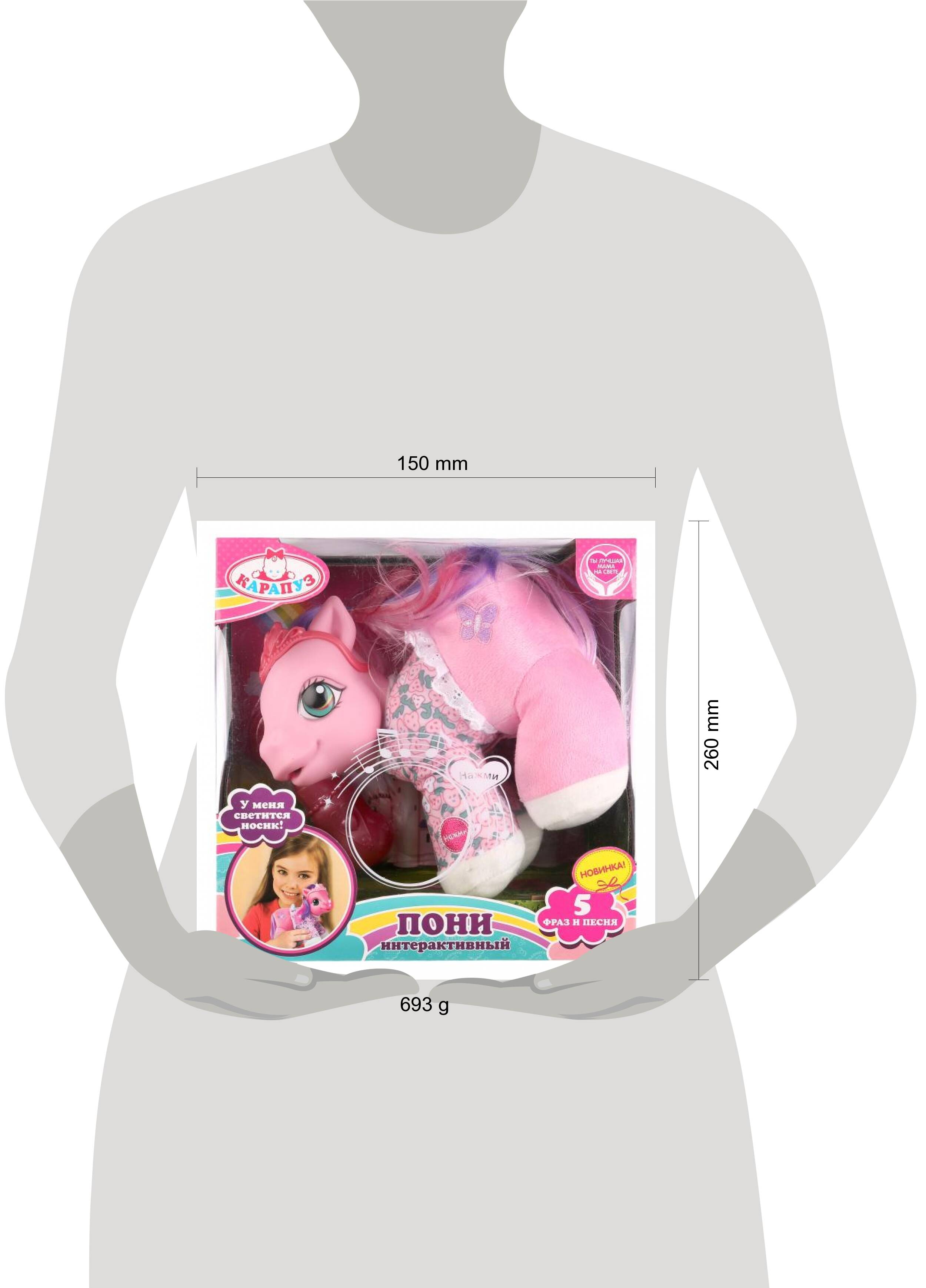 Интерактивная игрушка "Пони" ТМ "Карапуз" - озвученная игрушка. Говорит 5 фраз и поёт песенку. Функции 4 в 1: - говорит и поёт (при нажатии на переднюю левую ножку) - светящийся носик - пьёт из бутылочки - причмокивает Аксессуары в комплекте: - бутылочка - заколка На пони: стильная кофта (легко снять и надеть). У пони мягкое тело, её приятно обнимать и убаюкивать. Гриву и хвост легко расчёсывать и создавать разнообразные причёски. Игра с интерактивной игрушкой "Пони" позволяет строить сюжетно-ролевые линии и развивает: - звуковое восприятие и музыкальный слух - воображение и фантазию - ответственность - память С игрушкой ТМ "Карапуз" девочка вырастет заботливой мамой. Размер игрушки: 24 х 25 х 14 см. Материал: пластмасса + текстиль. Укомплектовано 3 батарейками типа LR44 (батарейки меняются). Рекомендовано детям от 3 лет.| Издательство | СИМБАТ ООО |