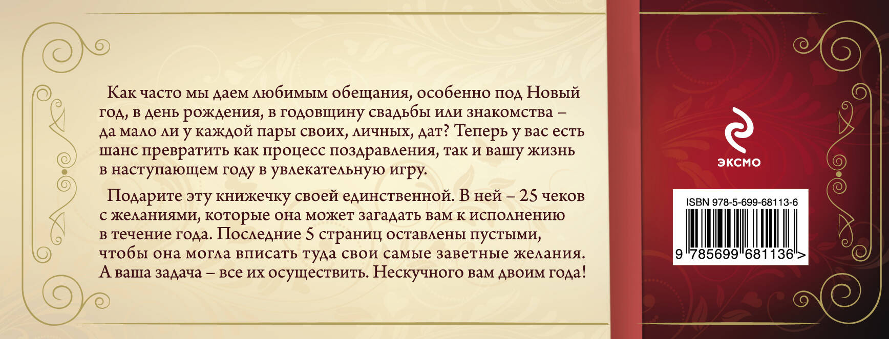 Как часто мы даем любимым обещания, особенно под Новый год, в день рождения, в годовщину свадьбы или знакомства - да мало ли есть у каждой пары своих, личных, дат? Теперь у вас есть шанс превратить как процесс поздравления, так и вашу жизнь в наступающем году в увлекательную игру. Подарите эту книжечку своей единственной. В ней - 25 чеков с желаниями, которые она может загадать вам к исполнению в течение года. Последние 5 страниц оставлены пустыми, чтобы она могла вписать туда свои самые заветные желания. А ваша задача - все их осуществить. Нескучного вам двоим года!| Издательство | ООО "Издательство "Эксмо" |