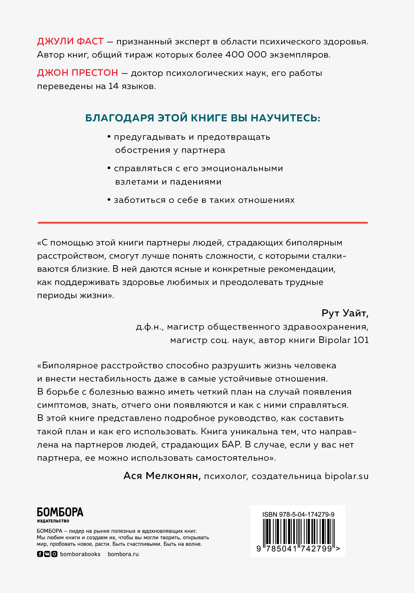 Новое оформление книги «Почему с тобой так трудно. Как любить людей с неврозами, депрессией и биполярным расстройством». В 31 год у Джули Фаст диагностировали биполярное расстройство, с которым на тот момент времени она жила уже 14 лет. Отсутствие необходимых лекарств, нездоровые отношения в семье, проблемы с работой и денежные трудности чуть не сломили ее, но преодолев их, она открыла для себя новый источник вдохновения. Пережитый опыт позволил ей стать востребованным специалистом в области психического здоровья и автором международных бестселлеров. В этой книге она в первую очередь обращается к людям, страдающим от последствий данного заболевания, и их партнерам. Ее цель - помочь преодолеть кризисные ситуации в отношениях и найти баланс между заботой о близком человеке и самом себе. Предлагаемый комплексный подход к лечению позволит упростить ежедневные сложности и взять симптомы расстройства под контроль. Из этой книги вы узнаете: - как вовлечь партнёра в работу над вашими отношениями и его состоянием; - как вести себя в периоды обострений и как их предотвращать; - за что не стоит винить вашего партнёра, а за что он должен отвечать сам; - как позаботиться о себе в таких отношениях; - почему брать на себя всю ответственность - не лучшая стратегия.| Издательство | ООО "Издательство "Эксмо" |
