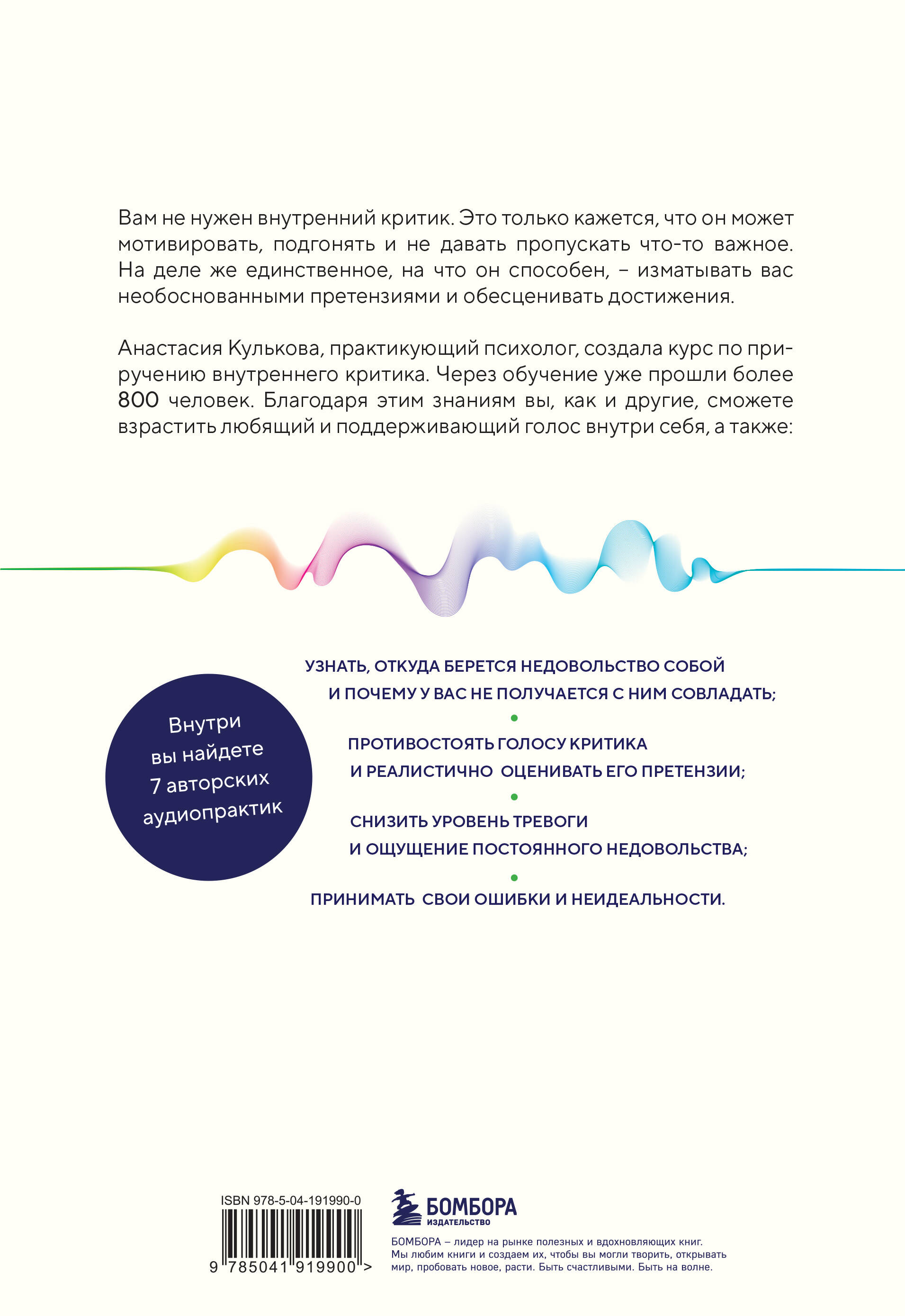 Вам не нужен внутренний критик. Это только кажется, что он может мотивировать, подгонять и не давать пропускать что-то важное. На деле же единственное, на что он способен - изматывать вас необоснованными претензиями и обесценивать достижения. Анастасия Кулькова, практикующий психолог, создала курс по приручению внутреннего критика. Через обучение уже прошли более 800 человек. Благодаря этим знаниям вы, как и другие, сможете взрастить любящий и поддерживающий голос внутри себя, а также: - узнать, откуда берется недовольство собой и почему у вас не получается с ним совладать; - противостоять голосу Критика и реалистично оценивать его претензии; - снизить уровень тревоги и ощущение постоянного недовольства; - принимать свои ошибки и неидеальности. «Как много сказано и написано о внутреннем критике, сжимающем нашу жизнь до размера замочной скважины. Умом мы прекрасно понимаем, что он много чего нужного нам дает, но вот как сделать его не врагом, а союзником? Это глубокий воркбук, который практически как целая книга, шаг за шагом помогает оказаться в точке "сейчас", не застревая в прошлом и не улетая в будущее. Уверена, что читатель, глубоко проживая себя на каждой странице, через вопросы, примеры и осознания раскроет красоту и силу своей осознанности». - Юлия Булгакова, психолог, коуч, автор книги «Разреши себе чувствовать»