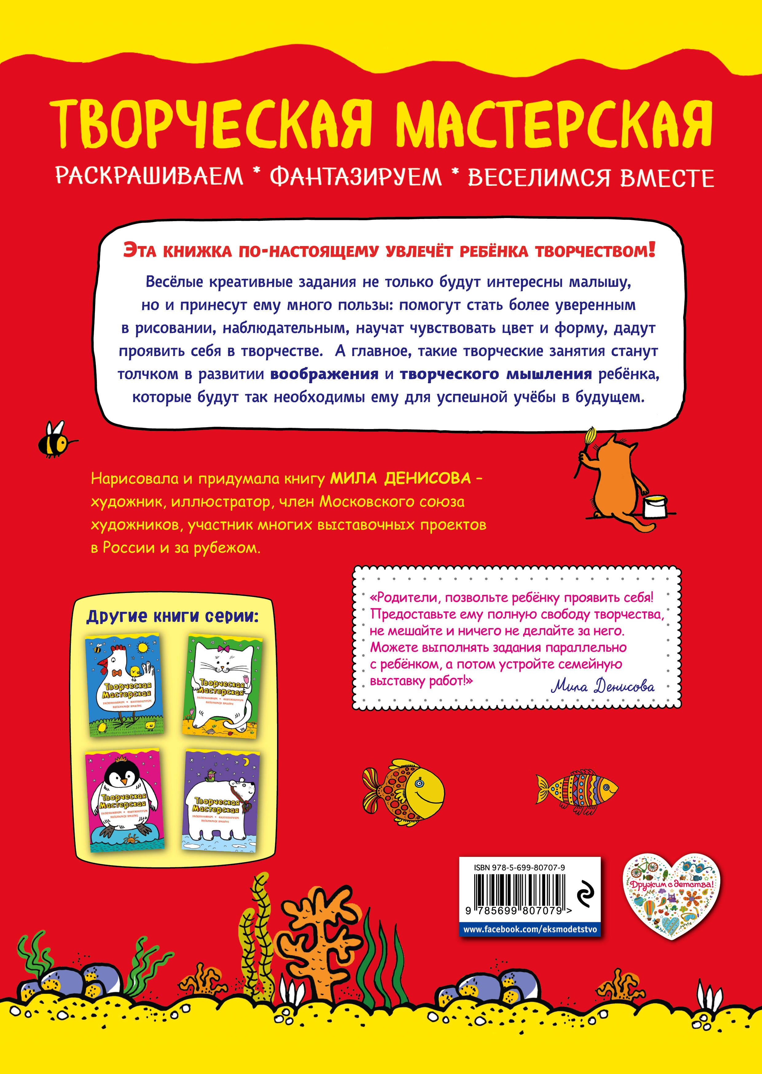 Эта книжка по-настоящему увлечет ребёнка творчеством! Весёлые креативные задания не только будут интересны малышу, но и принесут ему много пользы: помогут стать более уверенным в рисовании, наблюдательным, научат чувствовать цвет и форму, дадут проявить себя в творчестве. А главное, такие творческие занятия станут толчком в развитии воображения и творческого мышления ребенка, которые будут так необходимы ему для успешной учебы в будущем. Нарисовала и придумала книгу Мила Денисова - художник, иллюстратор, член Московского союза художников, участник многих выставочных проектов в России и за рубежом.| Издательство | ООО "Издательство "Эксмо" |