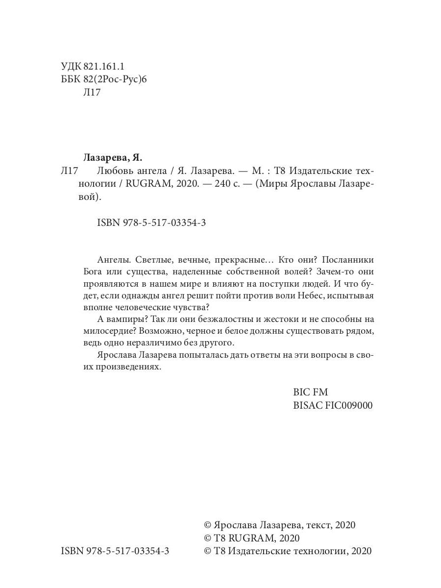 Ангелы. Светлые, вечные, прекрасные… Кто они? Посланники Бога или существа, наделенные собственной волей? Зачем-то они проявляются в нашем мире и влияют на поступки людей. И что будет, если однажды ангел решит пойти против воли Небес, испытывая вполне человеческие чувства? А вампиры? Так ли они безжалостны и жестоки и не способны на милосердие? Возможно, черное и белое должны существовать рядом, ведь одно неразличимо без другого. Ярослава Лазарева попыталась дать ответы на эти вопросы в своих произведениях.| Издательство | Т8 RUGRAM |