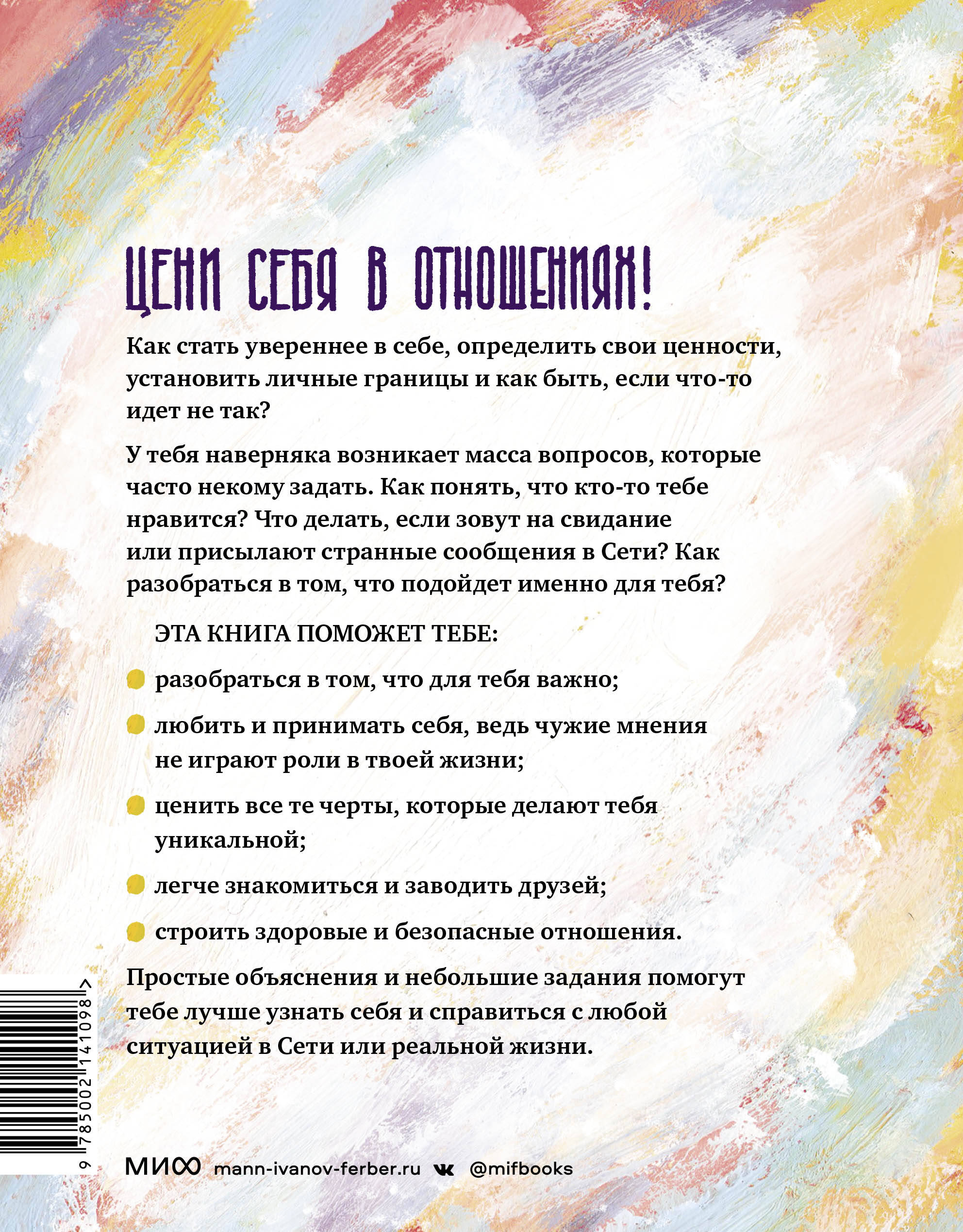 Практичный гид для девочек-подростков, который поможет разобраться во всех важных вопросах взросления. Под обложкой - ответы на вопросы о дружбе и отношениях, а также интересные задания, которые помогут лучше узнать себя и справиться с любой ситуацией. У тебя наверняка возникает масса вопросов, которые часто некому задать. Как понять, что кто-то тебе нравится? Что делать, если зовут на свидание или присылают странные сообщения в Сети? Как разобраться в том, что подойдет именно для тебя? Как стать увереннее в себе, определить свои ценности, установить личные границы и как быть, если что-то идет не так? Эта книга поможет тебе: разобраться в том, что для тебя важно; любить и принимать себя, ведь чужие мнения не играют роли в твоей жизни; ценить все те черты, которые делают тебя уникальной; легче знакомиться и заводить друзей; строить здоровые и безопасные отношения. Простые объяснения и небольшие задания помогут тебе лучше узнать себя, осознать свои принципы, научиться ценить себя и устанавливать границы. И объяснят, как быть, если что-то идет не так. Большое внимание авторы уделяют вопросу первых отношений - как общаться с партнером и построить связь, основанную на согласии и доверии. Книга поможет тебе не стать жертвой абьюзивного или нарциссичного партнера, который сделает только больно. Цени себя в отношениях! Для кого книга: Книга рекомендуется девочкам-подросткам и их родителям, которые хотят донести до дочерей важные вещи о взрослении и сформировать у них самооценку, внутренний стержень и правильное отношение к опасностям взросления.| Издательство | МАНН, ИВАНОВ И ФЕРБЕР ООО |