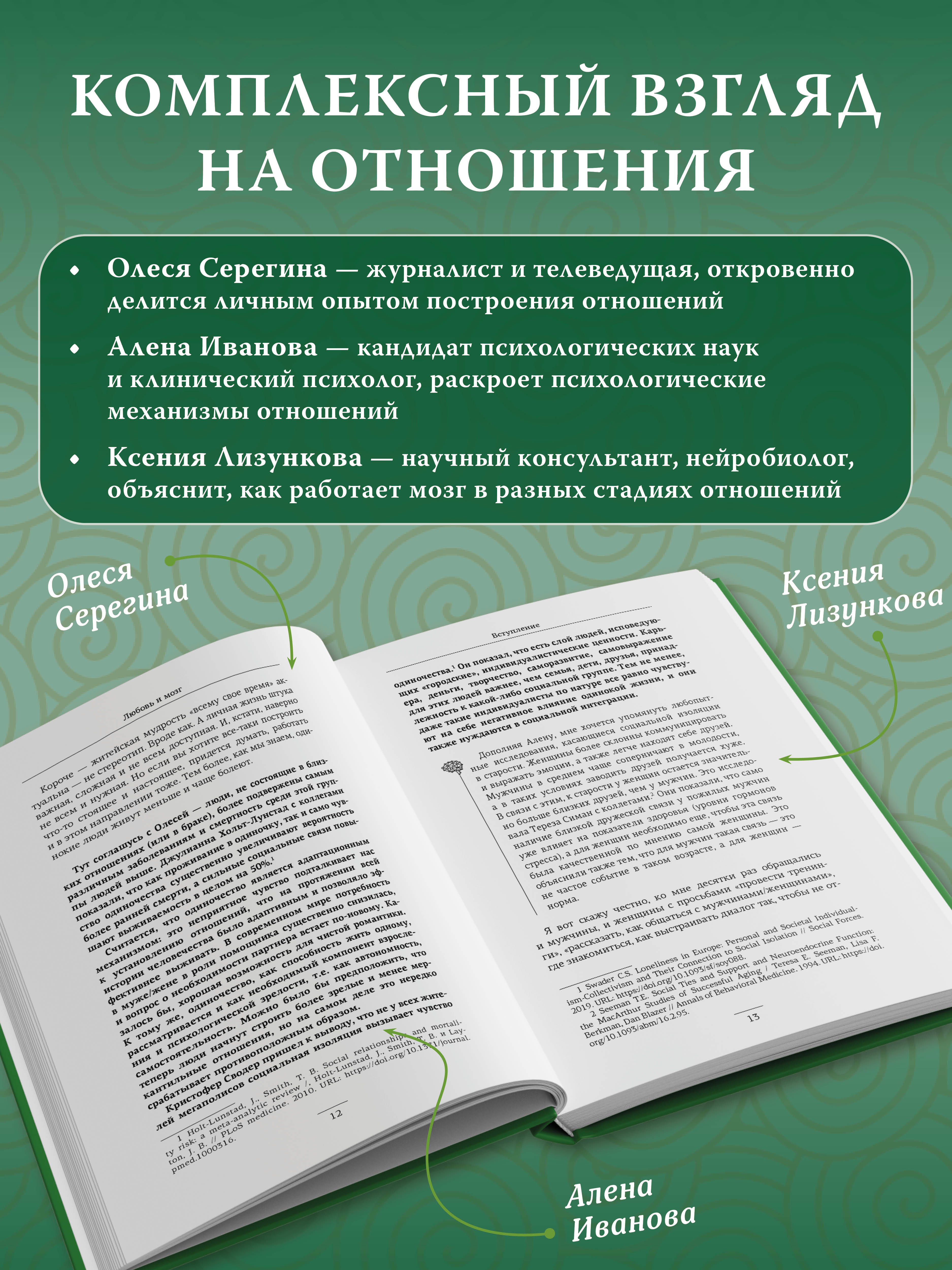 Олеся Серегина - журналист, ведущая, основатель благотворительного фонда "Дополнительное время", автор книги "Как мы развлекали страну". Алена Иванова - кандидат психологических наук, доцент ФГАОУ ВО РНИМУ им. Н.И. Пирогова МЗ РФ (Пироговский университет); старший научный сотрудник ФГБНУ "Научный центр психического здоровья"; клинический психолог, психотерапевт, исследователь в области психологии юмора. Ксения Лизункова - научный консультант, специалист в области нейробиологии, исследователь, автор научных статей. Книга, изначально задуманная с ироничным названием "Три брака - ни одного борща", основана на реальных событиях и родилась из личного опыта ошибок, кринжовых историй, браков, разводов, ссор, примирений и сложных поисков компромиссов. В конечном итоге, соединив современные научные исследования в области нейробиологии и психологии с многолетним опытом психотерапии, она преобразилась в глубокое исследование. Поэтому сейчас вы держите в руках книгу "Любовь и мозг", где авторы проанализировали этапы отношений с разных сторон. Вы узнаете о влиянии гормонов на влюбленность, почему спадают "розовые очки", как справиться с ревностью, общаться ли с бывшими, когда пора съезжаться и нужно ли варить борщи. Эта книга - не сборник готовых решений, а личный гид, помогающий понять отношения в их развитии, строить их осознанно и справляться с вызовами, не ограничивая себя стереотипами. "Любовь и мозг" - книга-исследование, созданная для того, чтобы помочь читателю лучше понять сложности отношений в XXI веке.| Издательство | Издательство "АСТ" |