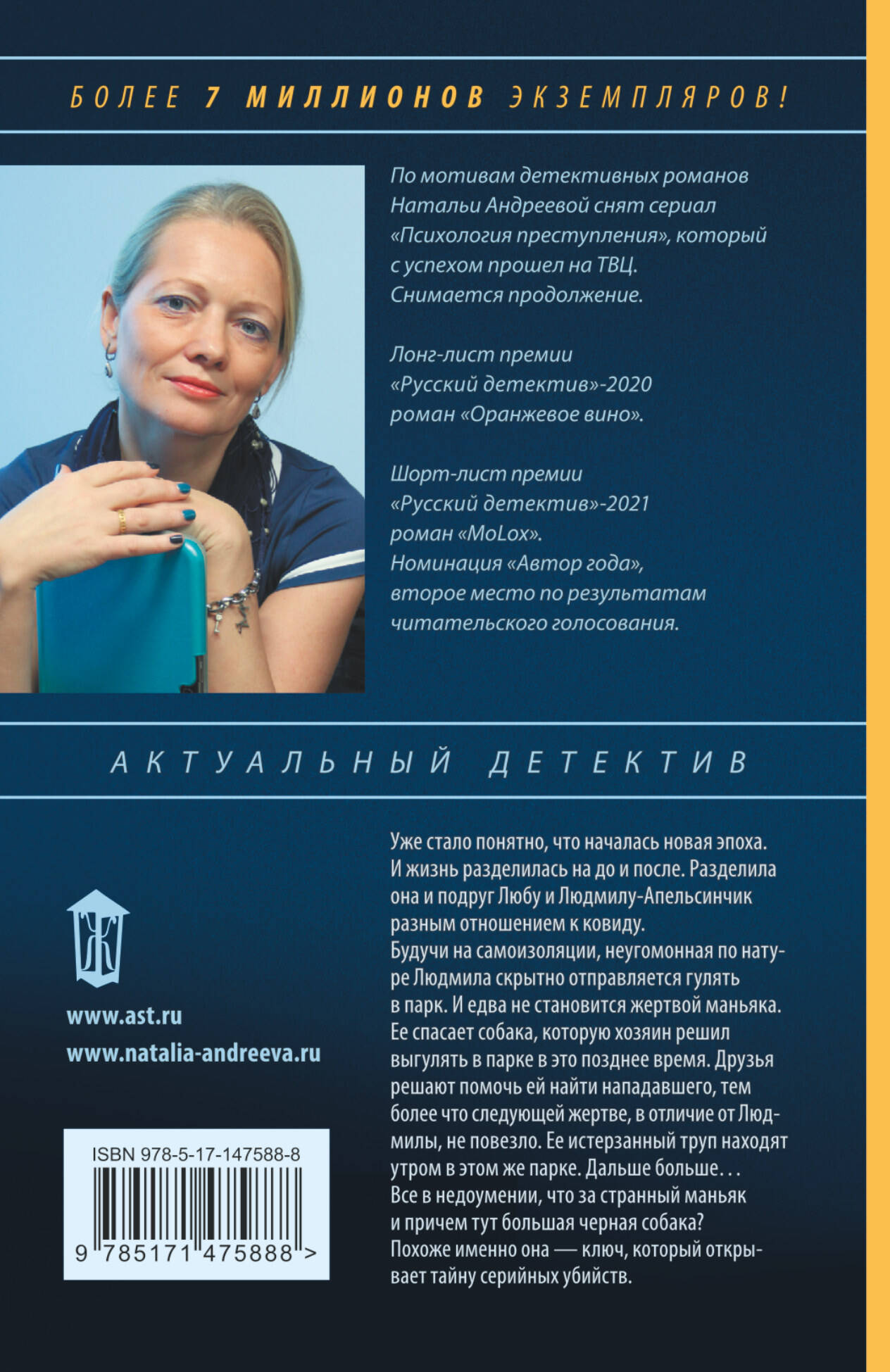 Уже стало понятно, что началась новая эпоха. И жизнь разделилась на до и после. Разделила она и подруг Любу и Людмилу-Апельсинчик разным отношением к ковиду. Будучи на самоизоляции, неугомонная по натуре Людмила, скрытно отправляется гулять в парк. И едва не становится жертвой маньяка. Ее спасает собака, которую хозяин решил выгулять в парке в это позднее время. Друзья решают помочь ей найти нападавшего, тем более что следующей жертве, в отличие от Людмилы, не повезло. Ее истерзанный труп находят утром в этом же парке. Дальше больше… Все в недоумении, что за странный маньяк и причем тут большая черная собака? Похоже именно она, ключ, который открывает тайну серийных убийств.| Издательство | ИЗДАТЕЛЬСТВО "АСТ" |