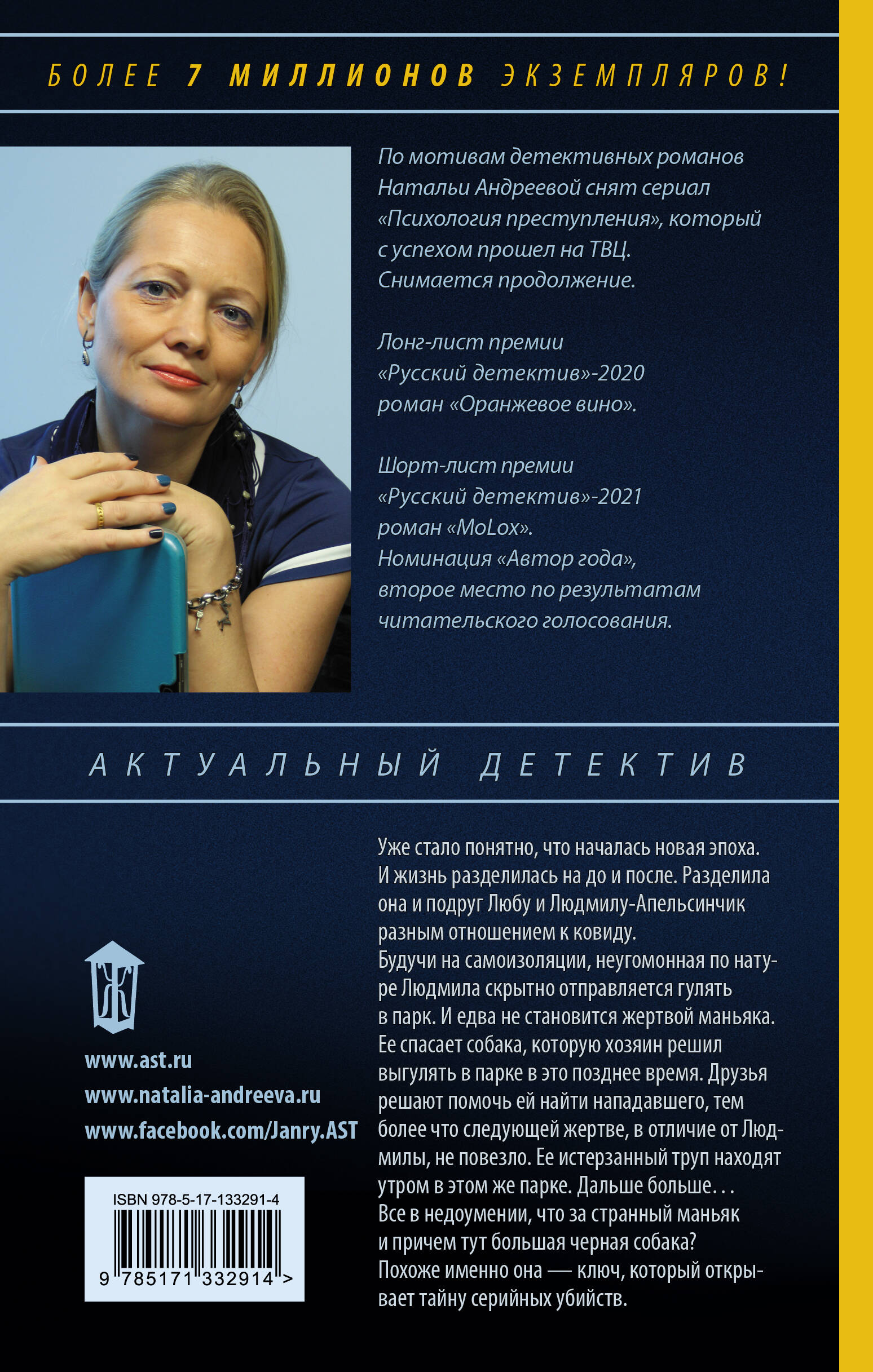 Уже стало понятно, что началась новая эпоха. И жизнь разделилась на до и после. Бывшие подруги, Люба и Людмила по прозвищу Апельсинчик по-разному относятся к ковиду. Пока он не вторгается в семью Людмилы: заболел ее муж. Будучи на самоизоляции, анархистка по натуре Людмила, идет поздно вечером в парк, прогуляться. И едва не становится жертвой маньяка. Ее спасает собака, которую хозяин решил выгулять в парке в это позднее время. В полицию Апельсинчик пойти не может: ей грозит штраф, а то и статья УК за нарушение карантина. Приходится ее друзьям подключиться к расследованию, тем более что следующей жертве, Анжелике Масловой в отличие от Людмилы не повезло. Ее истерзанный труп находят утром в этом же парке. Но с каждым новым днем в деле о маньяке появляется все больше странностей. А женщины ли его интересуют? И причем тут большая черная собака? А она, похоже, ключ, который открывает тайну серийных убийств. По мотивам детективных романов Натальи Андреевой снят сериал "Психология преступления", который с успехом прошел на ТВЦ. Снимается продолжение Лонг-лист премии "Русский детектив" 2020 роман "Оранжевое вино" Шорт-лист премии "Русский детектив" 2021 роман "МоLох". Номинация "Автор года", второе место по результатам читательского голосования| Издательство | Издательство "АСТ" |