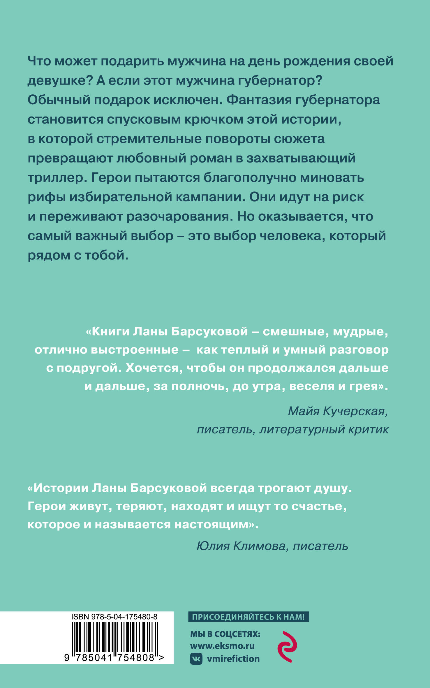 Герои Ланы Барсуковой учат нас жить, любить, находить компромиссы в отношениях с близкими, а еще - быть счастливыми, несмотря ни на что. Вместе с ними мы переживаем их жизненные удачи и провалы, сопереживаем и сравниваем с собой: «А ведь и у меня так было!» Эта сопричастность делает читателя не сторонним наблюдателем, а участником событий, происходящих с героями. Доверительная интонация, внимание к деталям и узнаваемые жизненные ситуации делают прозу Ланы Барсуковой чтением для души. Что может подарить мужчина на день рождения своей девушке? А если этот мужчина губернатор? Обычный подарок исключен. Фантазия губернатора становится спусковым крючком этой истории, в которой стремительные повороты сюжета превращают любовный роман в захватывающий триллер. Герои пытаются благополучно миновать рифы избирательной кампании. Они идут на риск и переживают разочарования. Но оказывается, что самый важный выбор - это выбор человека, который рядом с тобой.| Издательство | ООО "Издательство "Эксмо" |