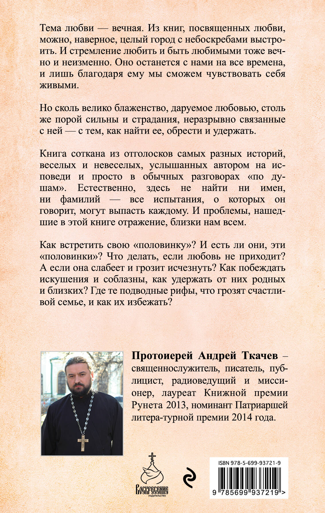 Новая книга Андрея Ткачева - о самом дорогом и близком: нашем счастье взаимной любви. Для тех, кто ищет, но пока не нашел, для тех, кто встретил, но не может понять, твой ли это человек, для тех, кто счастлив в браке много лет. Эта книга о настоящем человеческом счастье и для романтичных юношей и девушек, и для зрелых мужей и жен, и для мудрых бабушек и дедушек. Самый ценный опыт, собранный и изложенный одним из самых популярных православных священников.| Издательство | ООО "Издательство "Эксмо" |