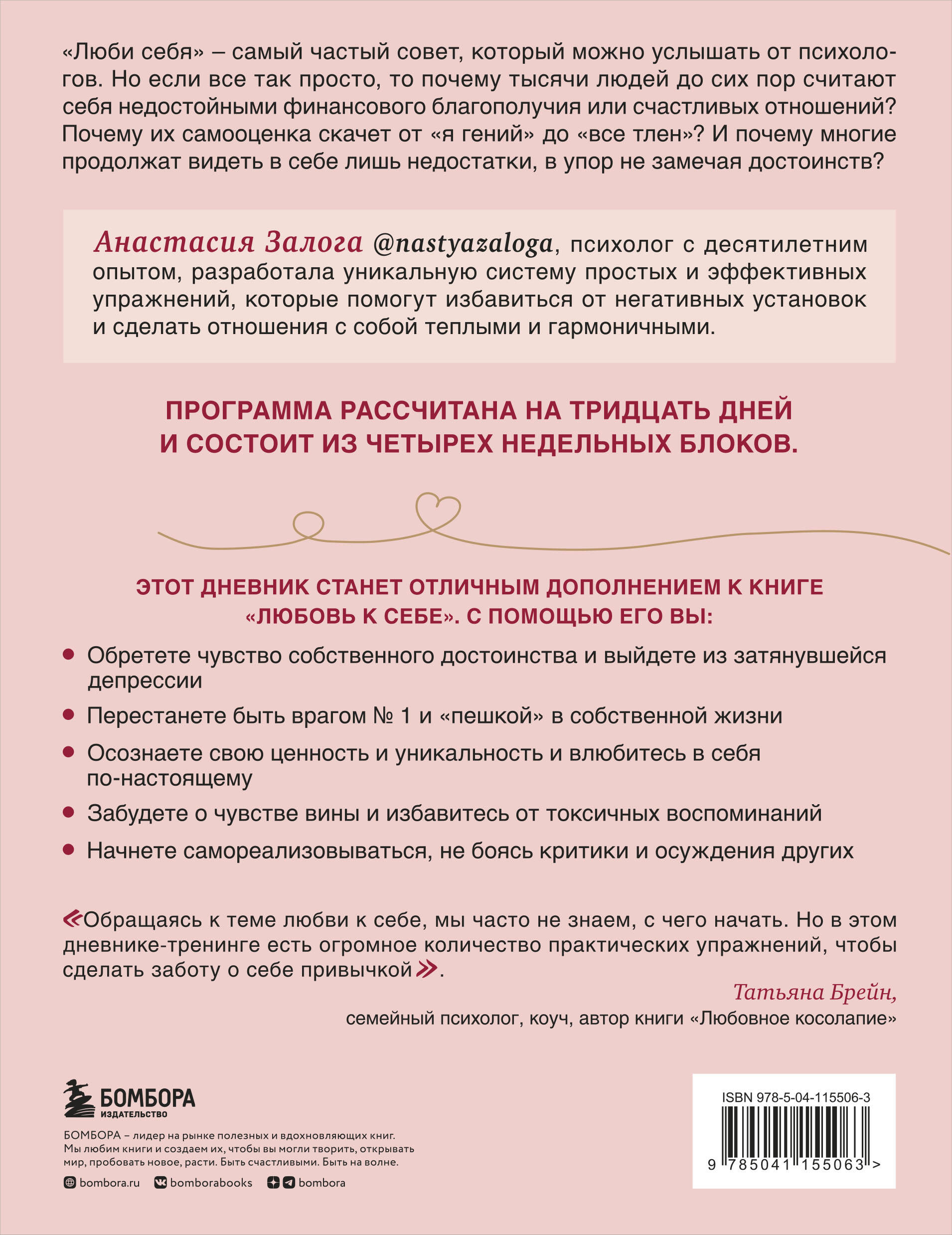 «Люби себя» - самый частый совет, который можно услышать от психологов. Но если все так просто, то почему тысячи людей до сих пор считают себя недостойными финансового благополучия или счастливых отношений? Почему их самооценка скачет от «я гений» до «все тлен»? И почему многие продолжают видеть в себе лишь недостатки, в упор не замечая достоинства? Анастасия Залога, психолог с десятилетним опытом, разработала уникальную систему простых и эффективных упражнений, которые помогут избавиться от негативных установок и сделать отношения с собой теплыми и гармоничными. Программа рассчитана на тридцать дней и состоит из четырех недельных блоков. С помощью этого дневника вы: - Обретете чувство собственного достоинства и выйдете из затянувшейся депрессии. - Перестанете быть врагом № 1 и «пешкой» в собственной жизни. - Осознаете свою ценность и уникальность и влюбитесь в себя по-настоящему. - Забудете о чувстве вины и избавитесь от токсичных воспоминаний. - Начнете самореализовываться, не боясь критики и осуждения других. «Обращаясь к теме любви к себе, мы часто не знаем, с чего начать. Но в этом дневнике-тренинге есть огромное количество практических упражнений, чтобы сделать заботу о себе - привычкой». - Татьяна Брейн, семейный психолог, коуч, автор книги «Любовное косолапие»| Издательство | ООО "Издательство "Эксмо" |