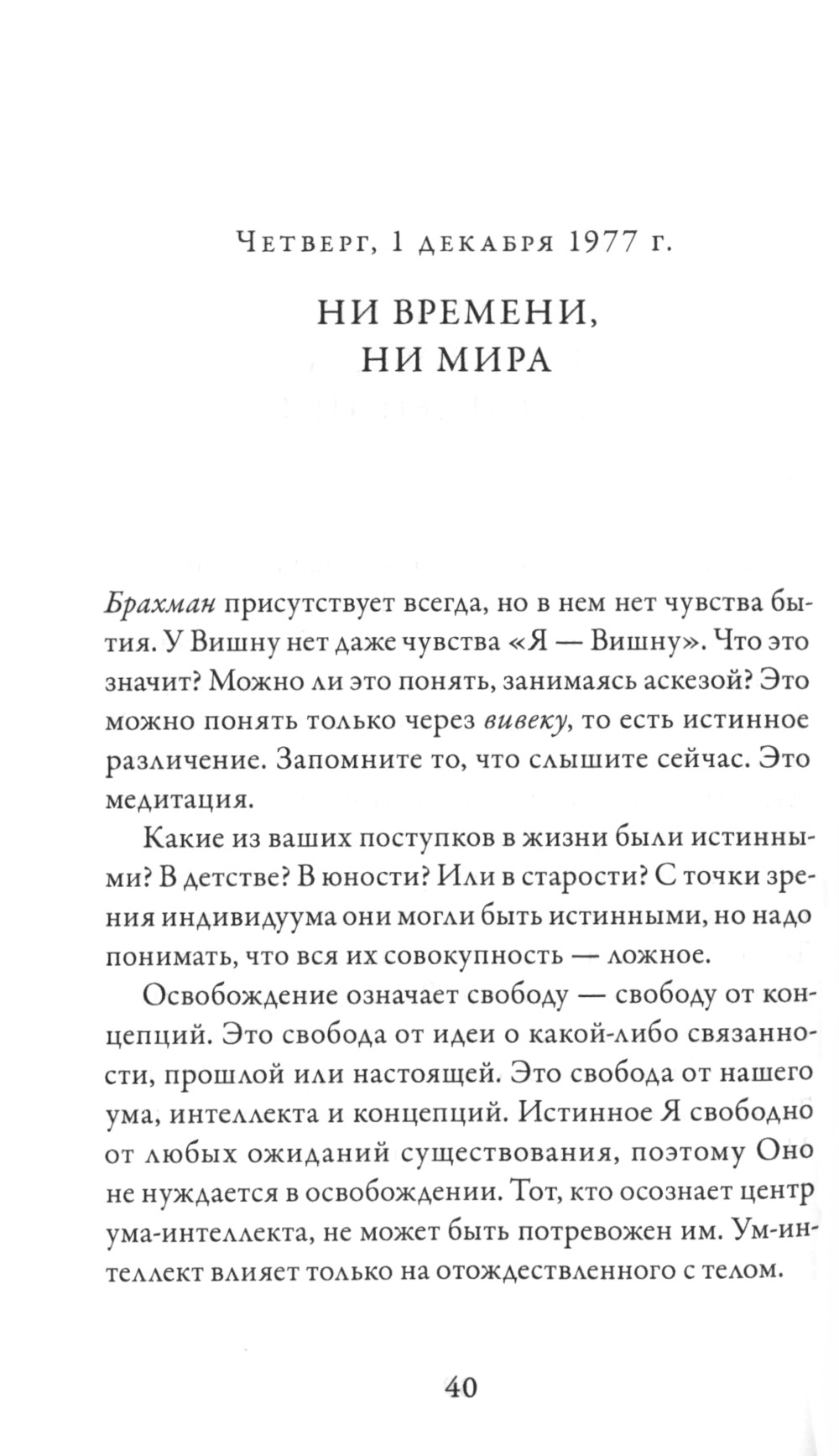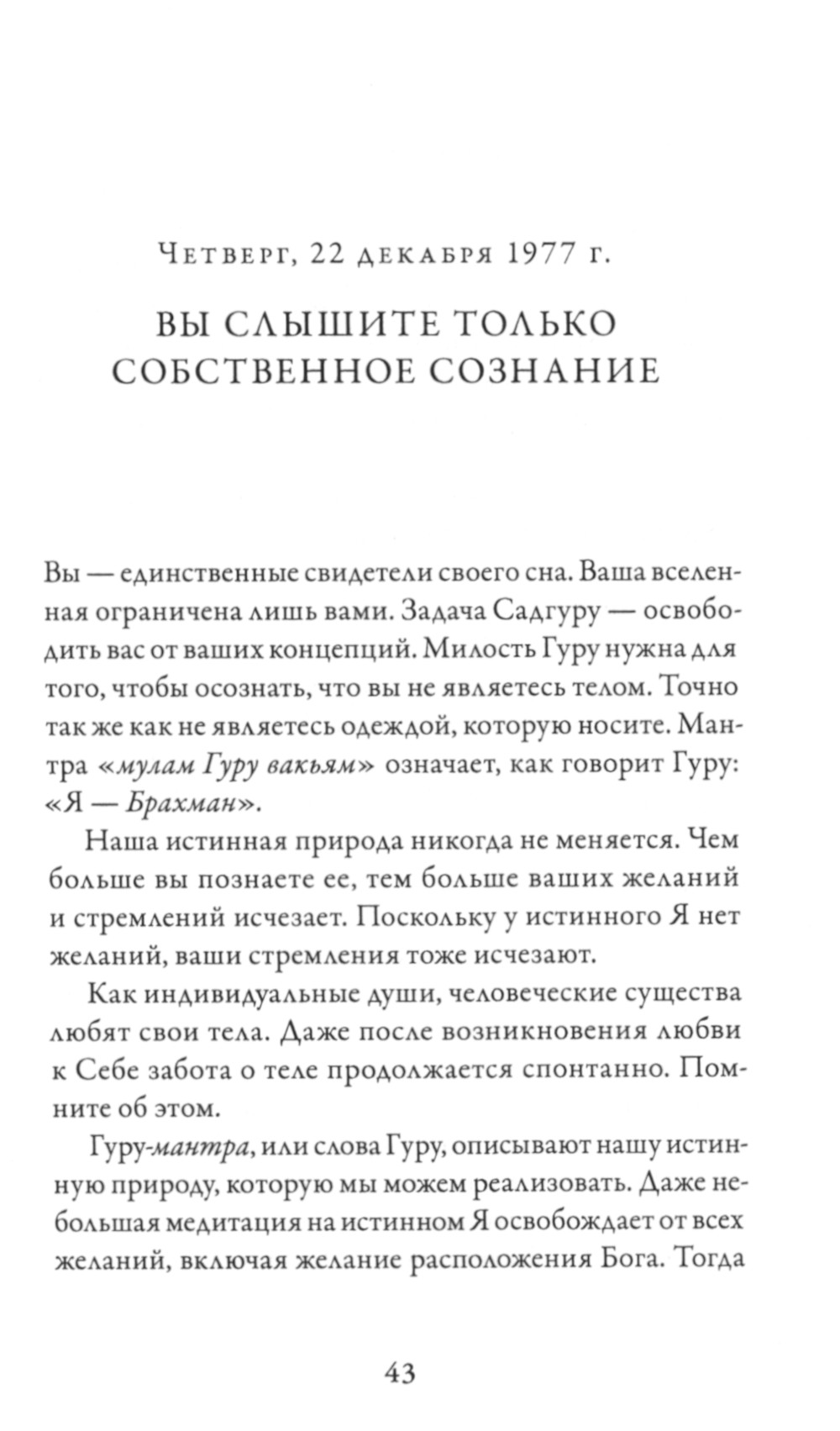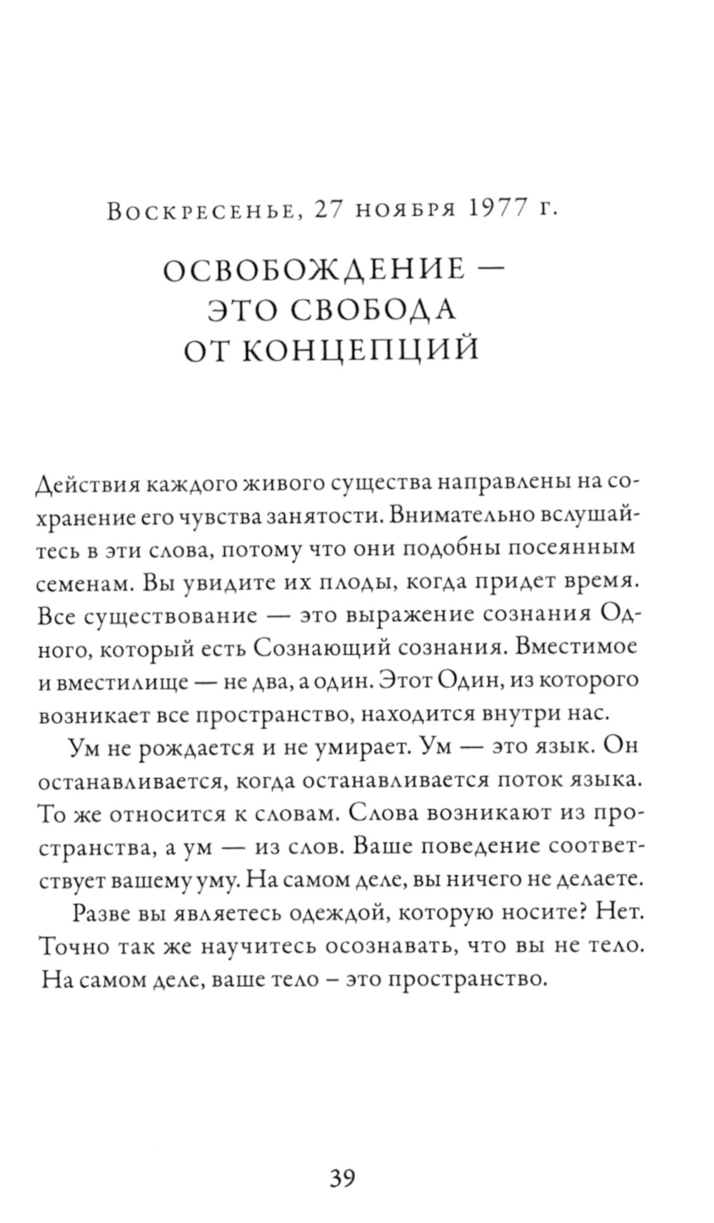 В этих беседах - ответы на множество вопросов ищущих самого разного уровня, от простых советов до глубочайших указателей на природу Реальности и истинного Я. Что такое любовь, мир, я, сознание, медитация, Бог?.. Ваш вопрос не останется без ответа. Вас ждет магическое путешествие вглубь Себя с одним из величайших Учителей этого мира - Нисаргадаттой Махараджем. «Великая Реальность проявляется как любовь к себе. Мы не можем сказать, чья это любовь. С ней появляется вся вселенная. Любовь к себе - это наше сознание, которое занимает целую вселенную. Она растет сама по себе. Крошечная частица в изначальной саттве становится Сознающим. Мало кто смотрит на причину сознания, на то, из чего оно сделано. Искренний ищущий ясно видит, как сияет его жизнь и существование».| Издательство | Изд. Ганга |