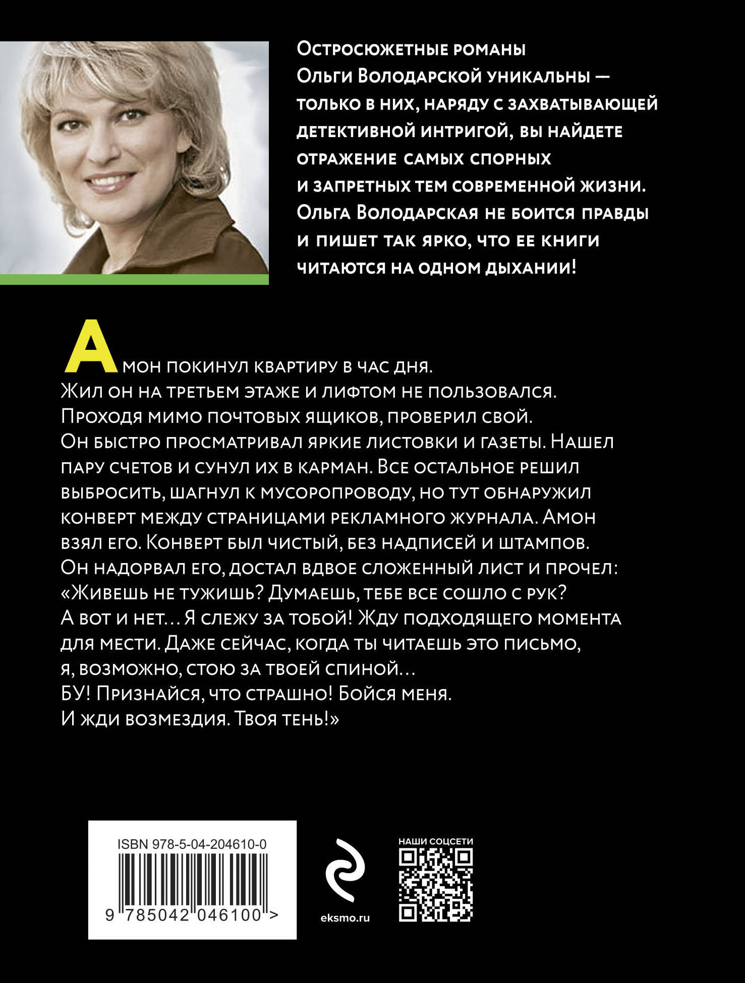 Все началось с письма… Амон, которого родители назвали так в честь египетского бога Солнца, обнаружил его в своем почтовом ящике. В письме некто, подписавшийся «Тень», обещал следовать за ним до тех пор, пока не наступит подходящий момент для мести. Амон не испугался. Он был уверен, что его «тень» безобидна… Лада, живущая по соседству, тоже прочла письмо. И решила, что послание адресовано ей, а в ящик Амона попало по ошибке. Лада испугалась. Потому что тот, кто желал ей отомстить, был очень опасным человеком… Вскоре у Амона убили друга, а на подругу Лады напали. Кто же сделал это? Чья тень начала мстить? Романы Ольги Володарской - остросоциальные детективы, в которых автор препарирует все стороны жизни современного общества, ничего не скрывая и ни о чем не умалчивая. Ее книги написаны так увлекательно, что оторваться просто невозможно. Яркий сочный язык и блестящий авторский стиль создают неповторимую атмосферу, в которую с головой погружается читатель.| Издательство | ООО "Издательство "Эксмо" |
