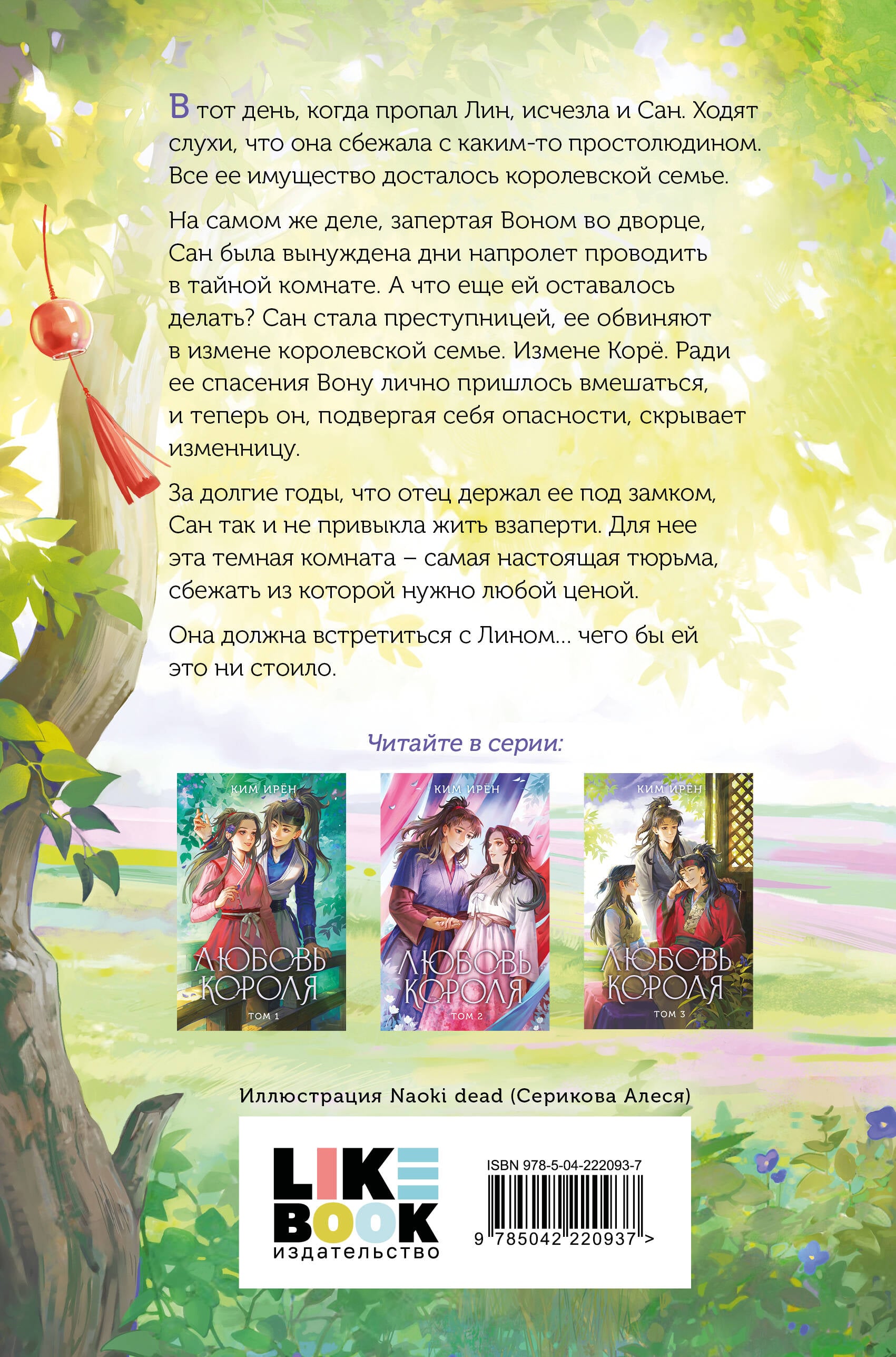 ЗАКЛЮЧИТЕЛЬНАЯ ЧАСТЬ НОВЕЛЛЫ «ЛЮБОВЬ КОРОЛЯ», НЕВЕРОЯТНО КРАСИВОЙ И ТРОГАТЕЛЬНОЙ КОРЕЙСКОЙ ИСТОРИЧЕСКОЙ ДРАМЫ. • Необычный сеттинг! Действие книги происходит в период Корё, существовавший до династии Чосон. • Экранизация! Одноименная дорама вышла в 2017 году. Ее можно посмотреть в онлайн-кинотеатрах страны. • Иллюстрацию на обложку книги подготовила талантливая и популярная художница Naoki dead. • Отлично подойдет всем поклонникам новелл «Сон в тысячу лет», «Ветер и Луна не подходят друг другу», «Баллада о нефритовой кости», а также сериалов «Легенда о Чжаояо», «Наша цветущая молодость», «Запрет на браки в Чосоне», «Императрица Ки» и «Солнце в объятьях луны». • Милая, нежная, местами комичная и невероятно захватывающая история о настоящей любви, дружбе и преданности. В тот день, когда пропал Лин, исчезла и Сан. Ходят слухи, что она сбежала с каким-то простолюдином. Все ее имущество досталось королевской семье. На самом же деле, запертая Воном во дворце, Сан была вынуждена дни напролет проводить в тайной комнате. А что еще ему оставалось делать? Сан стала преступницей, ее обвиняют в измене королевской семье. Измене Корё. Ради ее спасения Вону лично пришлось вмешаться, и теперь он, подвергая себя опасности, скрывает изменницу. За долгие годы, что отец держал ее под замком, Сан так и не привыкла жить взаперти. Для нее эта темная комната - самая настоящая тюрьма, сбежать из которой нужно любой ценой. Она должна встретиться с Лином… чего бы ей это ни стоило. «Что есть любовь, а что - дружба? Юным героям романа предстоит разобраться в этих непростых вопросах и понять, готовы ли они потерять друг друга, если выбор невозможен». - Анна, the_adventures_of_Anna| Издательство | ООО "Издательство "Эксмо" |