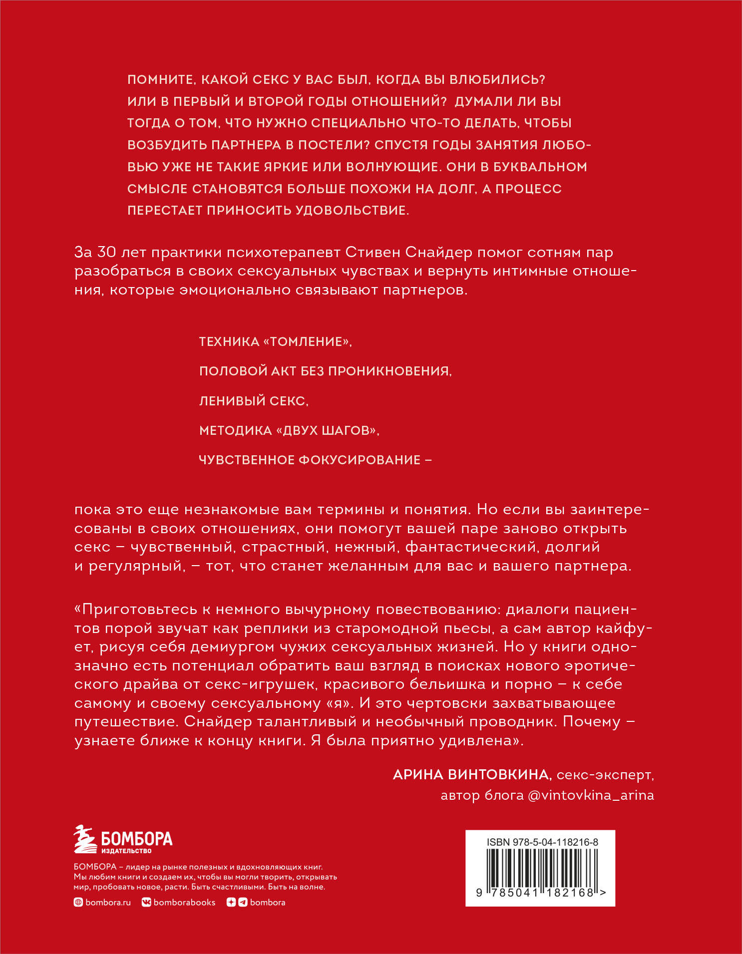 Помните, какой секс у вас был, когда вы влюбились? Или в первый и второй год отношений? Думали ли вы тогда о том, что нужно специально что-то делать, чтобы возбудить партнера в постели? Спустя годы занятия любовью уже не такие яркие или волнующие. Они в буквальном смысле становятся больше похожи на долг, а процесс перестает приносить удовольствие. За 30 лет практики психотерапевт Стивен Снайдер помог сотням пар разобраться в своих сексуальных чувствах и вернуть интимные отношения, которые эмоционально связывают партнеров. - Техника «томление», - половой акт без проникновения, - ленивый секс, - методика «Двух шагов», - чувственное фокусирование... ...пока это еще не знакомые вам термины и понятия. Но если вы заинтересованы в своих отношениях, они помогут вашей паре заново открыть секс - чувственный, страстный, нежный, фантастический, долгий и регулярный - тот, что станет желанным для вас и вашего партнера. ОТЗЫВЫ «Охватывает все - от того, как узнать, действительно ли вы взволнованы (это не то, о чем вы думаете), до того, как справиться с сексуальными последствиями СДВГ вашего мужа. Эту книгу я еще долго буду рекомендовать своим коллегам и клиентам». - Лори Готтлиб, автор книг «Вы хотите поговорить об этом?» и «Мне нужен самый лучший» «Опытный сексопатолог Стивен Снайдер знакомит нас со сложными эмоциями и уязвимыми местами, которые обитают в нашем сексуальном подполье, а затем возвращает обратно, чтобы соединить с нашим истинным сексуальным "я"». - Ян Кернер, автор книг «Она кончает первой» и «Он снова кончает» «Книга, которую я рекомендую своим клиентам, состоящим в длительных отношениях. Тем, кто заинтересован в понимании, укреплении и углублении связи в своем сексуальном партнерстве». - Лори Минц, автор книги «Точка наслаждения» «Приготовьтесь к немного вычурному повествованию: диалоги пациентов порой звучат, как реплики из старомодной пьесы, а сам автор кайфует, рисуя себя демиургом чужих сексуальных жизней. Но у книги однозначно есть потенциал обратить ваш взгляд в поисках нового эротического драйва от секс-игрушек, красивого бельишка и порно - к себе самому и своему сексуальному "я". И это чертовски захватывающее путешествие. Снайдер талантливый и необычный проводник. Почему - узнаете ближе к концу книги. Я была приятно удивлена». - Арина Винтовкина, секс-эксперт, автор блога @vintovkina_arina| Издательство | ООО "Издательство "Эксмо" |