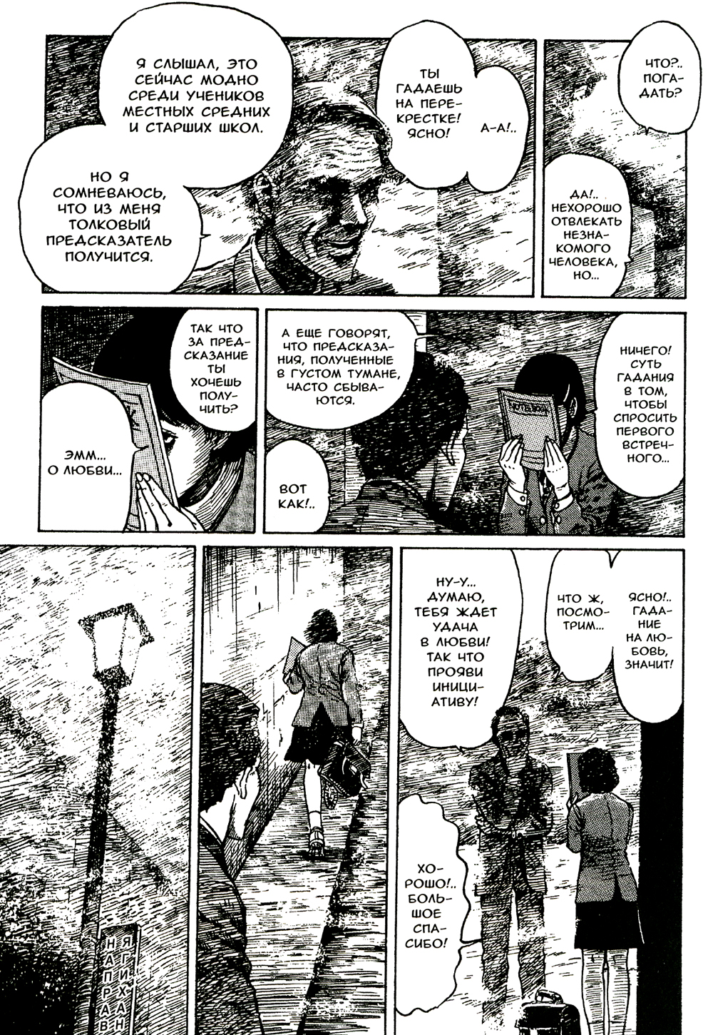 По городу бродит загадочный красавчик, который внезапно появляется перед гадающими на перекрестках девушками и рушит их самые сокровенные мечты жестокими предсказаниями. Все, кому не посчастливилось его повстречать, по непонятной причине кончают с собой самым жестоким образом. Окутанный густым туманом вечерний город пропитан запахом неминуемой смерти. Приобщитесь же к необычному безумию этой истории, сдобренному каплями свежей крови!