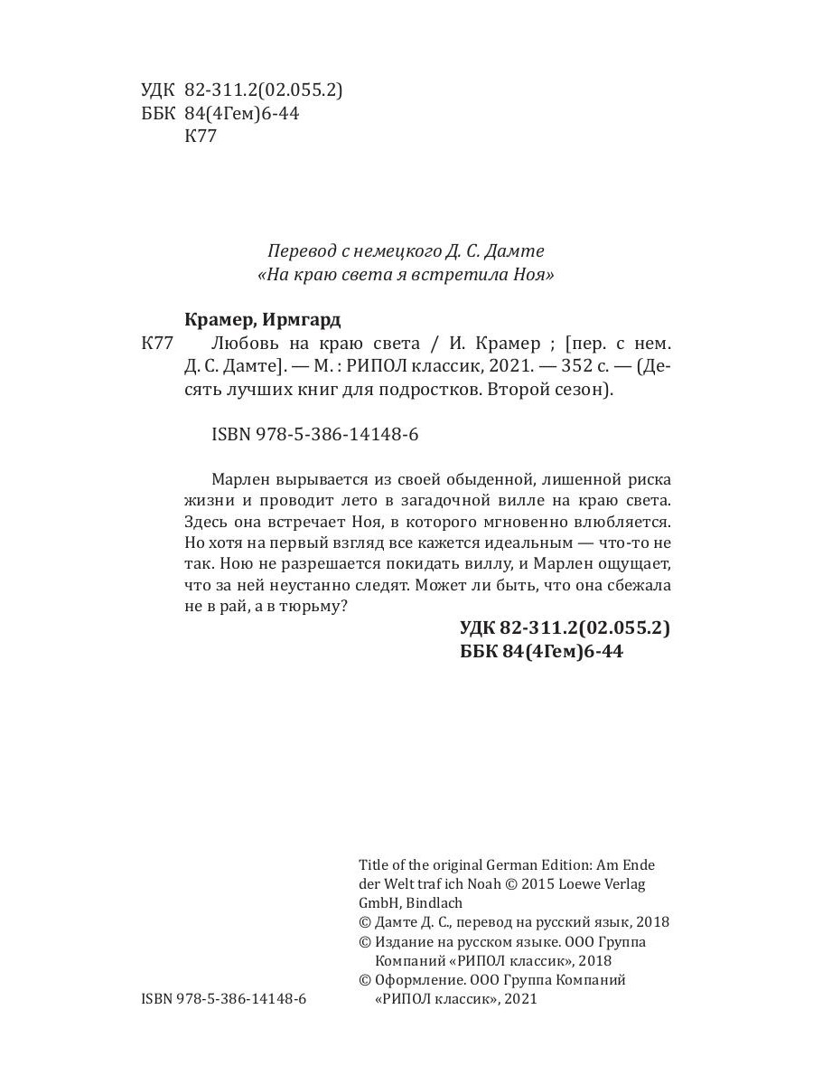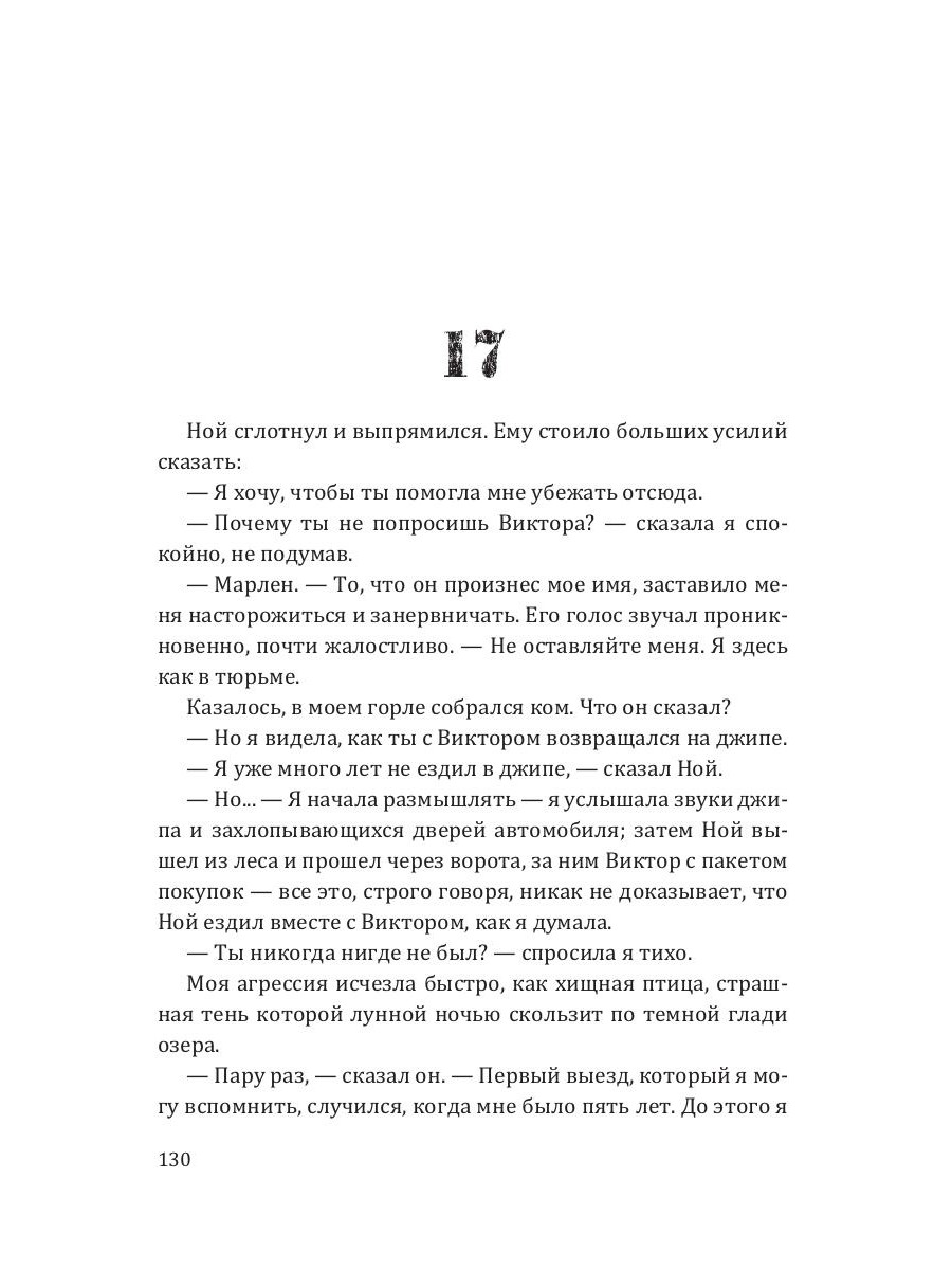 Марлен вырывается из своей обыденной, лишенной риска жизни и проводит лето в загадочной вилле на краю света. Здесь она встречает Ноя, в которого мгновенно влюбляется. Но хотя на первый взгляд все кажется идеальным - что-то не так. Ною не разрешается покидать виллу, и Марлен ощущает, что за ней неустанно следят. Может ли быть, что она сбежала не в рай, а в тюрьму?| Издательство | Рипол Классик |