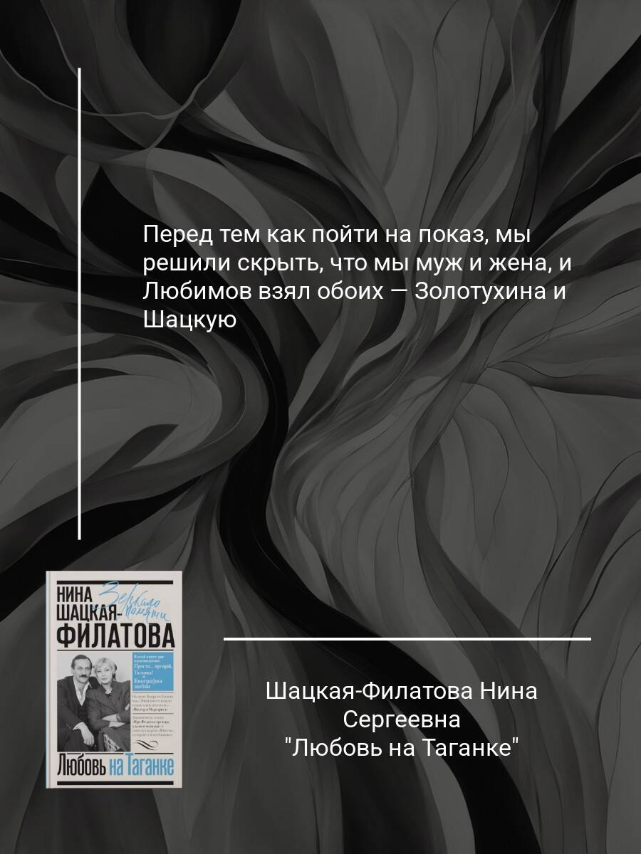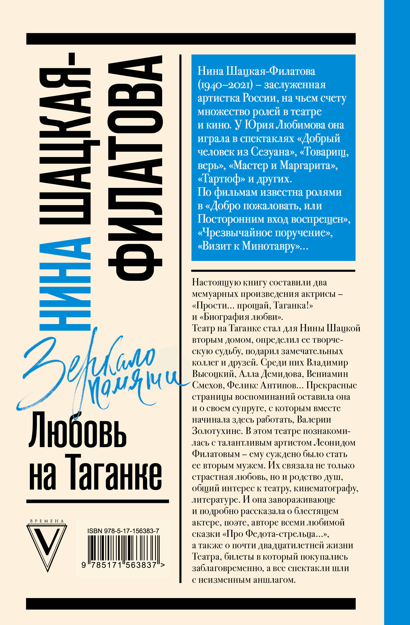 Нина Шацкая-Филатова (1940-2021) - заслуженная артистка России, на чьем счету множество ролей в театре и кино. У Юрия Любимова она играла в спектаклях "Добрый человек из Сезуана", "Товарищ, верь", "Мастер и Маргарита", "Тартюф" и других. По фильмам известна ролями в "Добро пожаловать, или Посторонним вход воспрещен", "Чрезвычайное поручение", "Визит к Минотавру"… Настоящую книгу составили два мемуарных произведения актрисы - "Прости… прощай, Таганка!" и "Биография любви". Театр на Таганке стал для Нины Шацкой вторым домом, определил ее творческую судьбу, подарил замечательных коллег и друзей. Среди них Владимир Высоцкий, Алла Демидова, Вениамин Смехов, Феликс Антипов… Прекрасные страницы воспоминаний оставила она и о своем супруге, с которым вместе начинала здесь работать, Валерии Золотухине. В этом театре познакомилась с талантливым артистом Леонидом Филатовым - ему суждено было стать ее вторым мужем. Их связала не только страстная любовь, но и родство душ, общий интерес к театру, кинематографу, литературе. И она завораживающе и подробно рассказала о блестящем актере, поэте, авторе всеми любимой сказки "Про Федота-стрельца…", а также о почти двадцатилетней жизни Театра, билеты в который покупались заблаговременно, а все спектакли шли с неизменным аншлагом.| Издательство | Издательство "АСТ" |