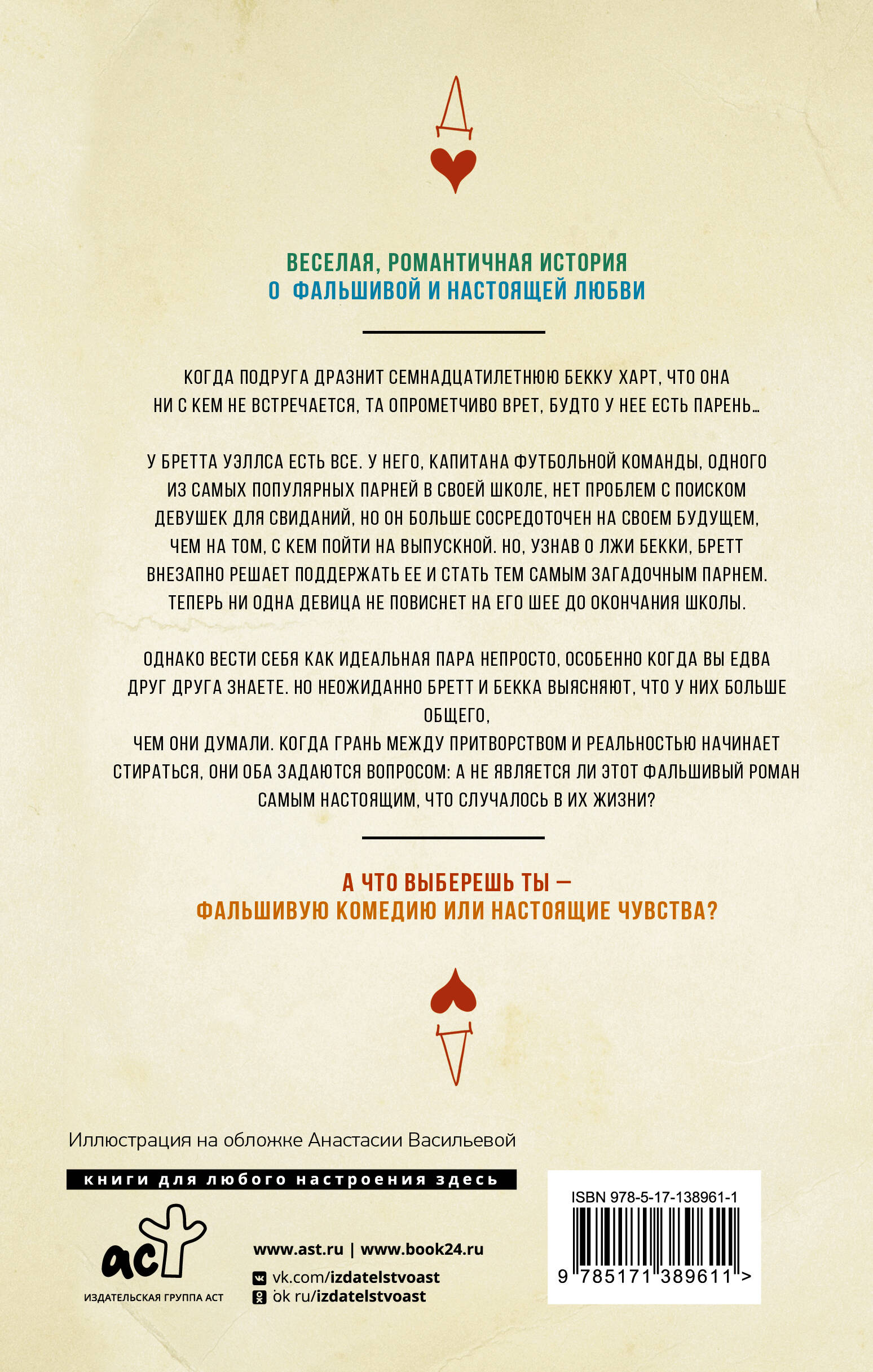 Когда подруга дразнит семнадцатилетнюю Бекку Харт, что она ни с кем не встречается, она опрометчиво врет, будто у нее есть парень… У Бретта Уэллса есть все. У него, капитана футбольной команды, одного из самых популярных парней в своей школе, нет проблем с поиском девушек для свиданий, но он больше сосредоточен на своем будущем, чем на том, с кем пойти на выпускной. Но, услышав ложь Бретт, он внезапно решает поддержать ее и стать тем самым загадочным парнем. Теперь ни одна девица не повиснет на его шее. Однако вести себя как идеальная пара непросто, особенно когда вы едва друг друга знаете. Но неожиданно они выясняют, что у них больше общего, чем они думали. Когда грань между притворством и реальностью начинает стираться, Бретт и Бекка задаются вопросом: а не является ли этот фальшивый роман самой настоящей вещью в их жизни?| Издательство | ИЗДАТЕЛЬСТВО "АСТ" |