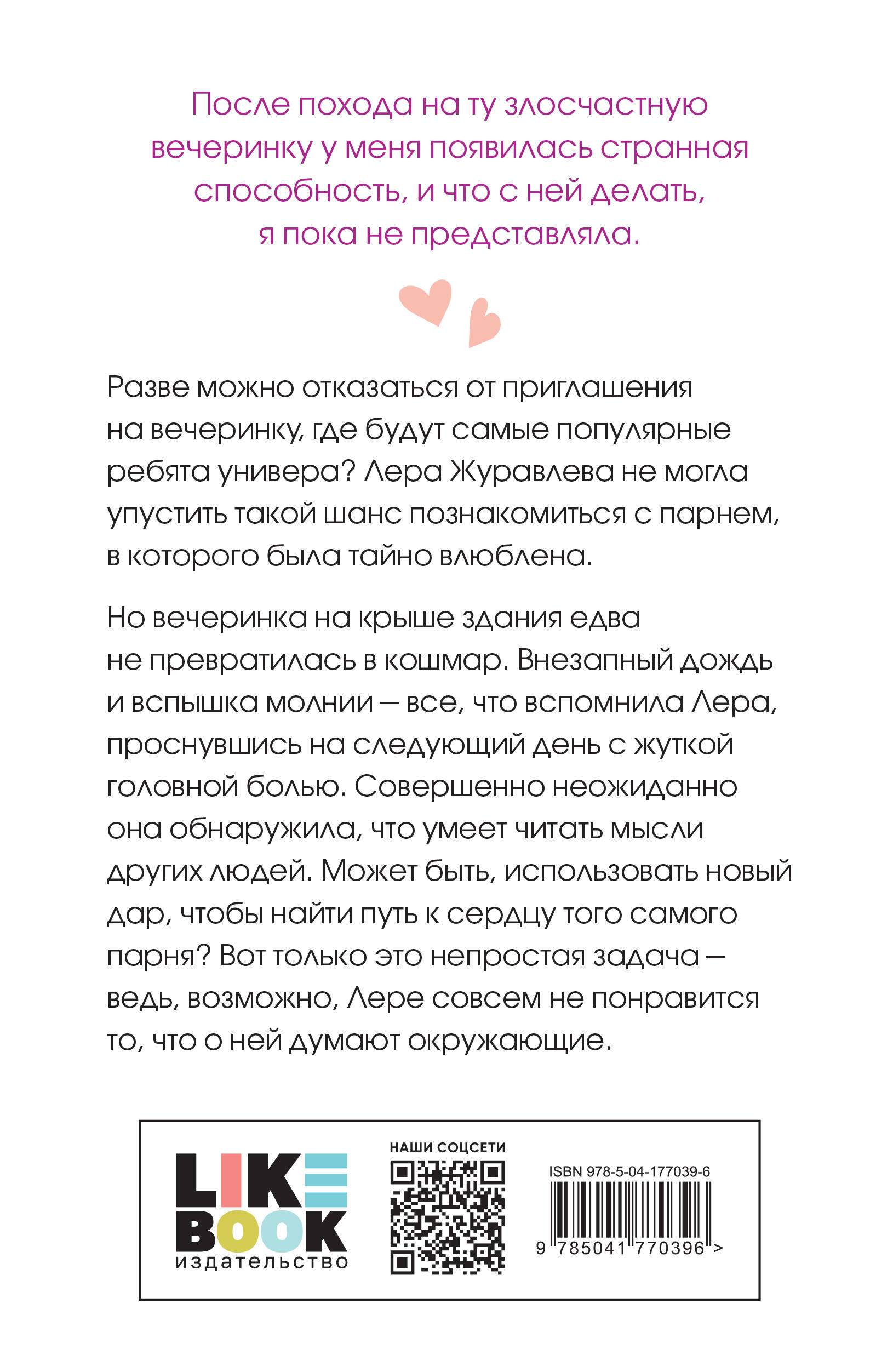 Популярный роман Аси Лавринович теперь в удобном формате покета! Разве можно отказаться от приглашения на вечеринку, где будут самые популярные ребята универа? Лера Журавлева не могла упустить такой шанс познакомиться с парнем, в которого была тайно влюблена. Но вечеринка на крыше здания едва не превратилась в кошмар. Внезапный дождь и вспышка молнии - все, что вспомнила Лера, проснувшись на следующий день с жуткой головной болью. Совершенно неожиданно она обнаружила, что умеет читать мысли других людей. Может быть, использовать новый дар, чтобы найти путь к сердцу того самого парня? Вот только это непростая задача - ведь, возможно, Лере совсем не понравится то, что о ней думают окружающие. Ася Лавринович - один из самых популярных молодежных авторов. Суммарный тираж ее книг составляет более 300 000 экземпляров.| Издательство | ООО "Издательство "Эксмо" |