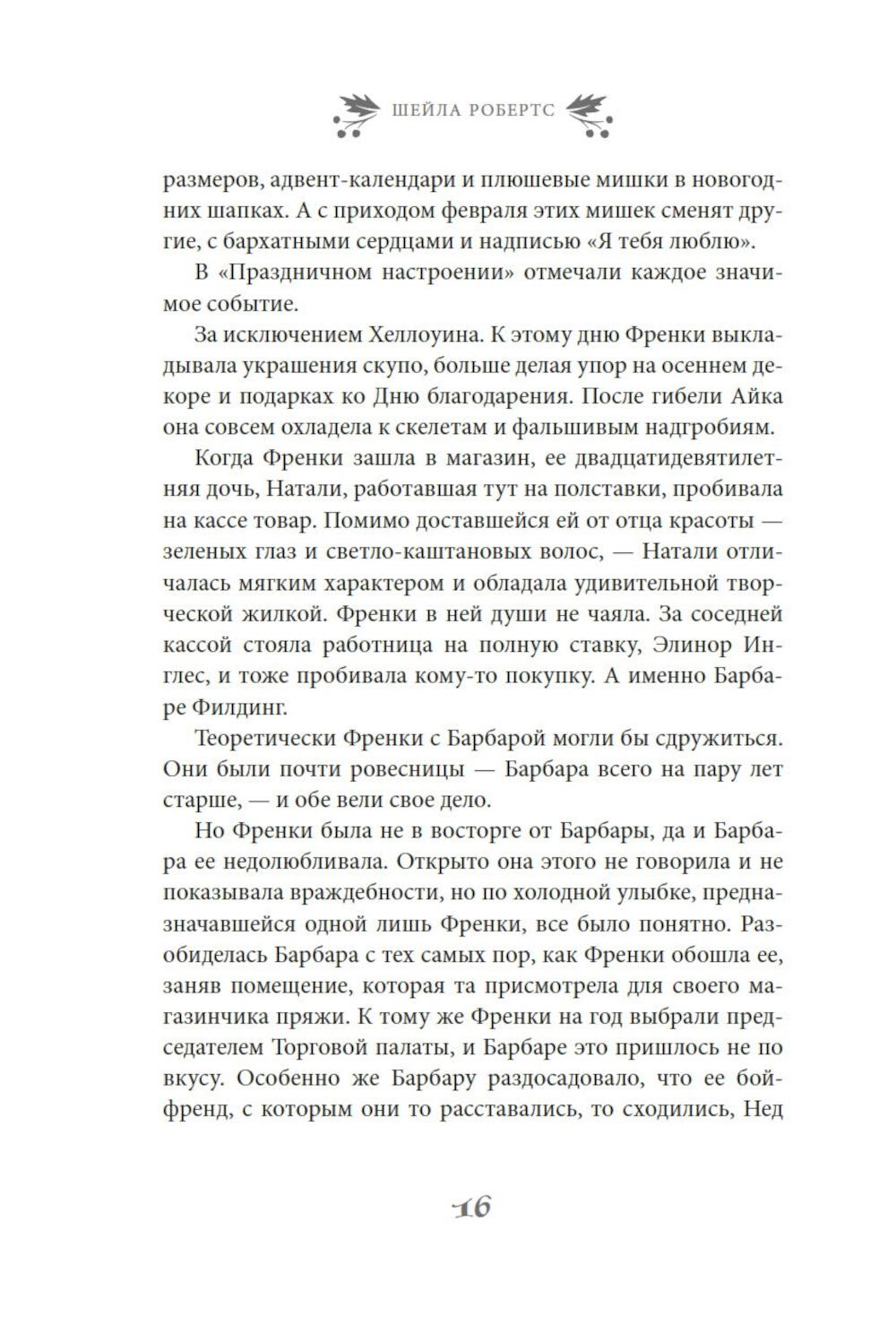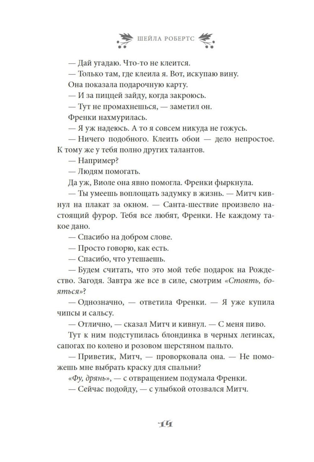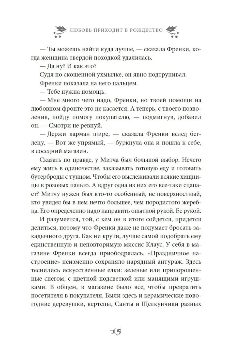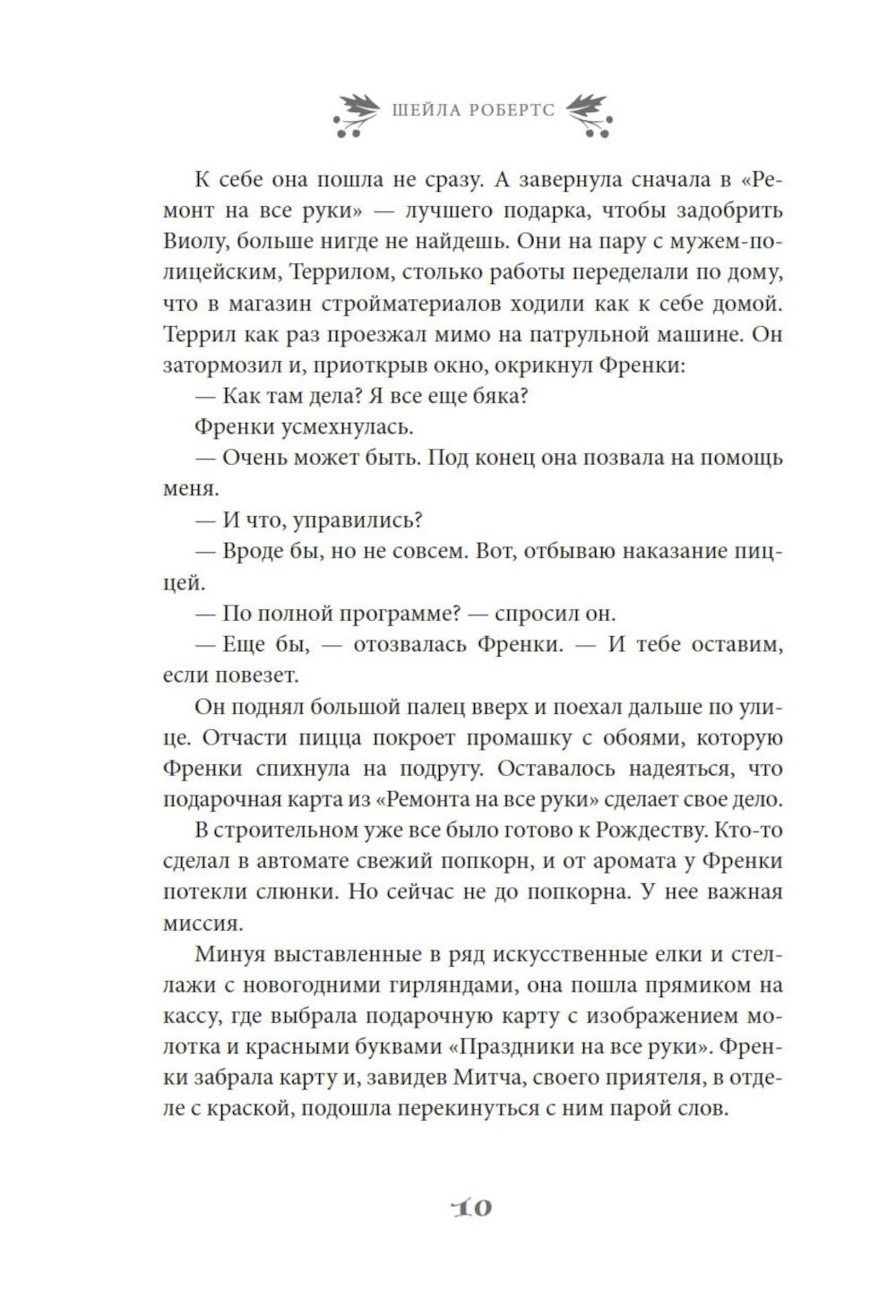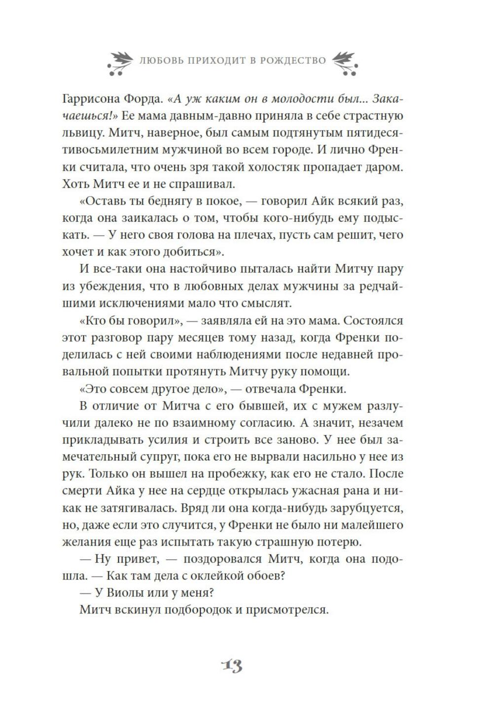 Найдется ли фраза прекраснее и романтичнее чем «и жили они долго и счастливо»? Френки Лейн, владелица магазинчика «Праздничное настроение» с уверенностью ответит, что нет. Разве только «и жили они долго и счастливо благодаря Френки Лейн». Ведь Френки знает, что лучше практически для всех ее родных и друзей. К примеру, она считает, что ее сестра Стеф еще слишком молода, чтобы отказываться от любви. Дочь Френки Натали непременно должна открыть свою кондитерскую лавку. А застенчивой Элинор нужно сменить образ. Фрэнки уверена, что могла бы помочь им всем, если бы они только позволили ей - и если бы вся ее помощь не закончилась катастрофой. А еще есть Митч Ховард - самый прекрасный мужчина на свете: спокойный, мудрый и добросердечный, - и по совместительству - лучший друг Френки. Конечно, Митчу нужна дама сердца. И Френки полна решимости найти ему эту женщину, хочет он того или нет. Но, как известно, любовь приходит в Рождество. Очаровательная рождественская история в духе «Эммы» Джейн Остин, которая искрится теплом, остроумием и счастьем.| Издательство | Азбука |