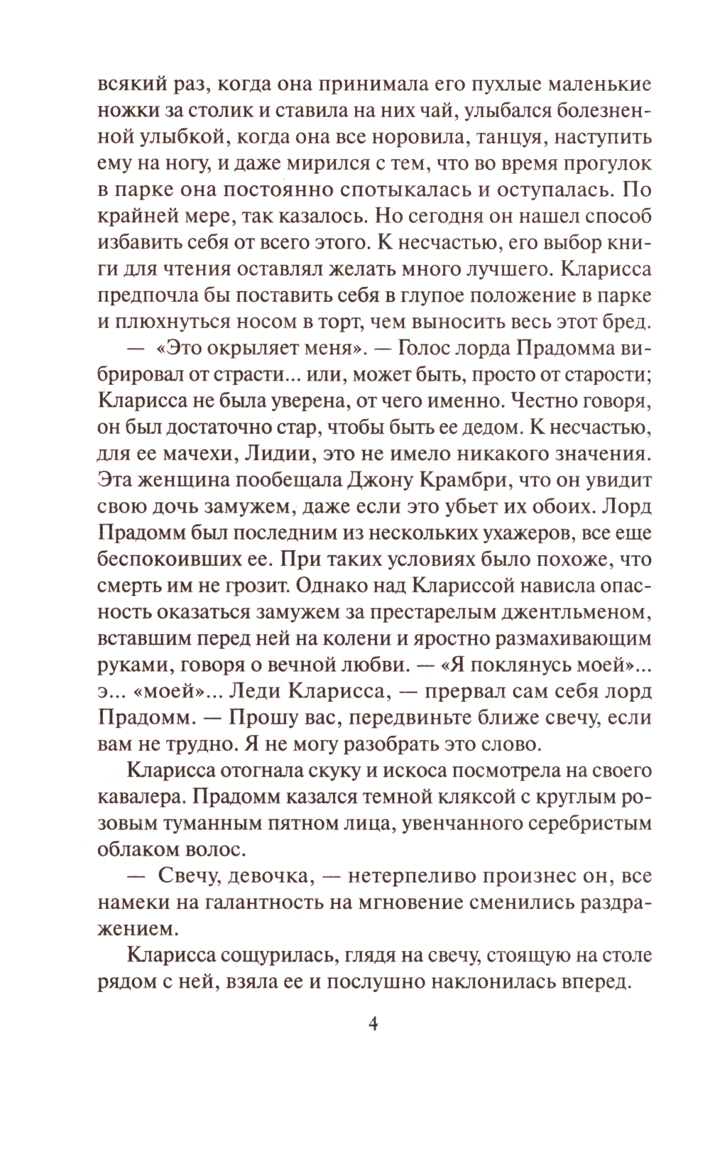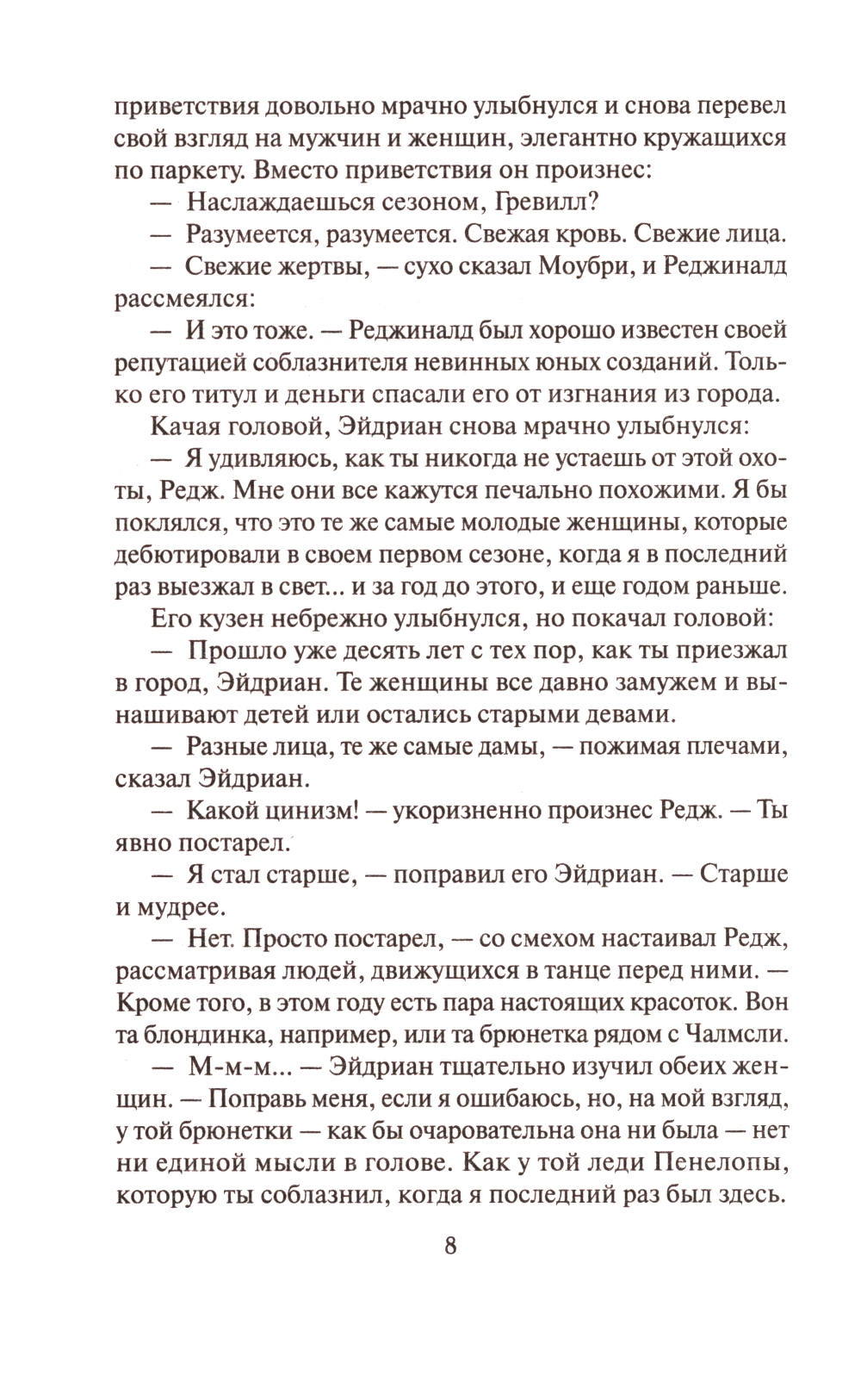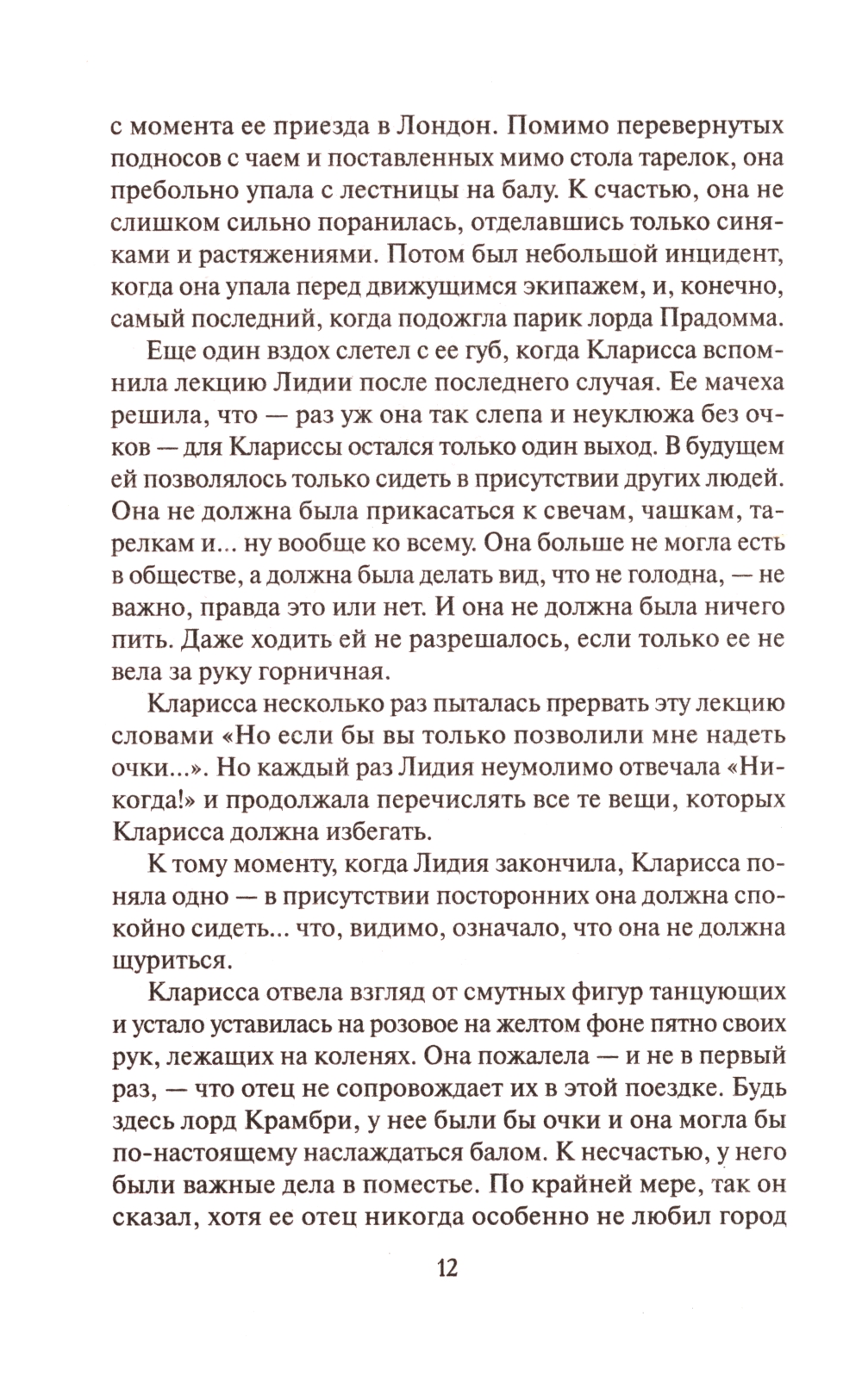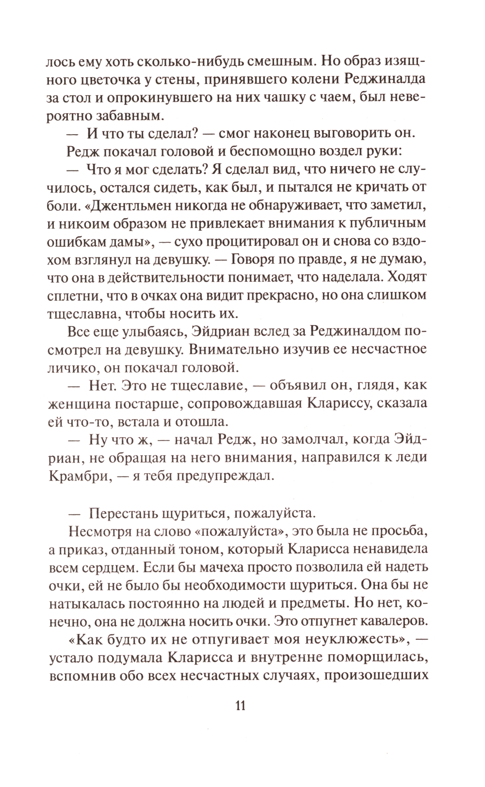 Эйдриан Монтфорт, граф Моубри, жил затворником десять лет, с тех пор как вернулся с войны, - и всему виной шрам, изуродовавший его лицо. Но графу нужен наследник - он все-таки решился выйти в свет с целью найти жену и на первом же балу повстречал юную Клариссу Камбри. Эйдриан влюбился с первого взгляда - да и Кларисса, кажется, отвечает ему взаимностью. Свадьбу сыграли поспешно и скромно. Супруги без ума друг от друга... Только вот леди практически слепа и без очков, которые у нее во время сезона отняла мачеха, не видит ничего... Не изменится ли ее отношение к нему, когда она снова обретет очки и сможет ясно его разглядеть? И не решит ли она, что он просто воспользовался ее слепотой, чтобы жениться?| Издательство | АСТ |