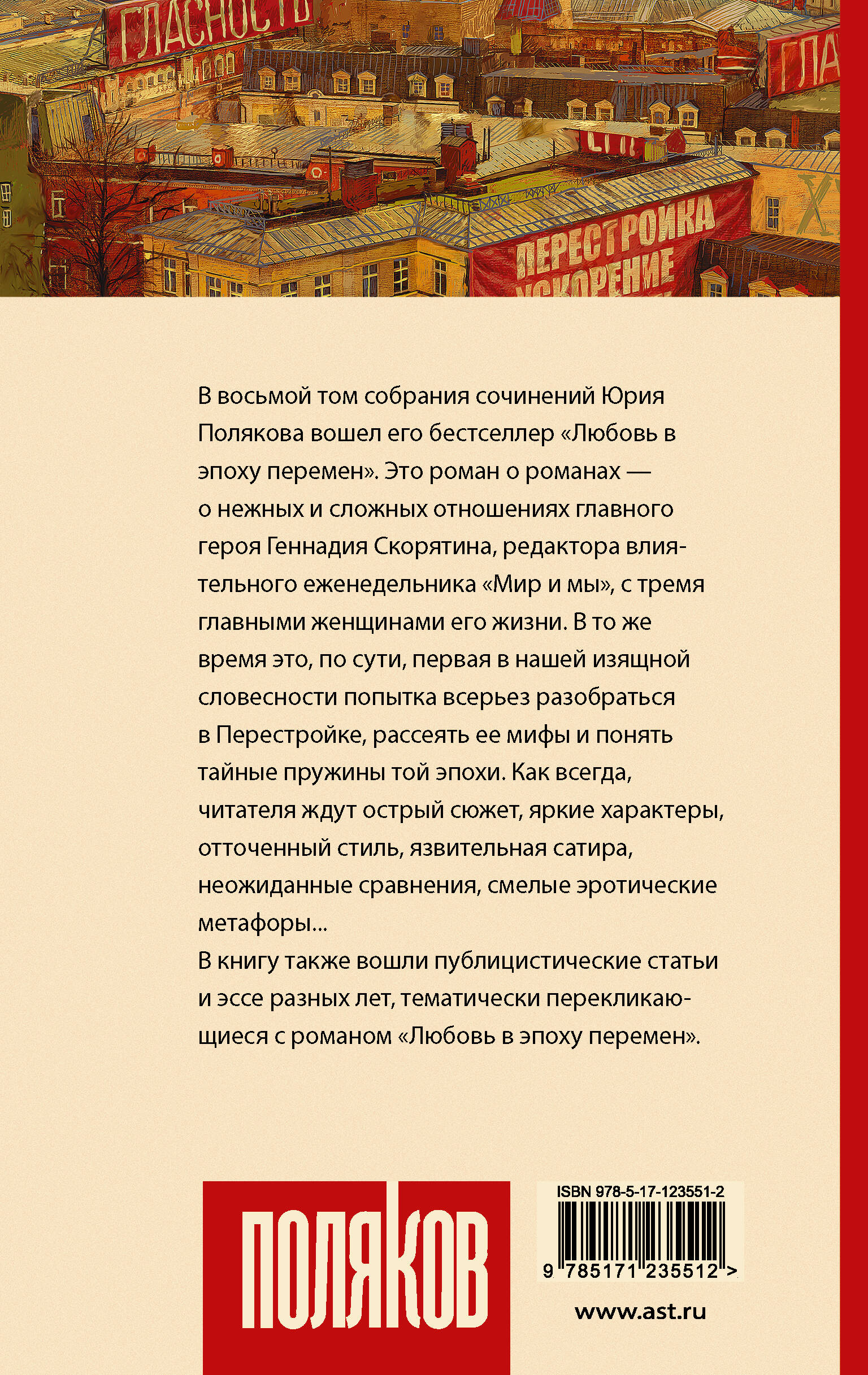 В восьмой том собрания сочинений Юрия Полякова вошел его бестселлер "Любовь в эпоху перемен". Это роман о романах - о нежных и сложных отношениях главного героя Геннадия Скорятина, редактора влиятельного еженедельника "Мир и мы", с тремя главными женщинами его жизни. В то же время это, по сути, первая в нашей изящной словесности попытка всерьез разобраться в перестройке, рассеять ее мифы и понять тайные пружины той эпохи. Как всегда, читателя ждут острый сюжет, яркие характеры, отточенный стиль, язвительная сатира, неожиданные сравнения, смелые эротические метафоры... В книгу также вошли публицистические статьи и эссе разных лет, тематически перекликающиеся с романом "Любовь в эпоху перемен".