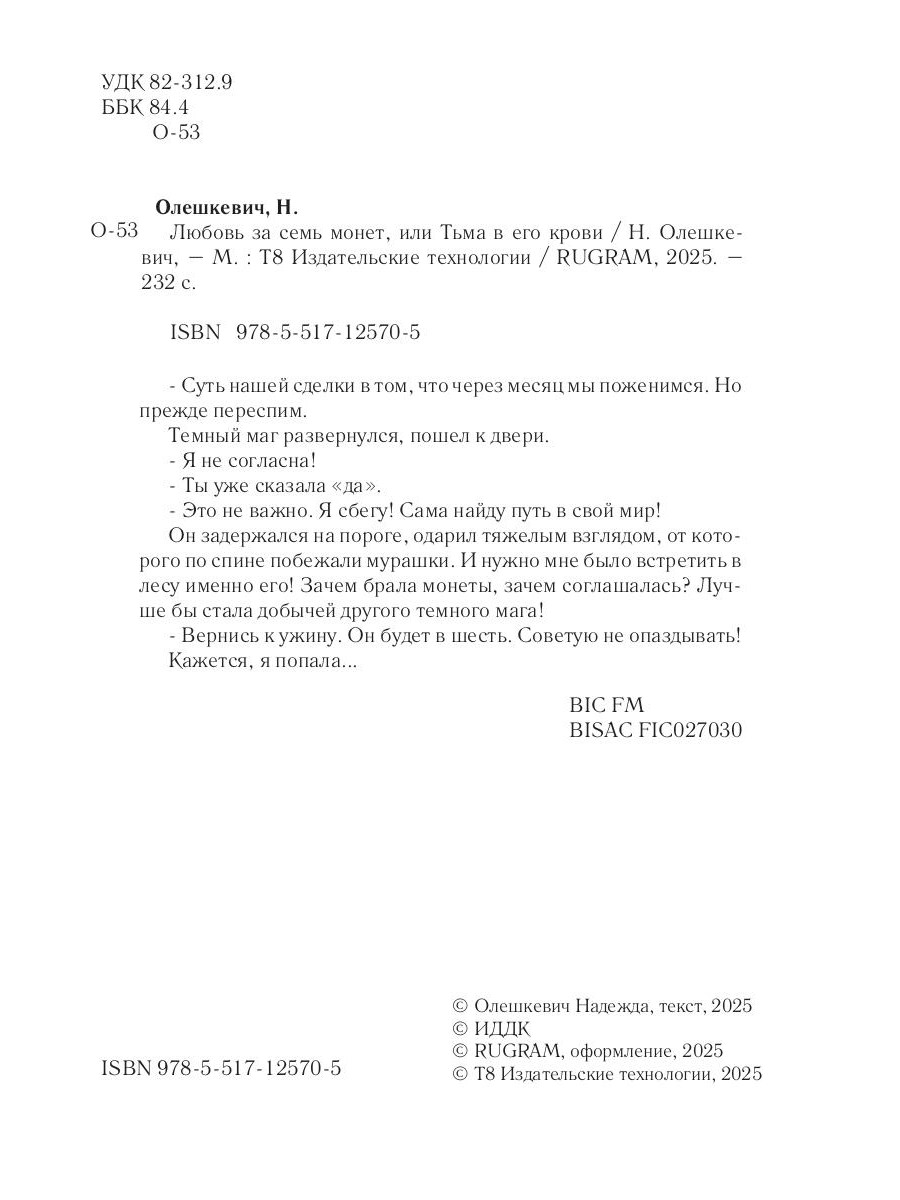 - Суть нашей сделки в том, что через месяц мы поженимся. Но прежде переспим. Темный маг развернулся, пошел к двери. - Я не согласна! - Ты уже сказала «да». - Это не важно. Я сбегу! Сама найду путь в свой мир! Он задержался на пороге, одарил тяжелым взглядом, от которого по спине побежали мурашки. И нужно мне было встретить в лесу именно его! Зачем брала монеты, зачем соглашалась? Лучше бы стала добычей другого темного мага! - Вернись к ужину. Он будет в шесть. Советую не опаздывать! Кажется, я попала…| Издательство | Т8 RUGRAM |