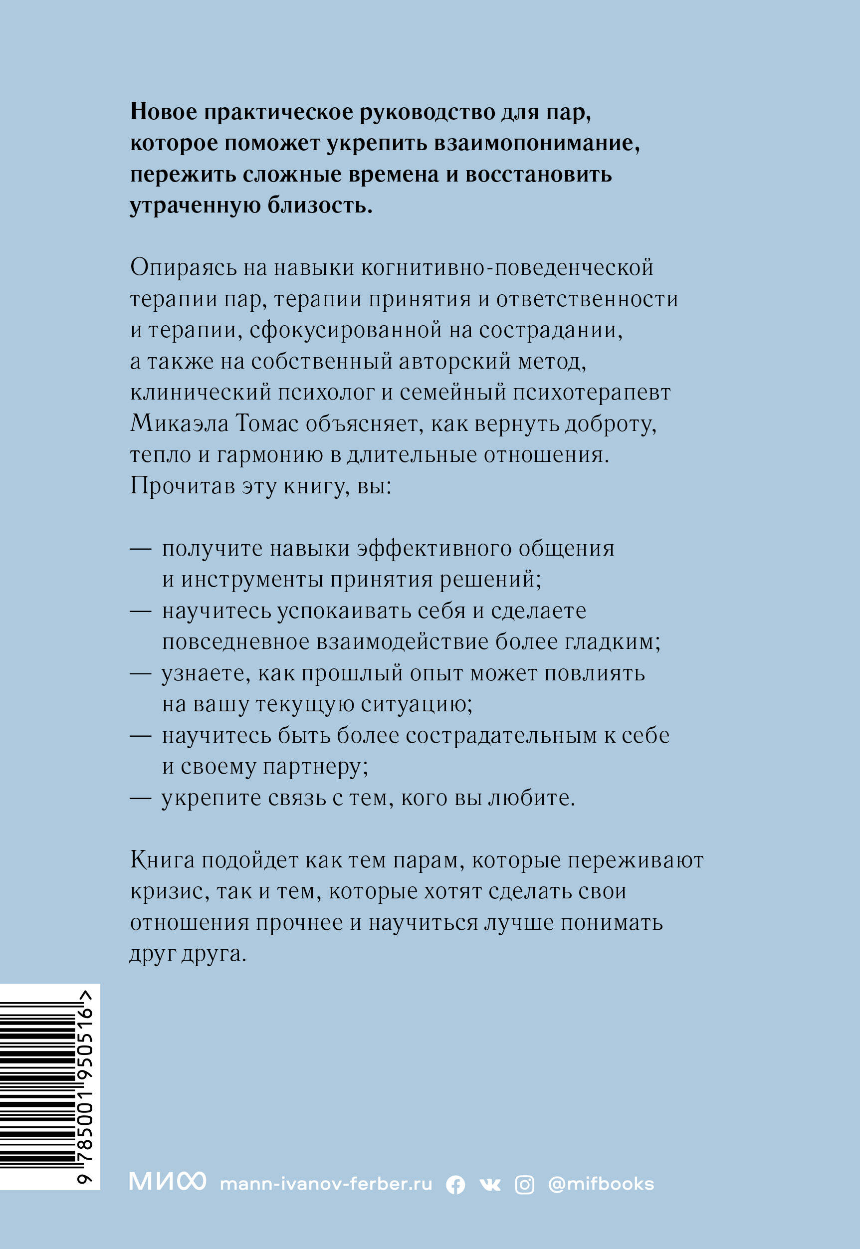 Книга об исследованиях в области романтических отношений, осознанности, нейробиологии и позитивной психологии. Включает в себя навыки из трех научно обоснованных видов психотерапии, а также примеры из практики и личной жизни автора. Разногласия в отношениях нормальны. Реальные проблемы возникают тогда, когда при малейших трудностях и неудачах мы начинаем обвинять друг друга, критиковать, набрасываться на партнера. Клинический психолог и семейный психотерапевт Микаэла Томас объясняет, как вернуть в отношения доброту, тепло и гармонию. Вы поймете, как создать прочную основу для ваших отношений. Научитесь успокаивать себя и партнера. Узнаете, как прошлый опыт может повлиять на текущую ситуацию. Научитесь быть более сострадательным к себе и своему партнеру. Укрепите связь с тем, кого любите. Вы узнаете, что значит прощать (и что не относится к прощению) и как использовать навыки осознанности и сопереживания для развития глубокой эмоциональной и физической близости с партнером. Фишки книги: В книге объединены исследования в области романтических отношений, осознанности, нейробиологии и позитивной психологии с навыками из трех научно обоснованных видов психотерапии: поведенческой терапии для пар, терапии сострадания и терапии принятия и ответственности. Автор приводит примеры из практики и личной жизни. О сострадании как основе для формирования длительной связи и чувства глубокого единения. Для кого эта книга: Для тех, кто хотел бы сохранить и укрепить близость с партнером. Для тех, кто хочет вернуть утраченную связь, пока еще есть надежда. Для тех, в чьих отношениях уже невозможно восстановить близость, и вы ищете способ закончить их мирно, с сопереживанием друг другу. Для тех, чьи отношения закончились, и вы хотите понять почему. Для тех, кто ищет родственную душу и хочет построить крепкие отношения. От автора: Зачастую пары приходят ко мне после многих лет страданий, когда они уже слишком измучены, чтобы восстанавливать отношения. Они слишком долго тянули, прежде чем обратиться за помощью. Однако старые привычки в отношениях можно изменить, можно найти новых партнеров, можно перепрограммировать мозг, но нужно дать себе и вашим отношениям шанс измениться. Эта книга - попытка сбалансировать теорию и практику романтических отношений, чтобы вы получили не только полезную информацию, но и знали, какие практические шаги следует предпринять. Это не исчерпывающее руководство по любовным отношениям, но если вы заинтересованы в глубокой близости с партнером, то она для вас.| Издательство | МАНН, ИВАНОВ И ФЕРБЕР ООО |